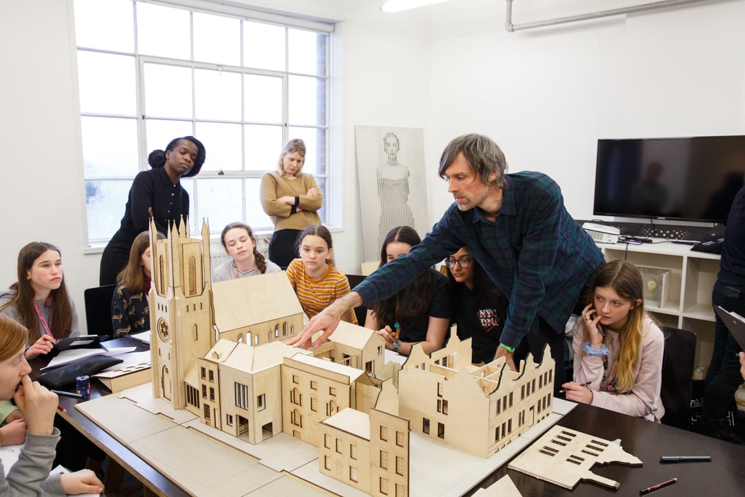Haworth Tompkins have hosted a workshop run by the Camden Highline Education Programme, in conjunction with Urban Learners. Associate Patrick Quinn taught the Year 8 and 9 students, from Parliament Hill School, how we use different types of drawings throughout the design and construction of a project. The activity that followed looked at short directed studies of our Pembroke College model, using a mixture of continuous line drawings, not looking at the page whilst drawing and mapping, and elevation studies. Picture by Luke O'Donovan