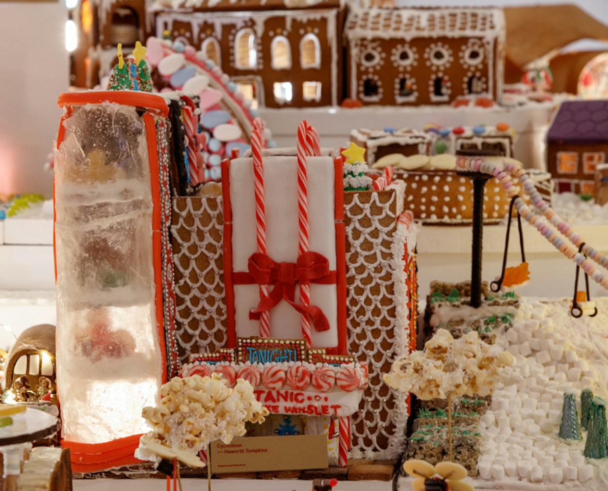 Haworth Tompkins' CyclOdeon is part of Gingerbread City, the Museum of Architecture exhibition at Somerset House looking at the future of transport. Our cinema aims to revive the drive-in by introducing sustainable transport methods. The CyclOdeon is designed to be accessible by bicycle, with the inclusion of a large ramp that leads to an open-air rooftop cinema. We're currently showing Titanic starring Cake Winslet and Leonardo DiCookiedough. The exhibition is open now until 5 January.