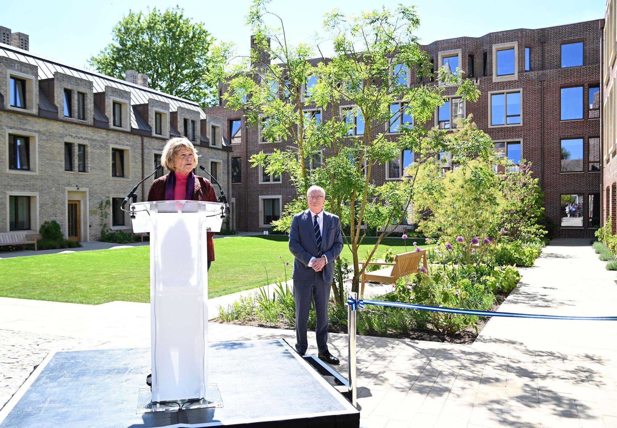 Haworth Tompkins was delighted to attend an opening event last weekend in celebration of Pembroke College’s transformative Mill Lane development, marking the culmination of a nine-year journey in collaboration with the College. As architects for this significant project, we are incredibly proud to have led the design and to have played a part in shaping the College’s diverse new facilities. It was fantastic to see the landscaping in bloom and the HT designed spaces being used for performances, exhibitions and talks, demonstrating the flexibility and versatility of the new and refurbished spaces.