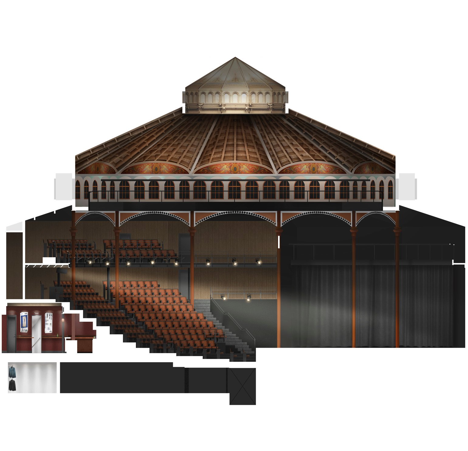 Our project for Malmö Stadsteater has started on site. The refurbishment of the 19th century Swedish theatre, originally designed as a circus amphitheatre, includes reconnecting the auditorium to the street by the creation of a new link building that part covers an existing courtyard, providing an informal events space. Alongside the redevelopment of the front of house and café, the project also involves a full refurbishment of the auditorium, increasing capacity to 520 using an adaptable layout, making it more suitable to host the theatre’s expanding repertoire. The material aesthetic is durable and expressive of each material’s natural characteristics with fixings and construction details exposed ‘on-show’ as much as possible. Materials include reclaimed cotton from denim clothing reprocessed as acoustic felt, refurbished ‘as found’ concrete floor surfaces, Swedish pine plywood joinery, visible fir timber floor joists, recycled rubber sheet flooring and restored brickwork. Our delivery partners in Malmö, White Arkitekter, is overseeing the works which will continue throughout 2022. The theatre is planned to reopen in 2023.