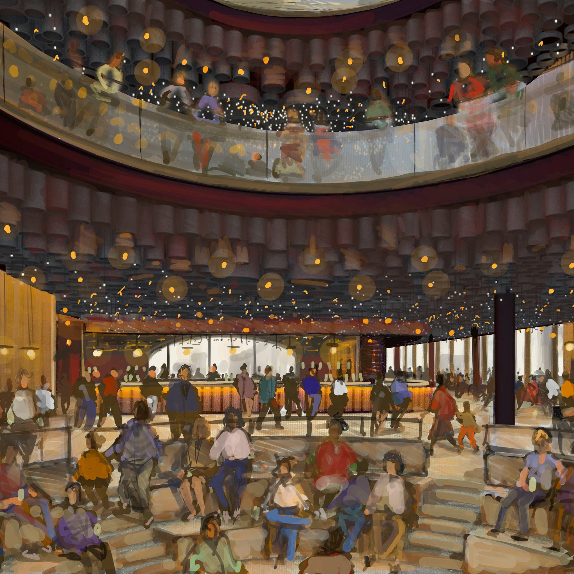 Haworth Tompkins are designing the interior fit-out of the new 1575-seat theatre in west London for Trafalgar Entertainment Group at Olympia. The proposals include extensive foyer spaces spread across 7 floor levels, bars and back-of-house areas housed within the Heatherwick Studio and SPPARC designed multi-level building. The theatre is part of the £1.3 billion regeneration of Olympia as a world-leading cultural destination and is set to open in 2024.