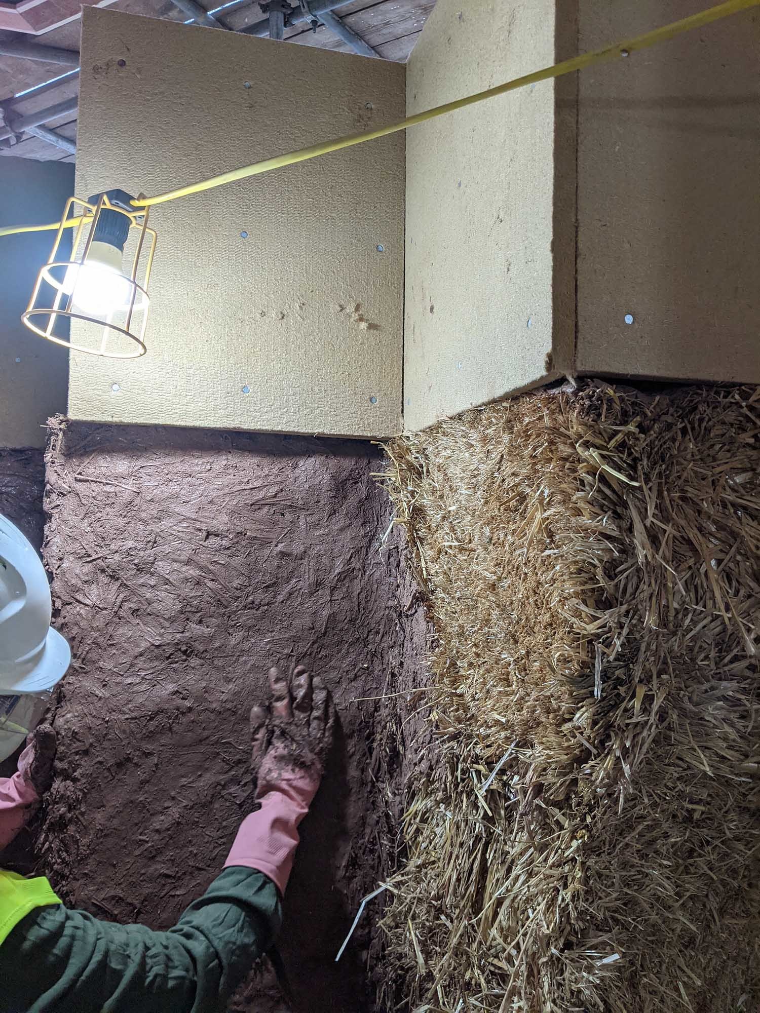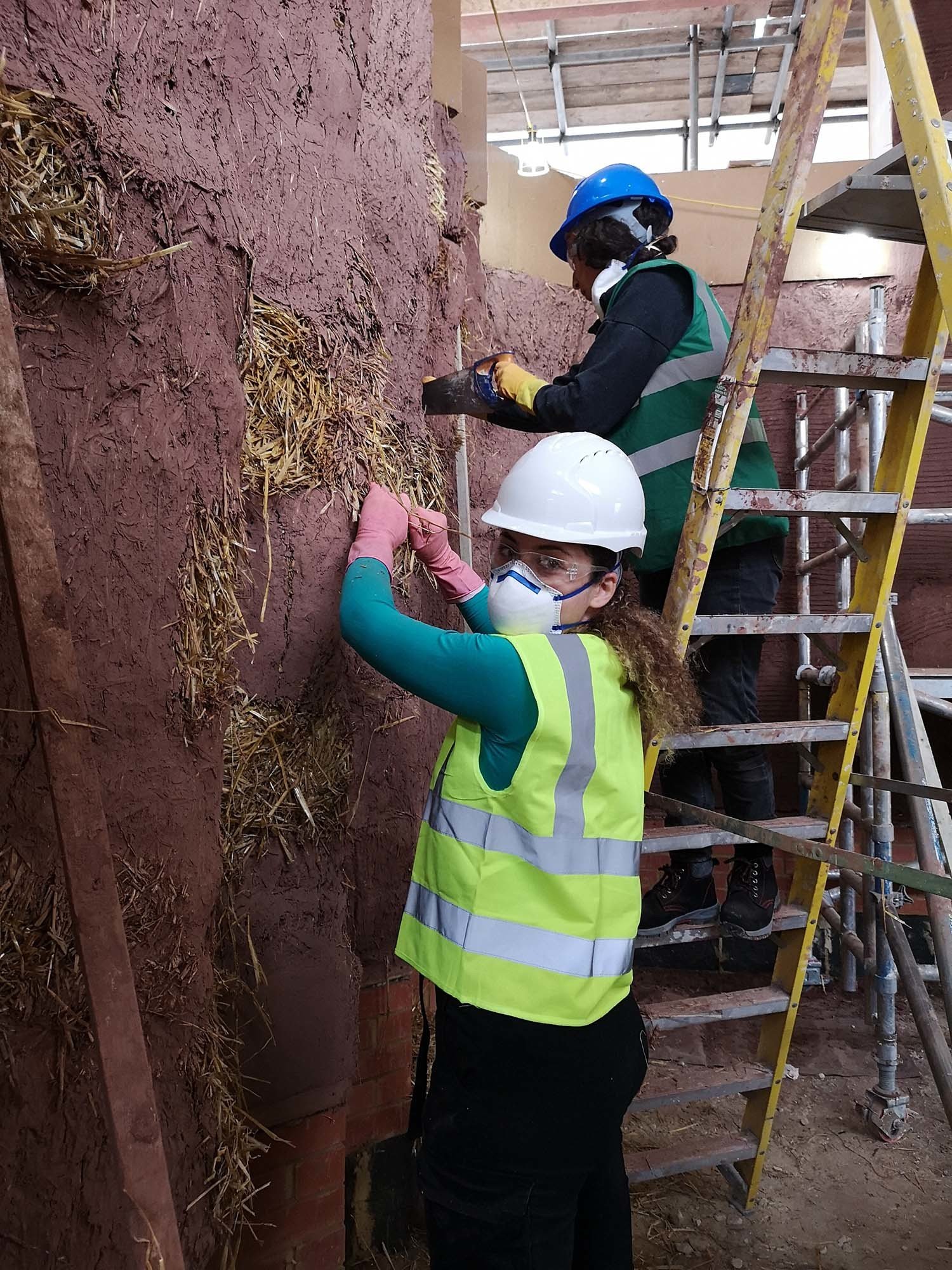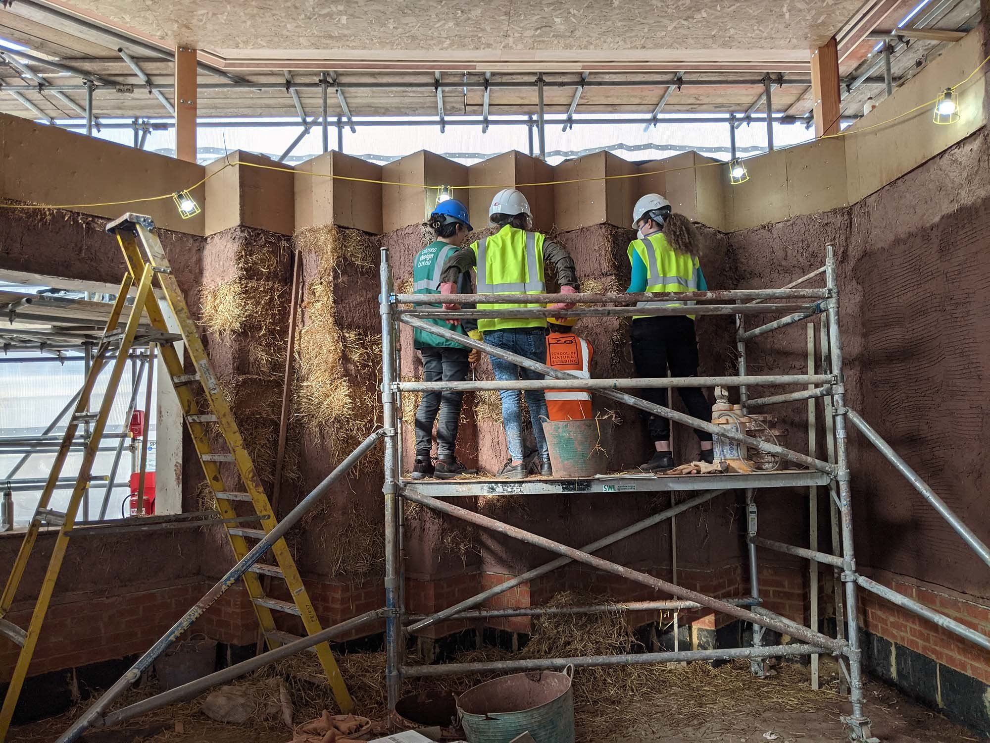 Alex, Diana and Irika experienced first hand the use of straw bales and clay render, both low embodied carbon materials, which inspired them to think about where they can adopt similar approaches within the studio.