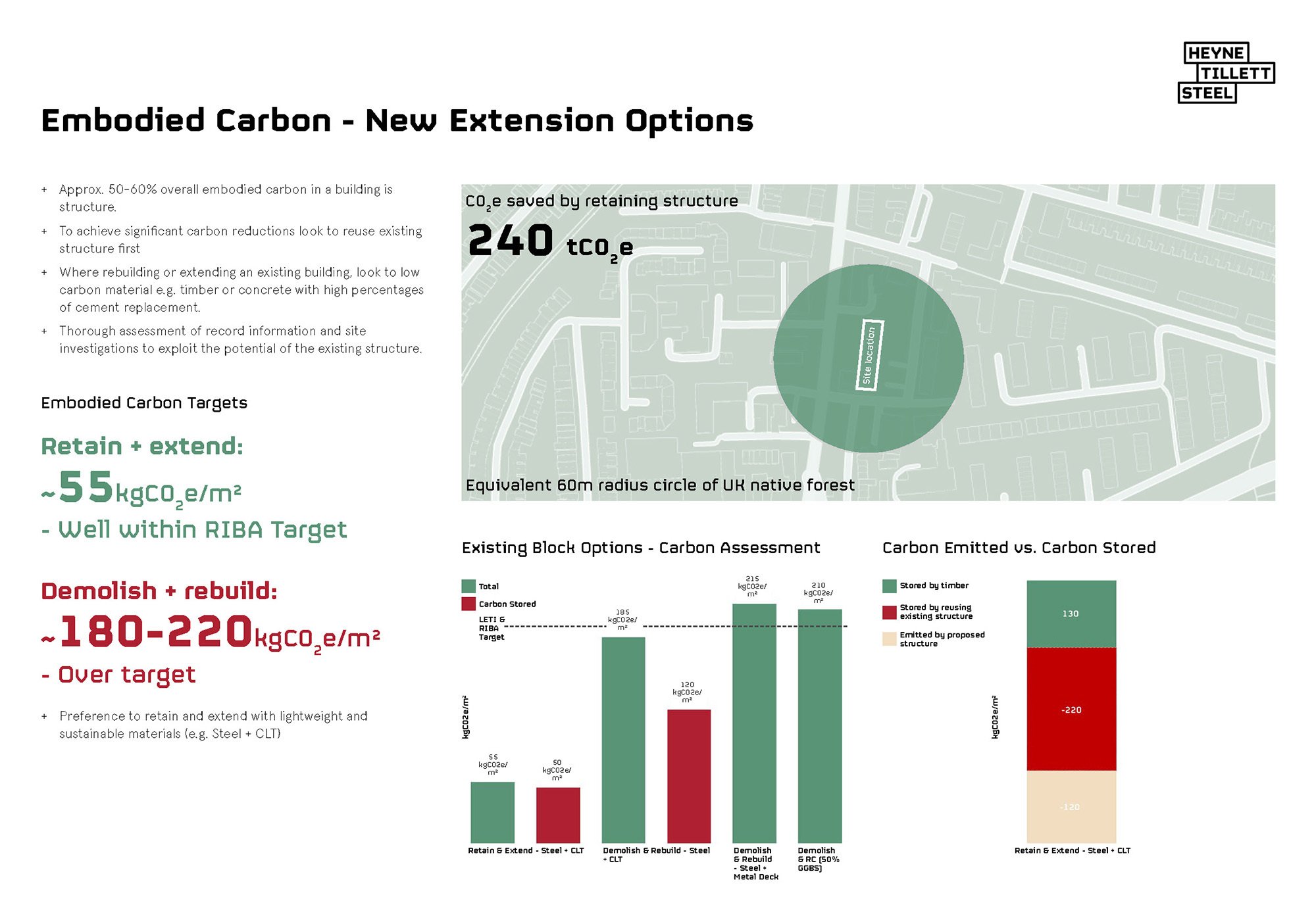 Recently we worked with our structural engineers, Heyne Tillett Steel, to assess and compare the carbon emissions between two options: retain, refurbish and extend vs demolish and rebuild in one of our projects for a London local authority.