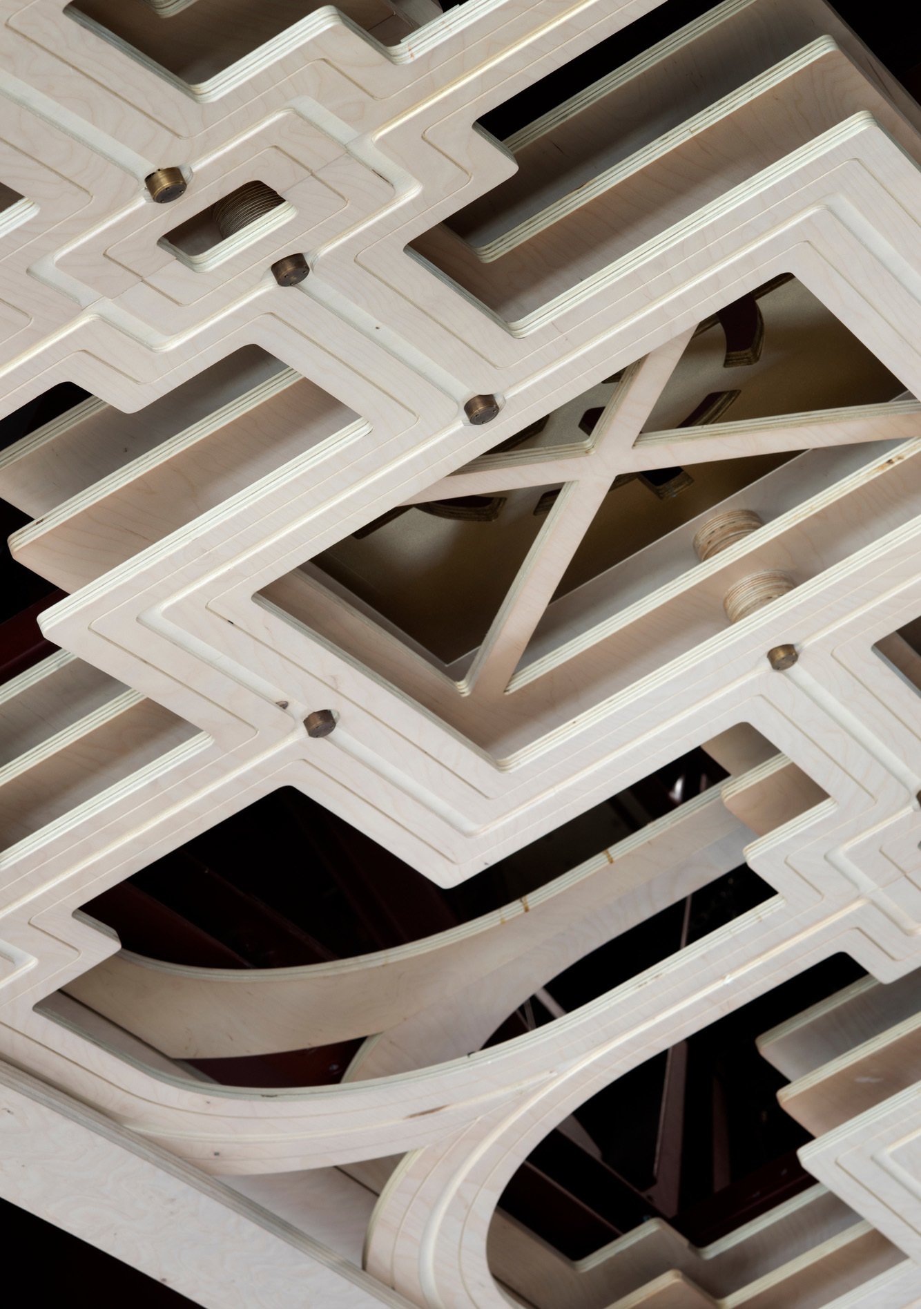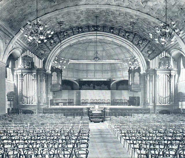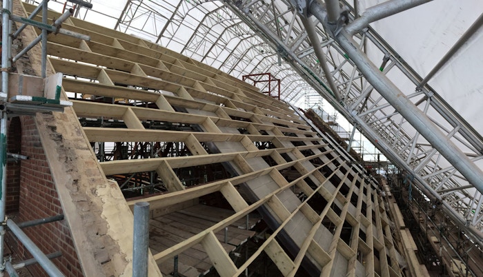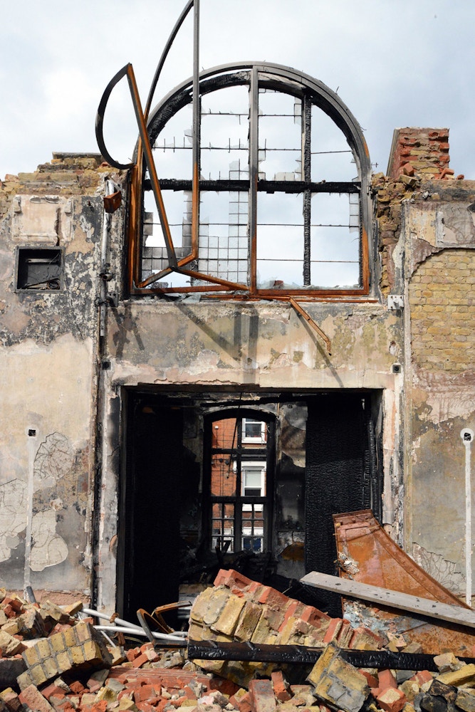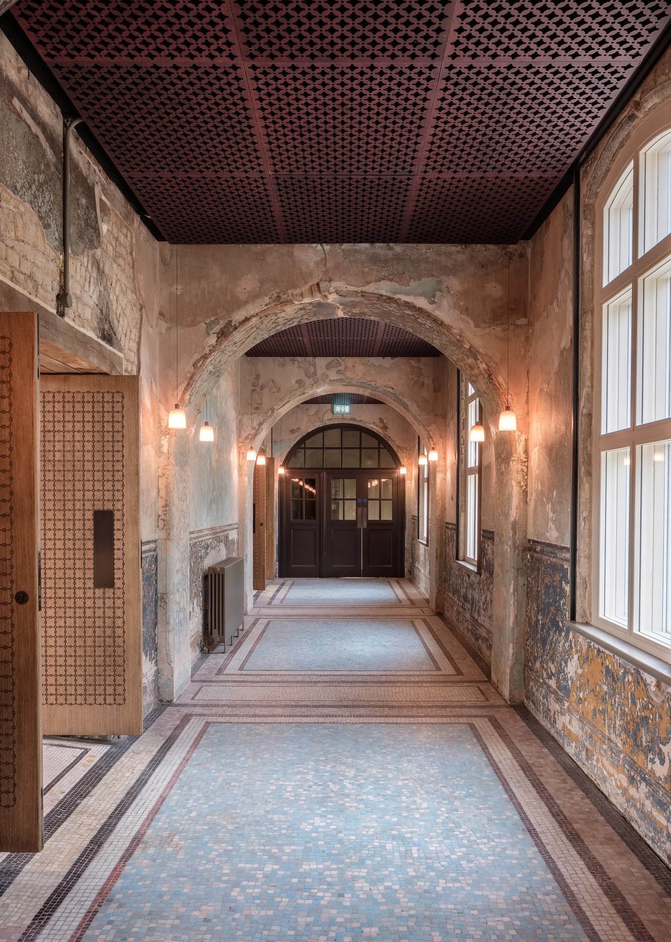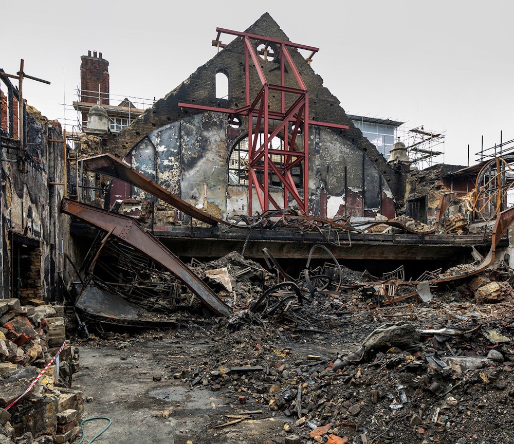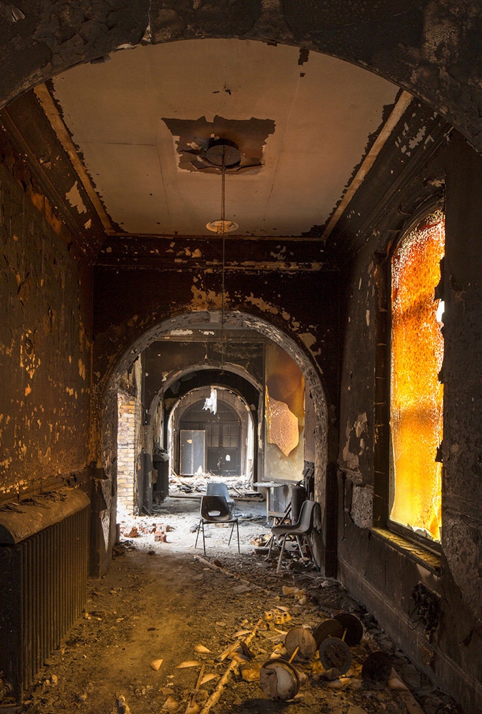 Haworth Tompkins took the former decorative plaster vault as a starting point for a new, timber grid ceiling, allowing far greater theatrical possibility and a much clearer acoustic. The surface of the walls of the hall and its surrounding corridors have been preserved in their extraordinary, almost Pompeiian post-fire richness and complexity.