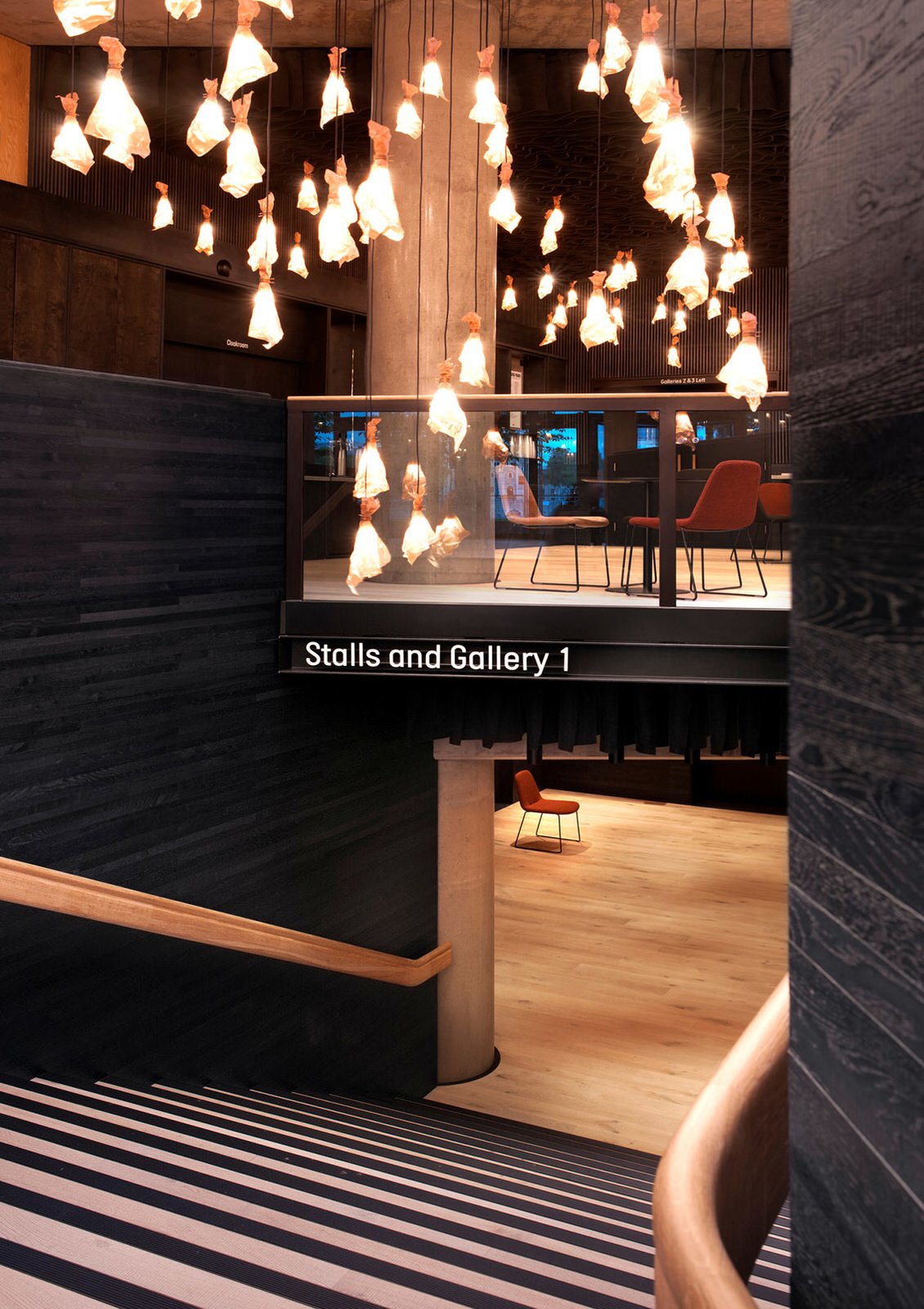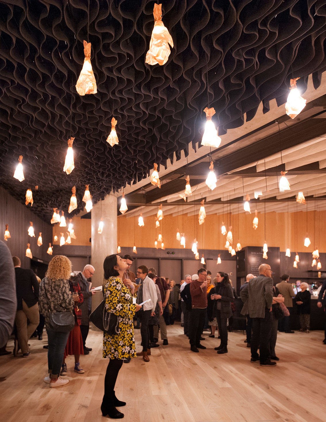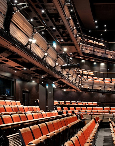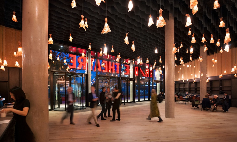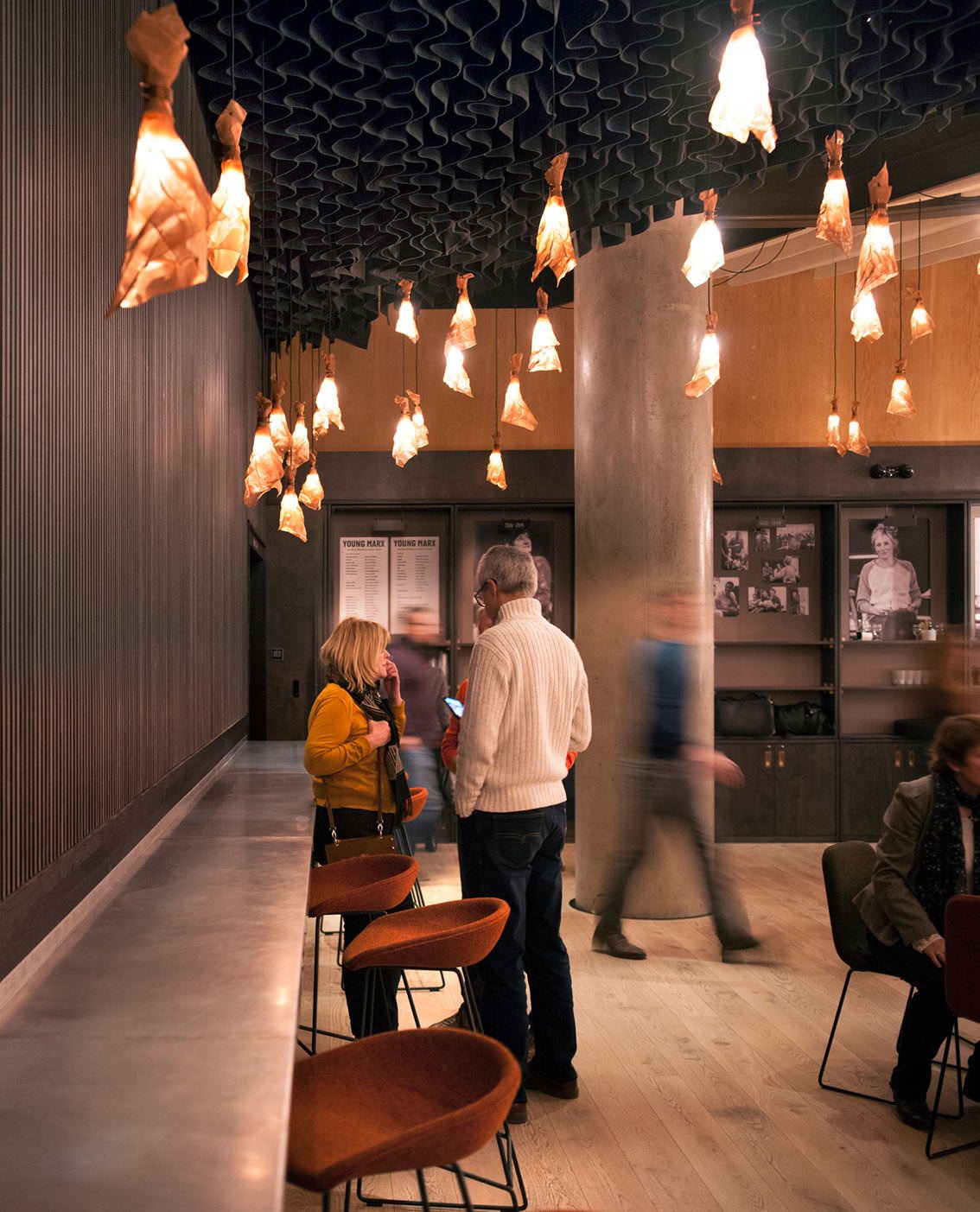 Served by a single long bar and lit by 500 bespoke copper light fittings (designed by Haworth Tompkins) the foyer functions as a friendly public congregation space throughout the day and evening. Acoustics are controlled by the use of canvas and felt ceiling banners, allowing good speech intelligibility even with a full audience.