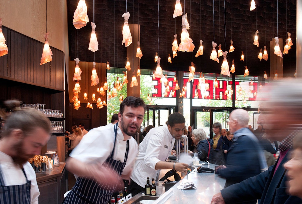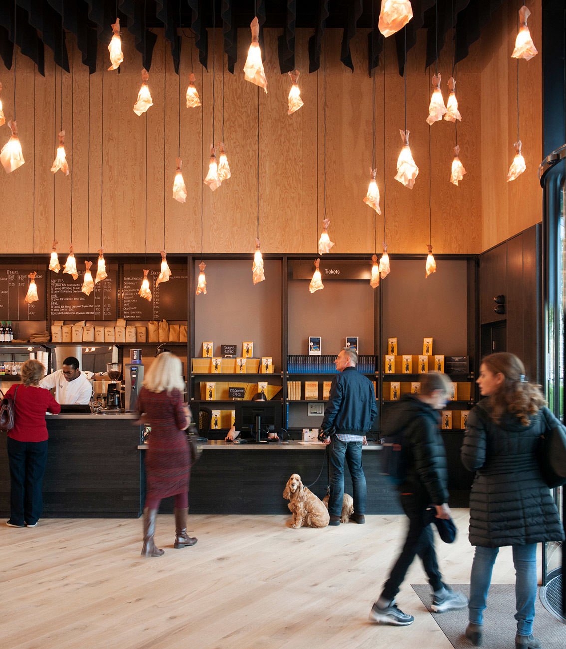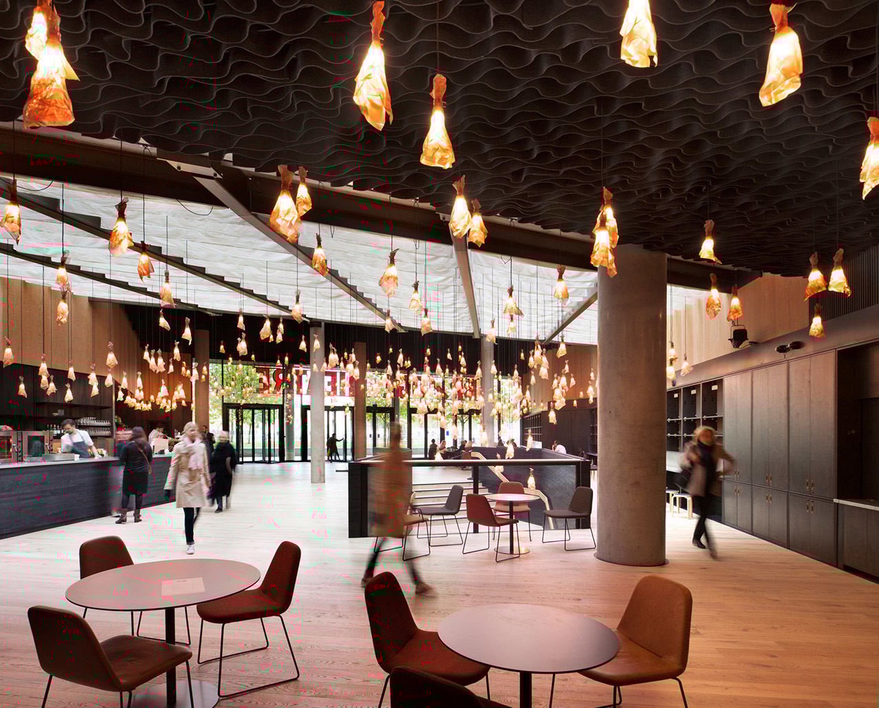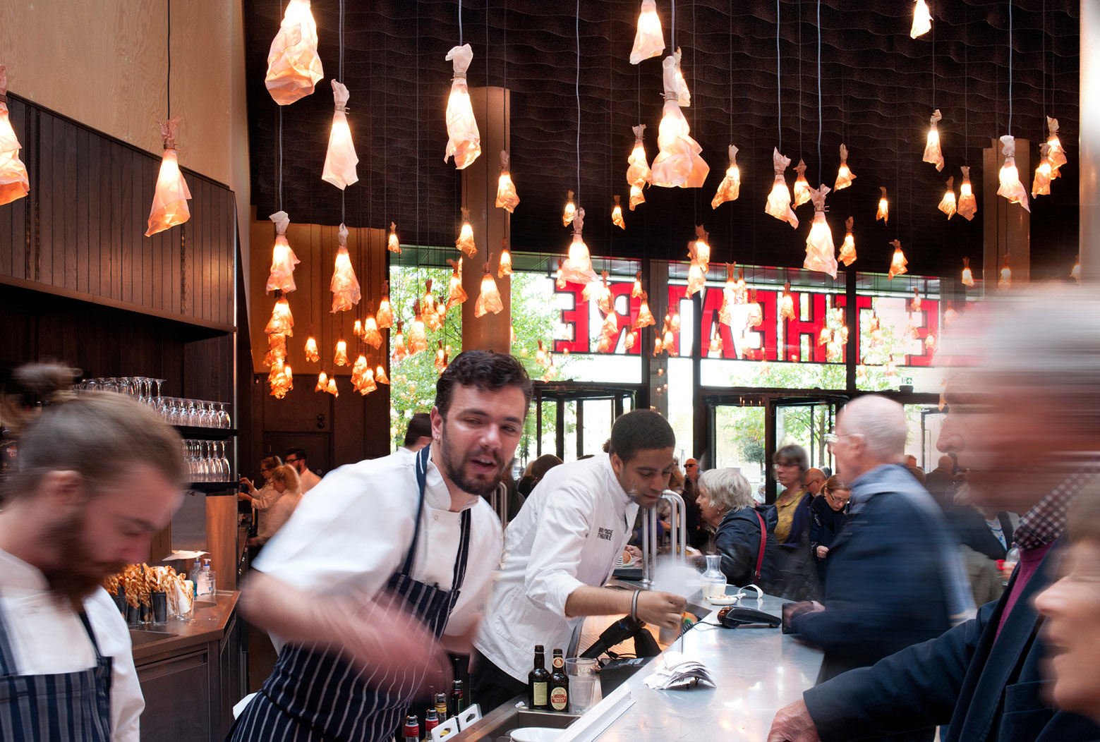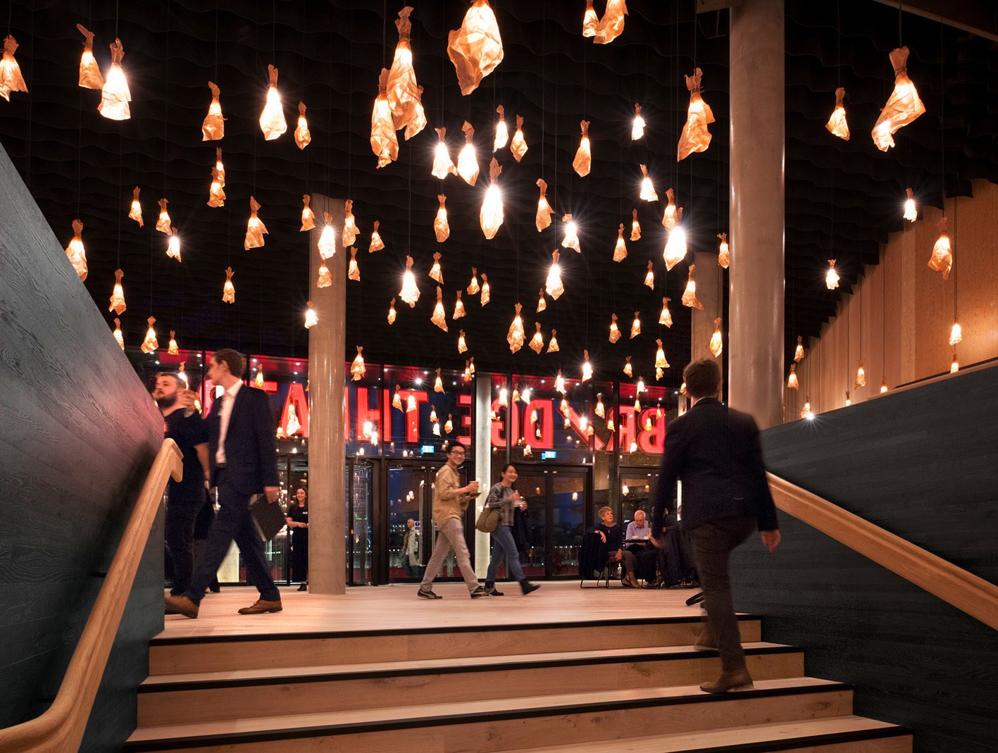 Served by a single long bar and lit by 500 bespoke copper light fittings (designed by Haworth Tompkins) the foyer functions as a friendly public congregation space throughout the day and evening. Acoustics are controlled by the use of canvas and felt ceiling banners, allowing good speech intelligibility even with a full audience.