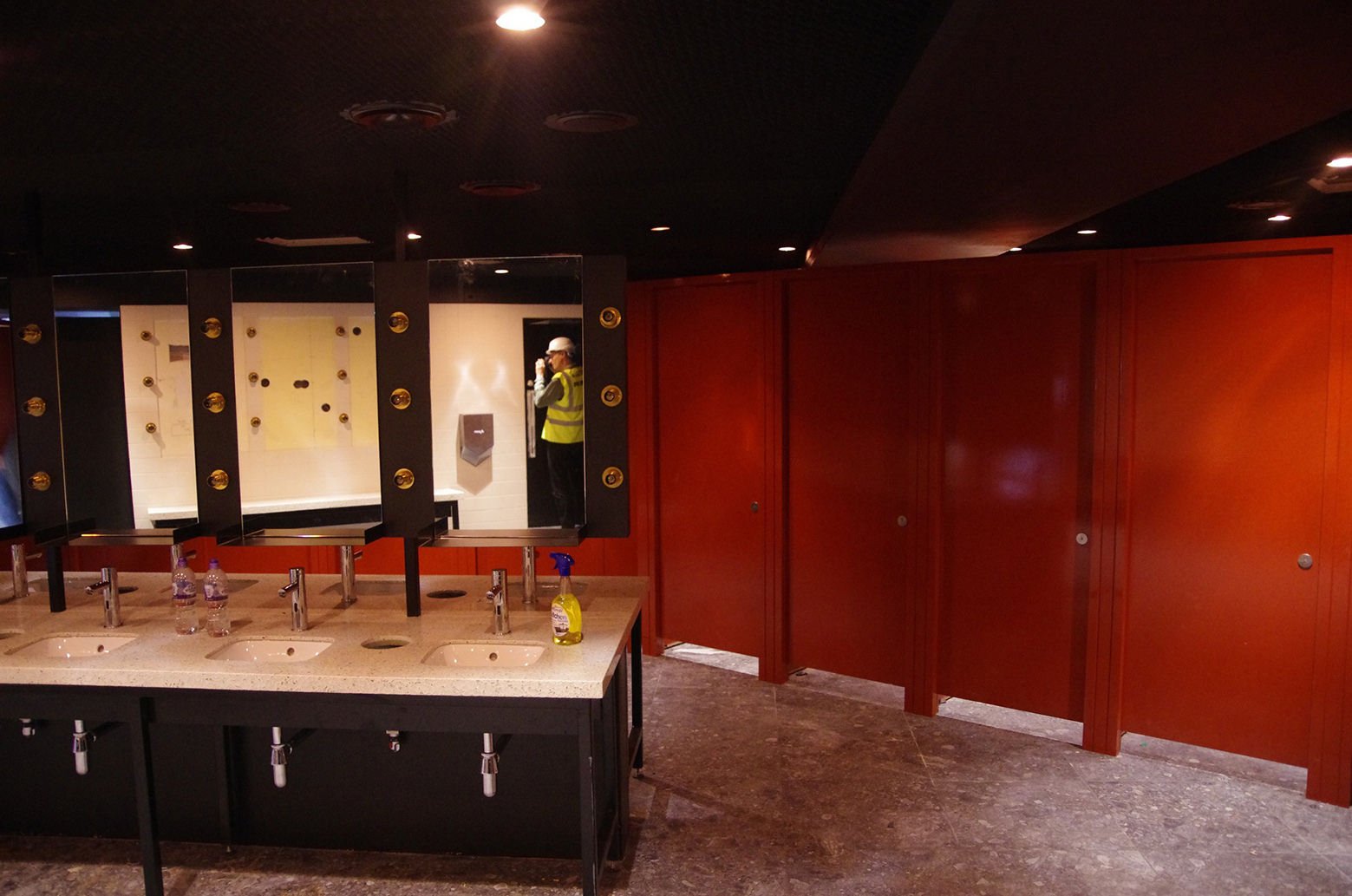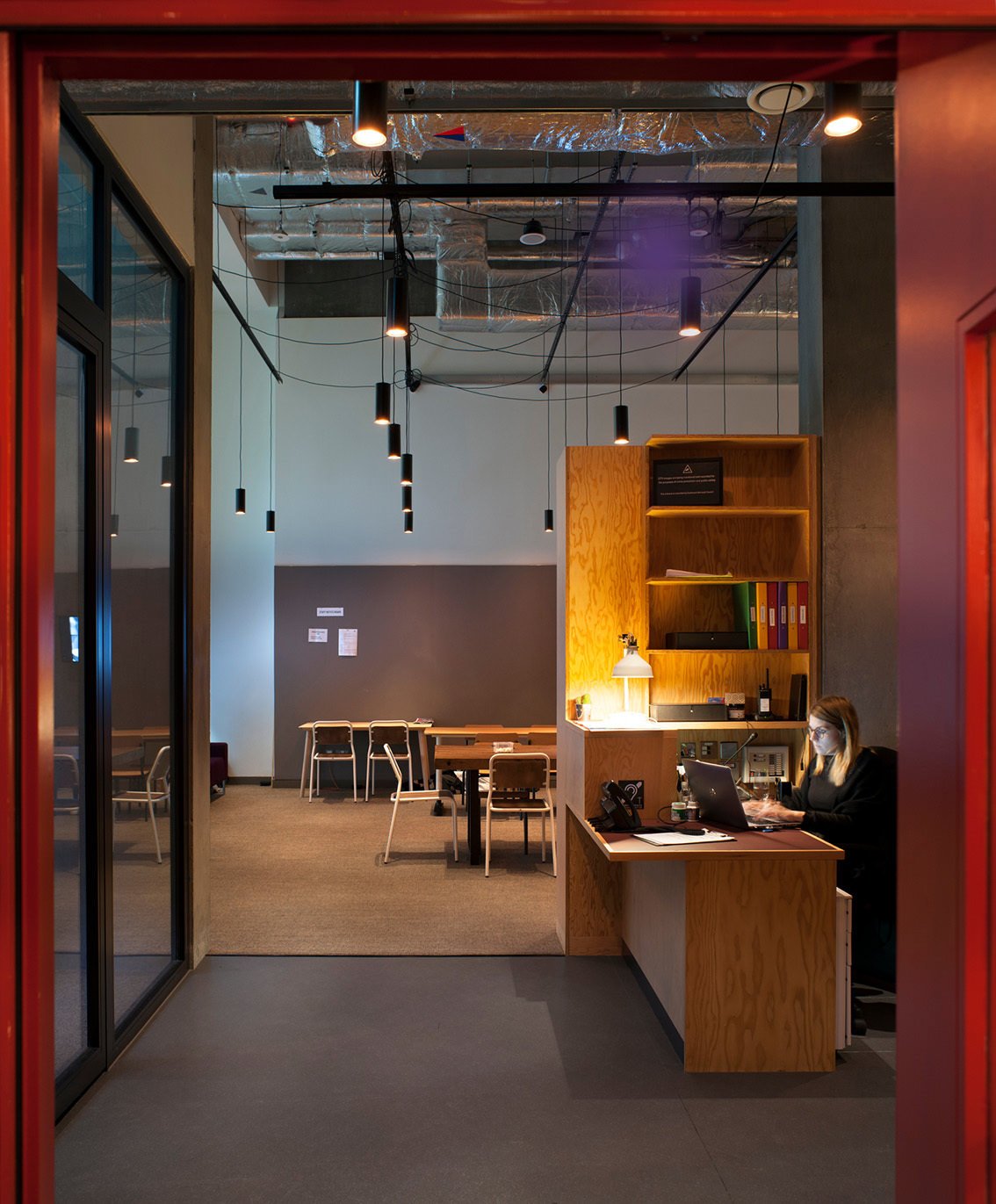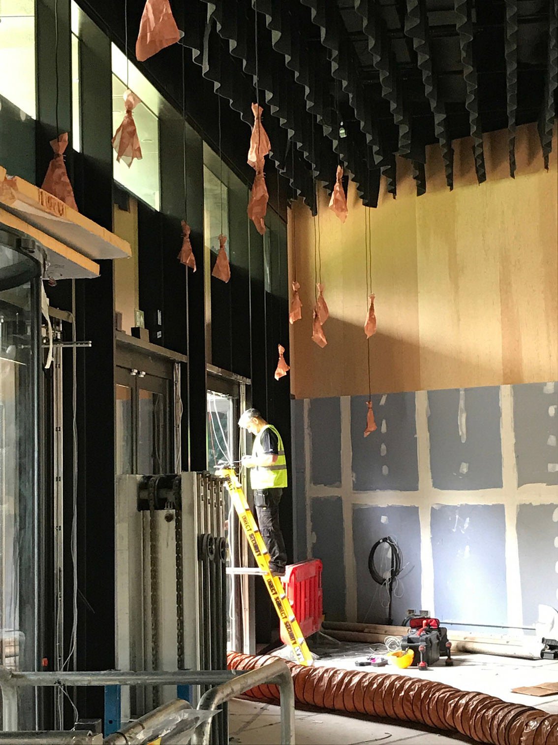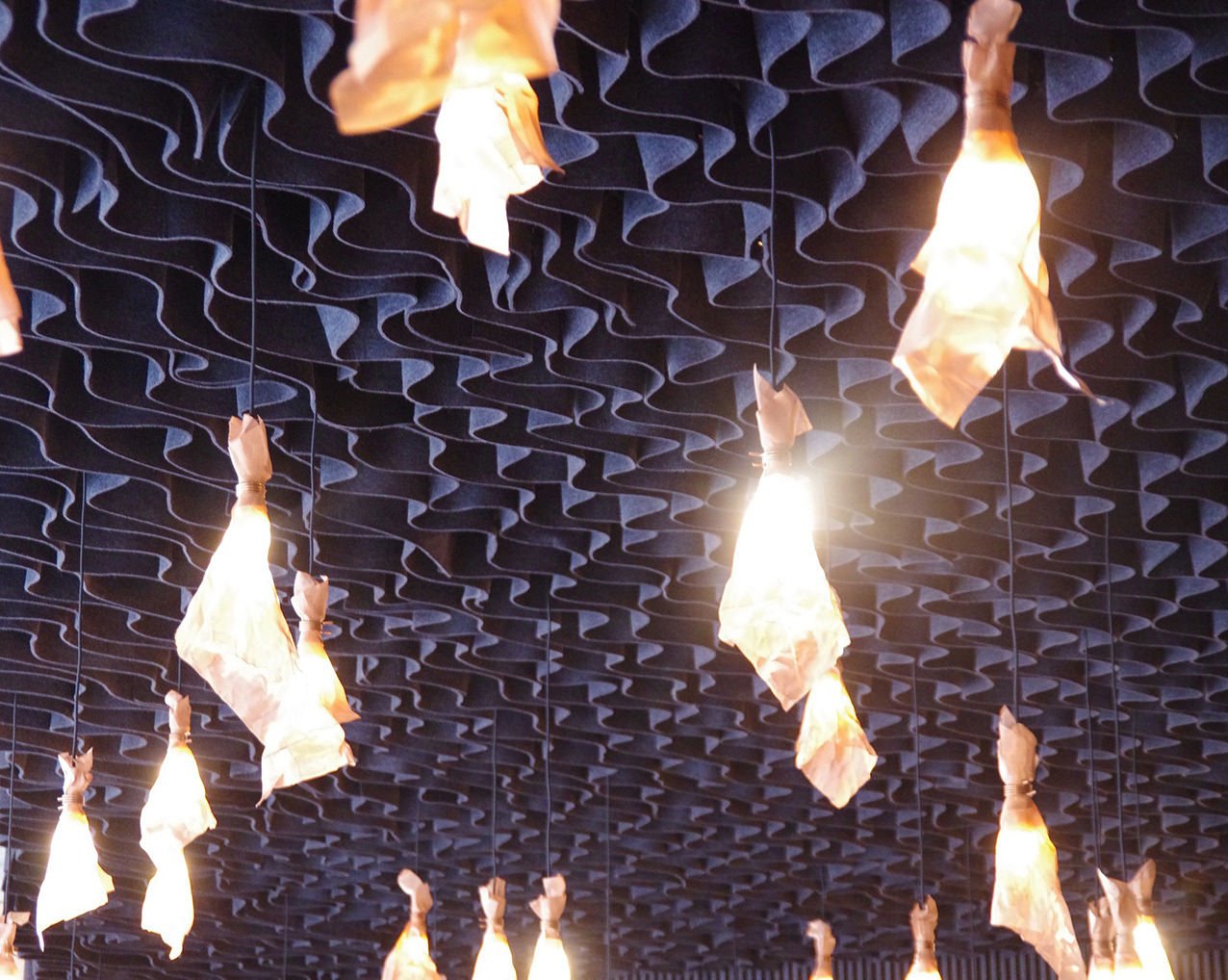 Served by a single long bar and lit by 500 bespoke copper light fittings (designed by Haworth Tompkins) the foyer functions as a friendly public congregation space throughout the day and evening. Acoustics are controlled by the use of canvas and felt ceiling banners, allowing good speech intelligibility even with a full audience.