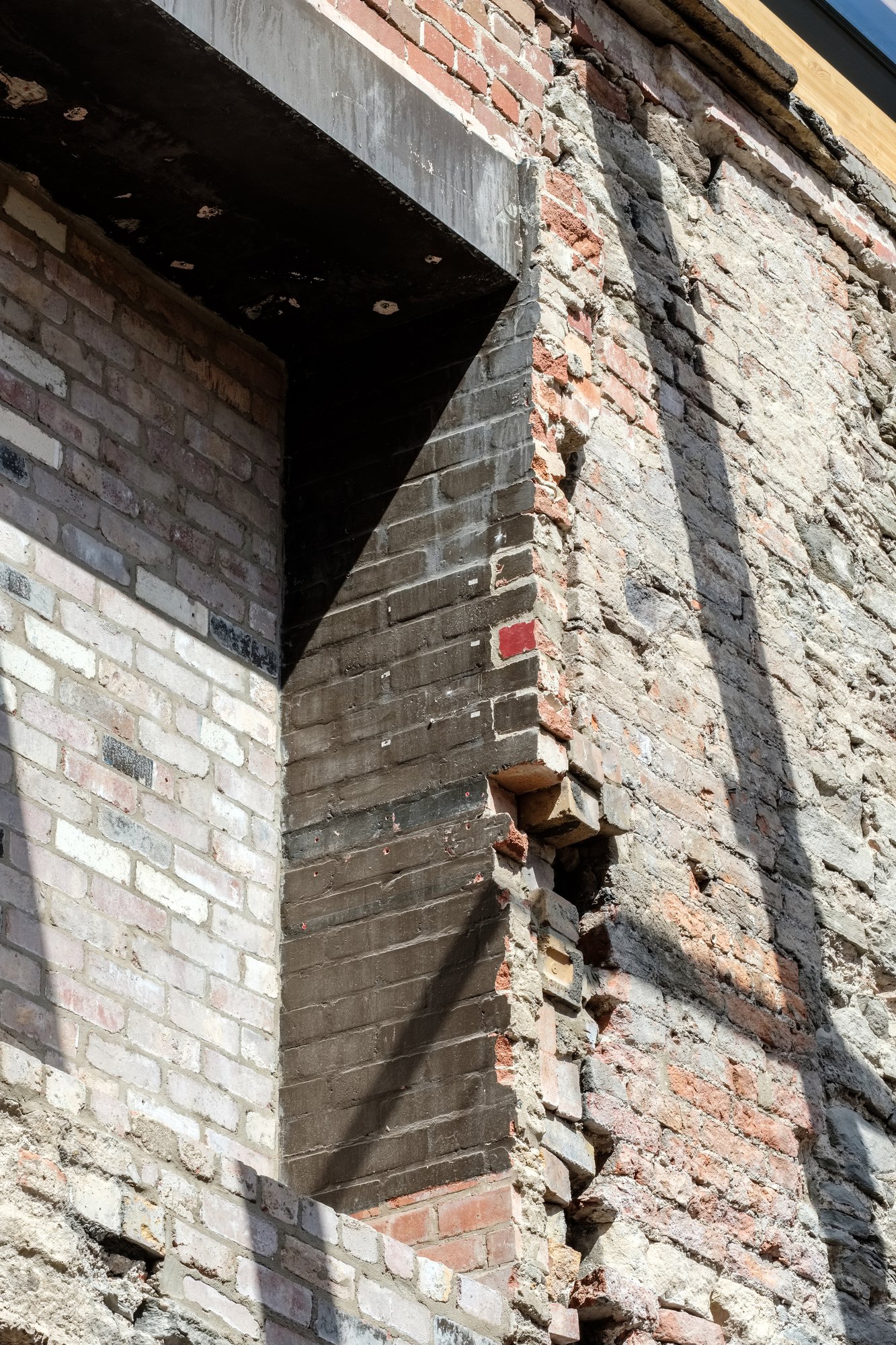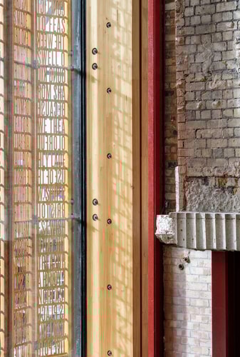 In addition to the main foyer, a new studio theatre occupies the former barrel store of the Coopers’ Hall at ground and basement levels, enlisting historic wall surfaces and allowing daylight from street level windows. The original Coopers’ Hall at first floor has been converted back to a grand public room overlooking the street, serving both as an extension of the foyer and as a self-contained function room. The scheme uses structural timber and timber linings for new elements including frame, roof, and external façade. The foyer and new studio are naturally ventilated via a large intake plenum and a pre-cooling labyrinth, with thermostatically controlled high level and low level opening windows. The moveable façade shutters are designed to optimise summer shading and winter solar heating. An exposed concrete floor and existing found masonry surfaces throughout the space contribute thermal mass, and brickwork from demolition operations was recycled and incorporated into new walls and masonry repairs.