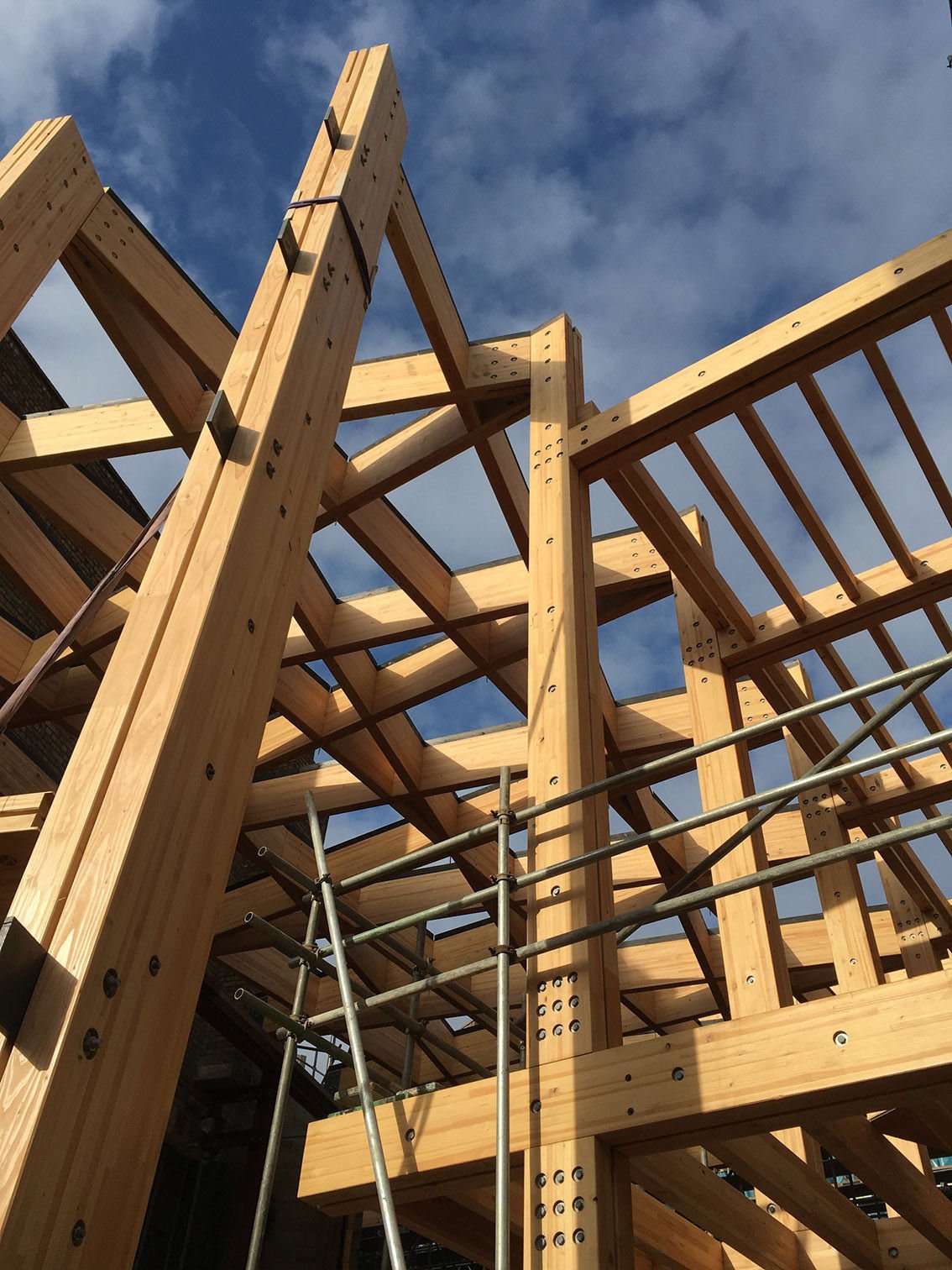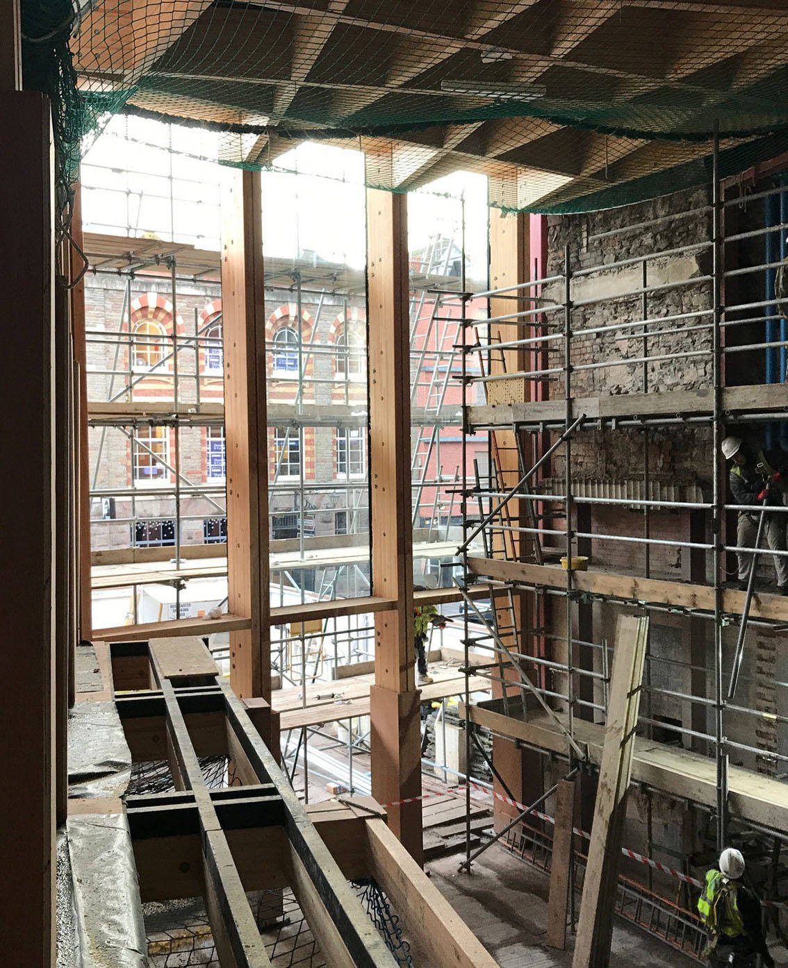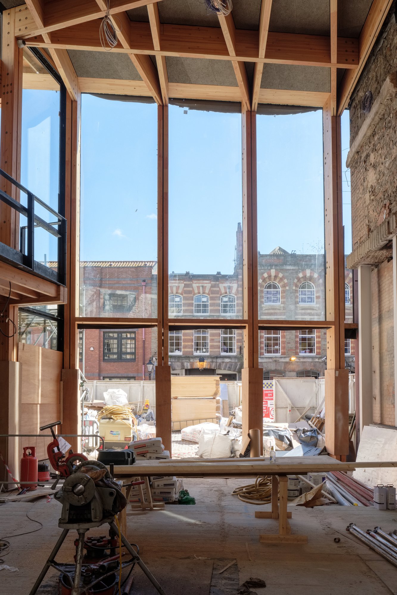 The foyer is conceived as an informal extension of the street, as much a covered public square as a discrete building. The space is framed and covered by structural timber and glass to bring daylight deep into the room. The centrepiece of the space is the much-altered façade of the Georgian auditorium, visible from the street for the first time, illuminated by a large light well and punctured by new openings to overwrite the visible evidence of historic alterations.