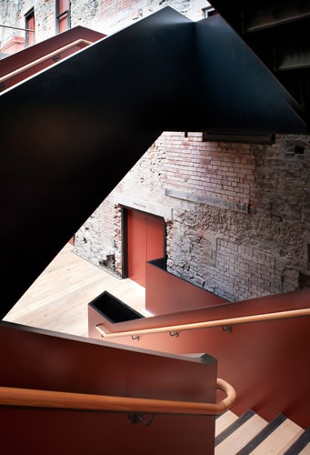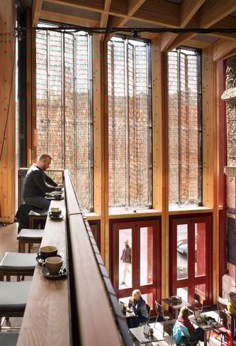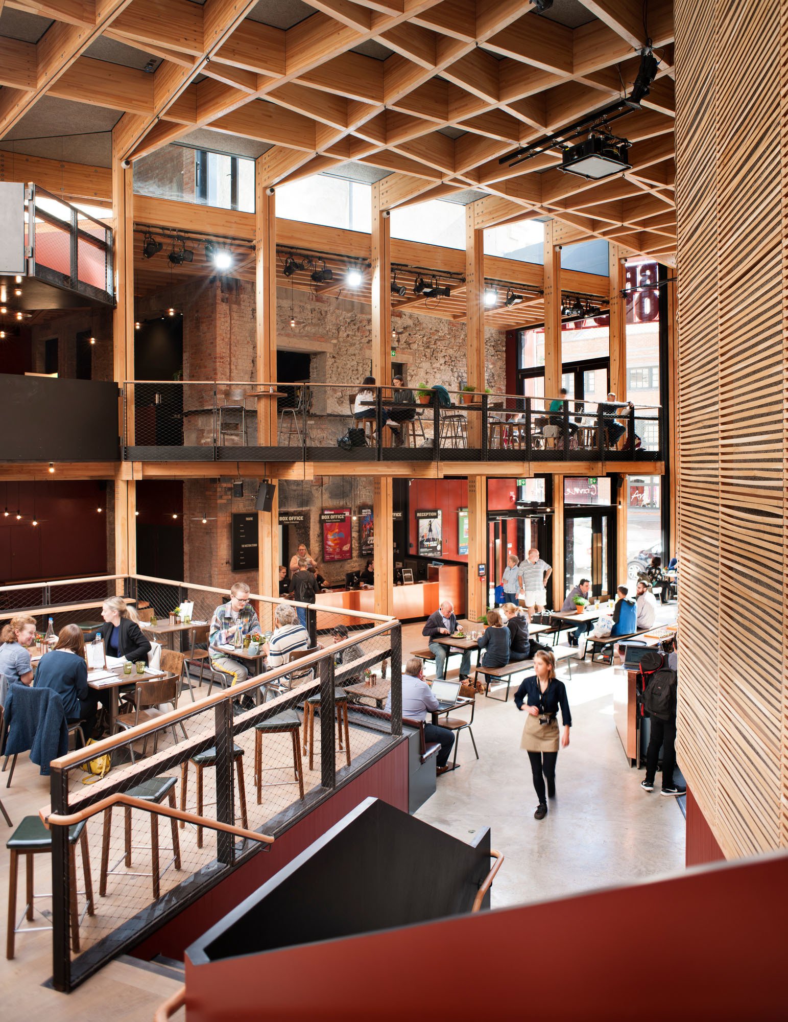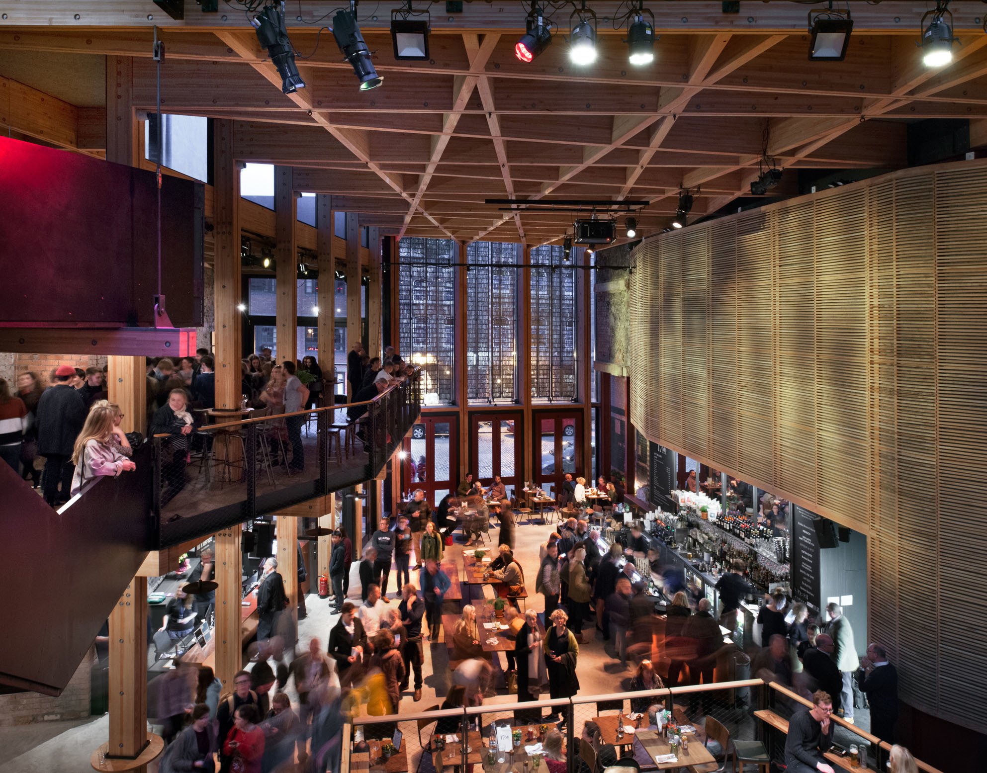 Mezzanine galleries, winding timber staircases and viewing platforms allow the entire audience to move up, down and around a single, convivial space before and after each show, and the local community to enjoy the foyer throughout the day as a café, bar and meeting place.