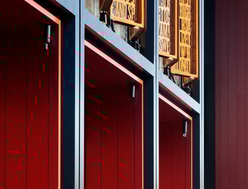 The south facing street façade has been conceived as a public art work, consisting of moveable sunshading shutters, operated by hand and incorporating the text both of the inaugural address given by Garrick in 1766 and a poem by former Bristol City Poet Miles Chambers. The text highlights the importance of the theatre's long history but also looks forward to its role in the current and future life of the whole community.