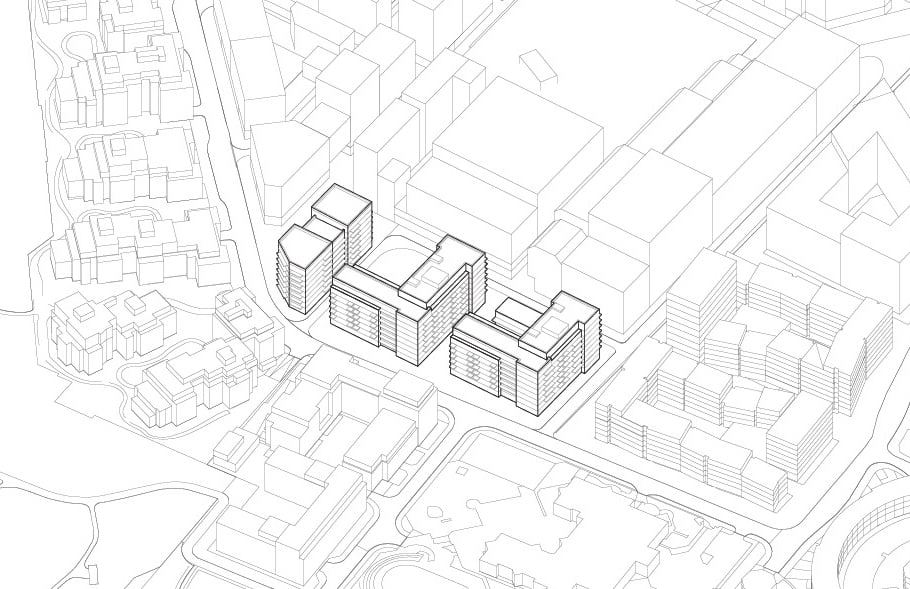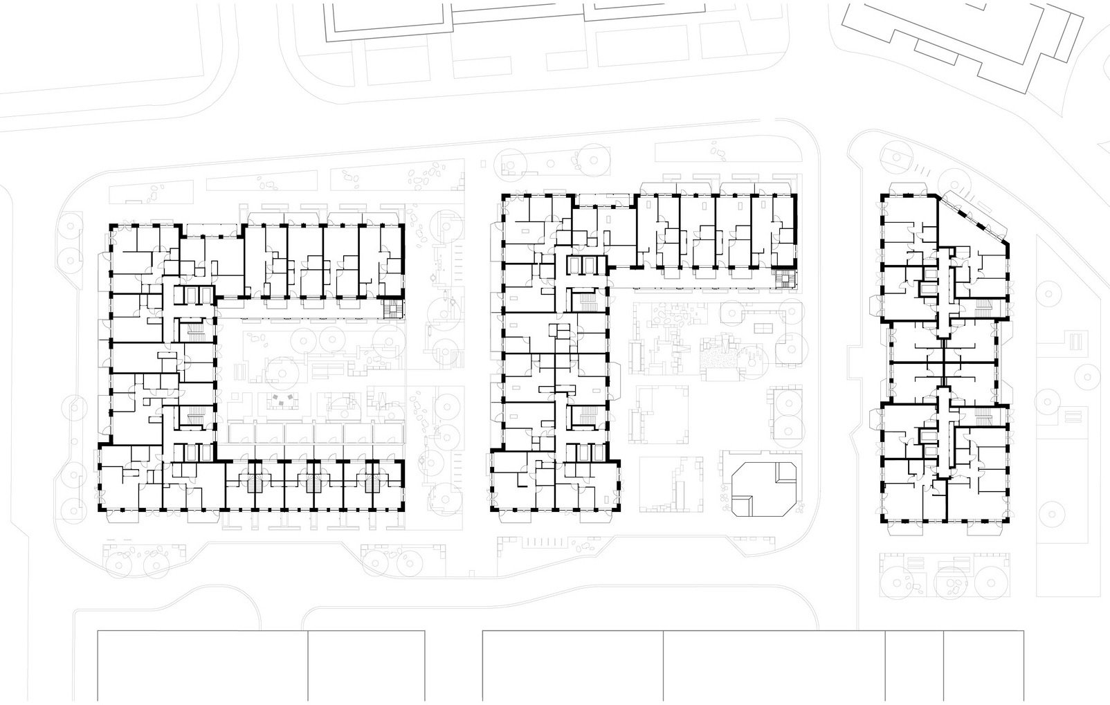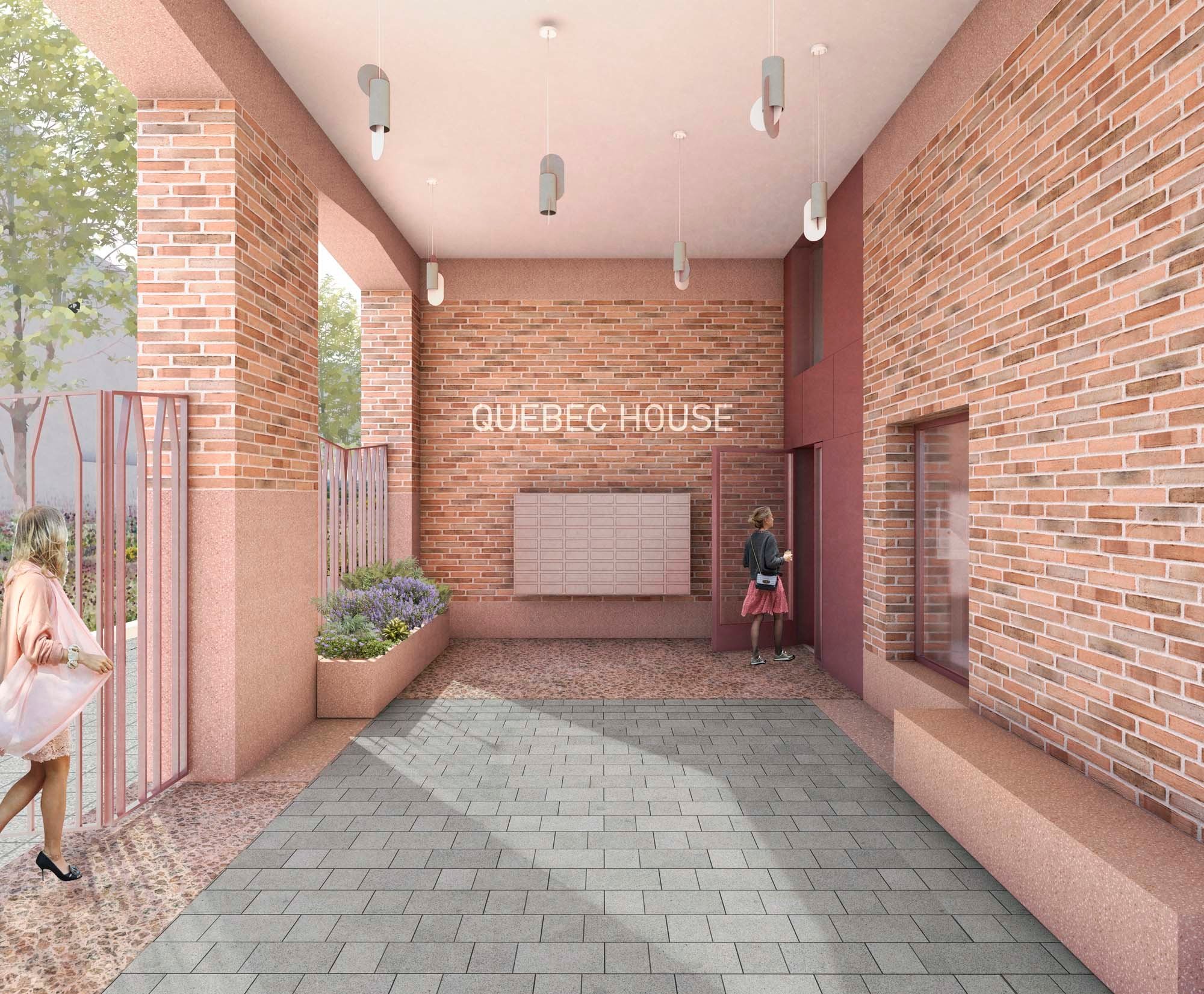 The three buildings have a common material palette of masonry and steel with a collective set of details, however they are set apart through the use of colour. Most of the routes through are pedestrianised with soft landscaping and trees placed informally, and embedded amenity and play space, more of which is provided in the two adjacent shared courtyards.