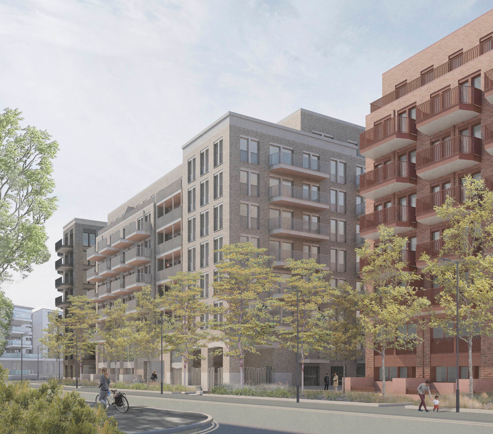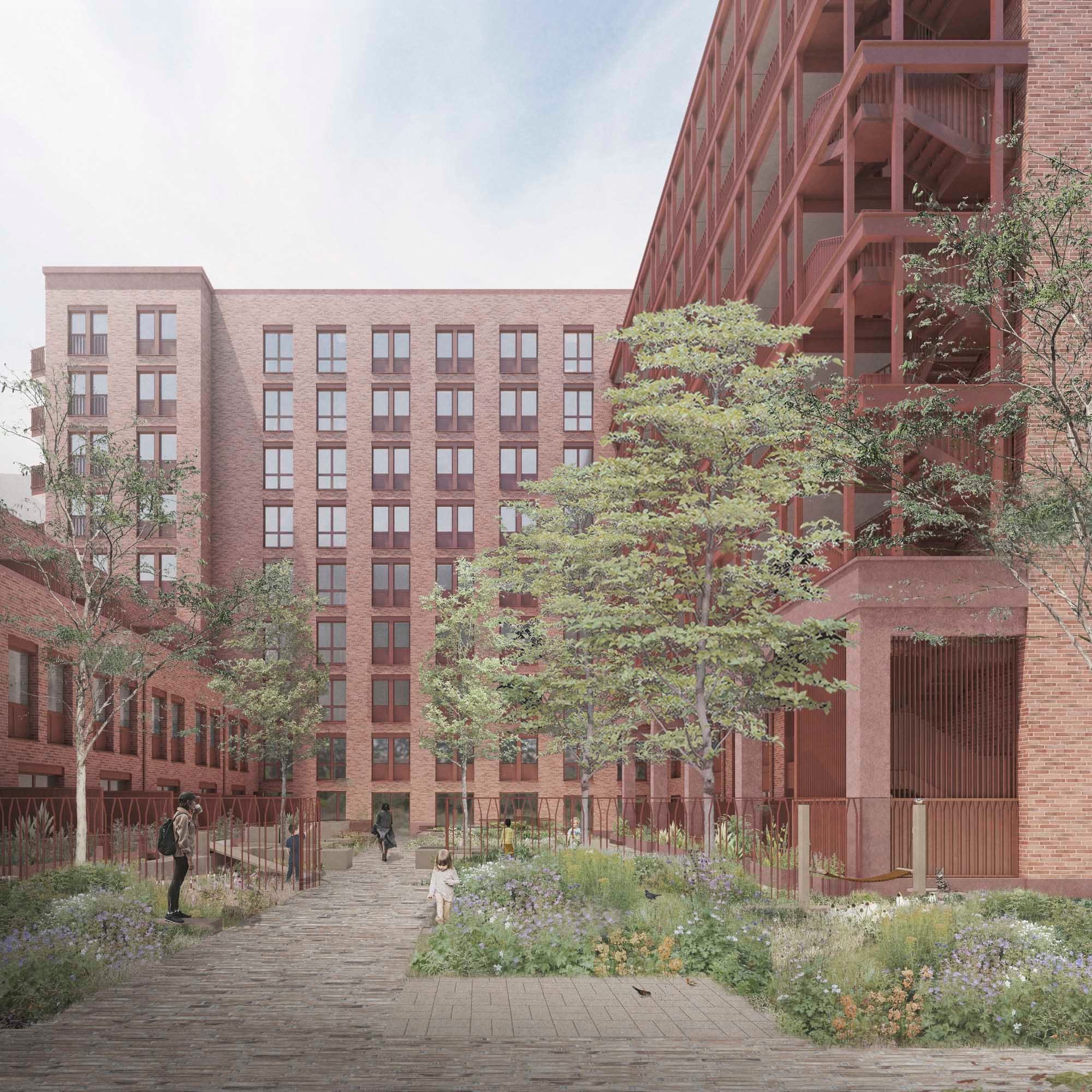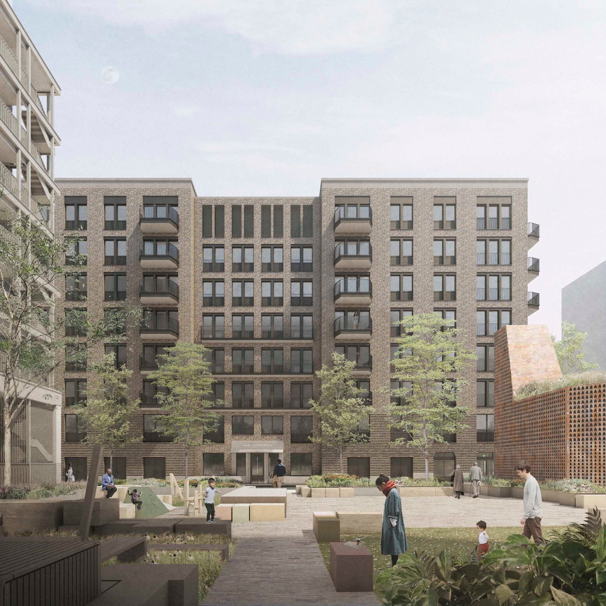 Inspired by the dockside warehouses which formerly occupied this site, standardised and repeated key components such as generous window openings and balconies punctuate the carefully composed facades. Light is an important feature; over 70% of the homes are dual aspect, corner entrance lobbies are double height, and bike stores are day-lit. The maisonettes have individual entrance doors at ground floor, efficiently stacking apartments above which are reached by either secure and welcoming internal corridors or galleried access. Construction is expected to start in 2023 with completion forecast for 2025.