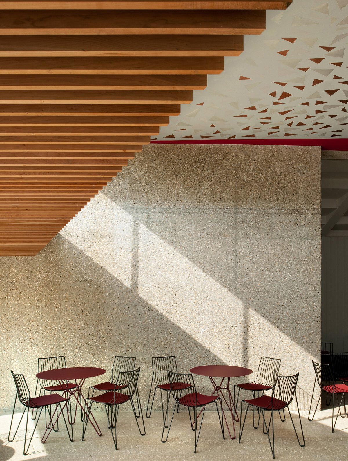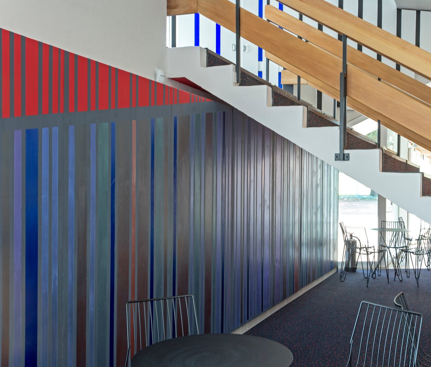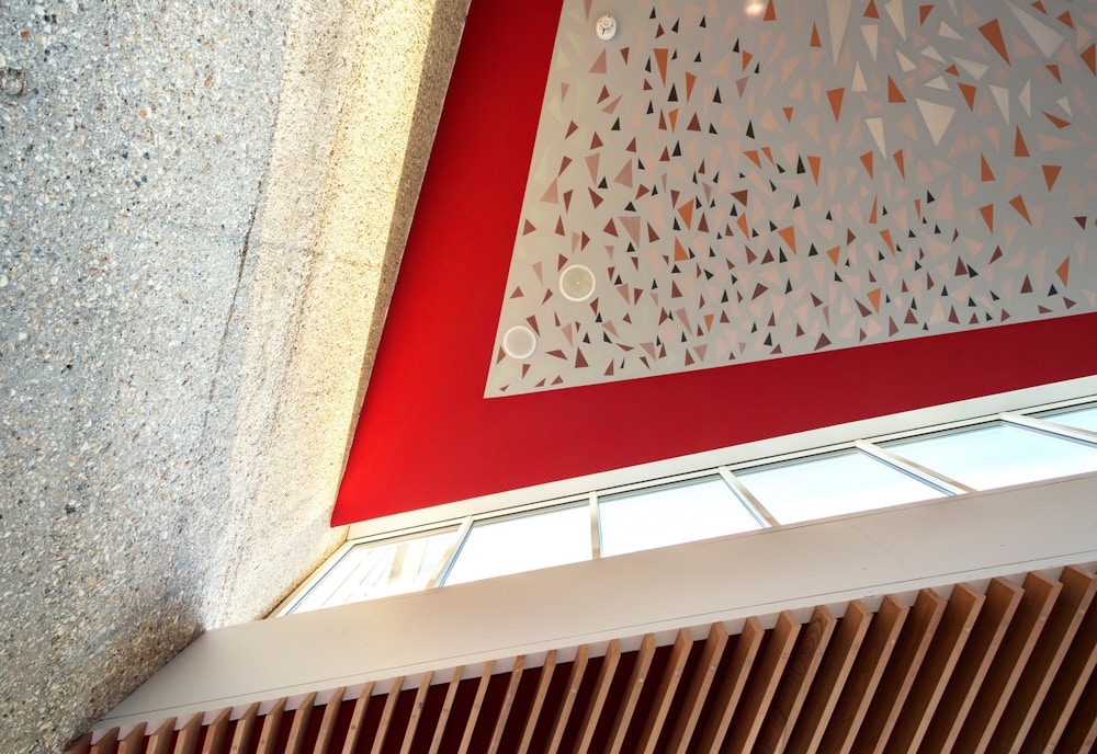 Painted foyer ceilings and walls by artist Antoni Malinowski complement the geometries of the existing structure and amplify the presence of the surrounding landscape, as do more transparent circulation staircases and pale concrete interior floors merging into outdoor terraces, blurring internal and external spaces.
