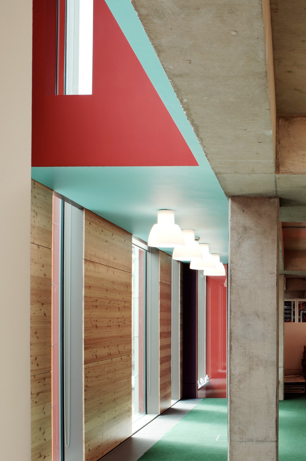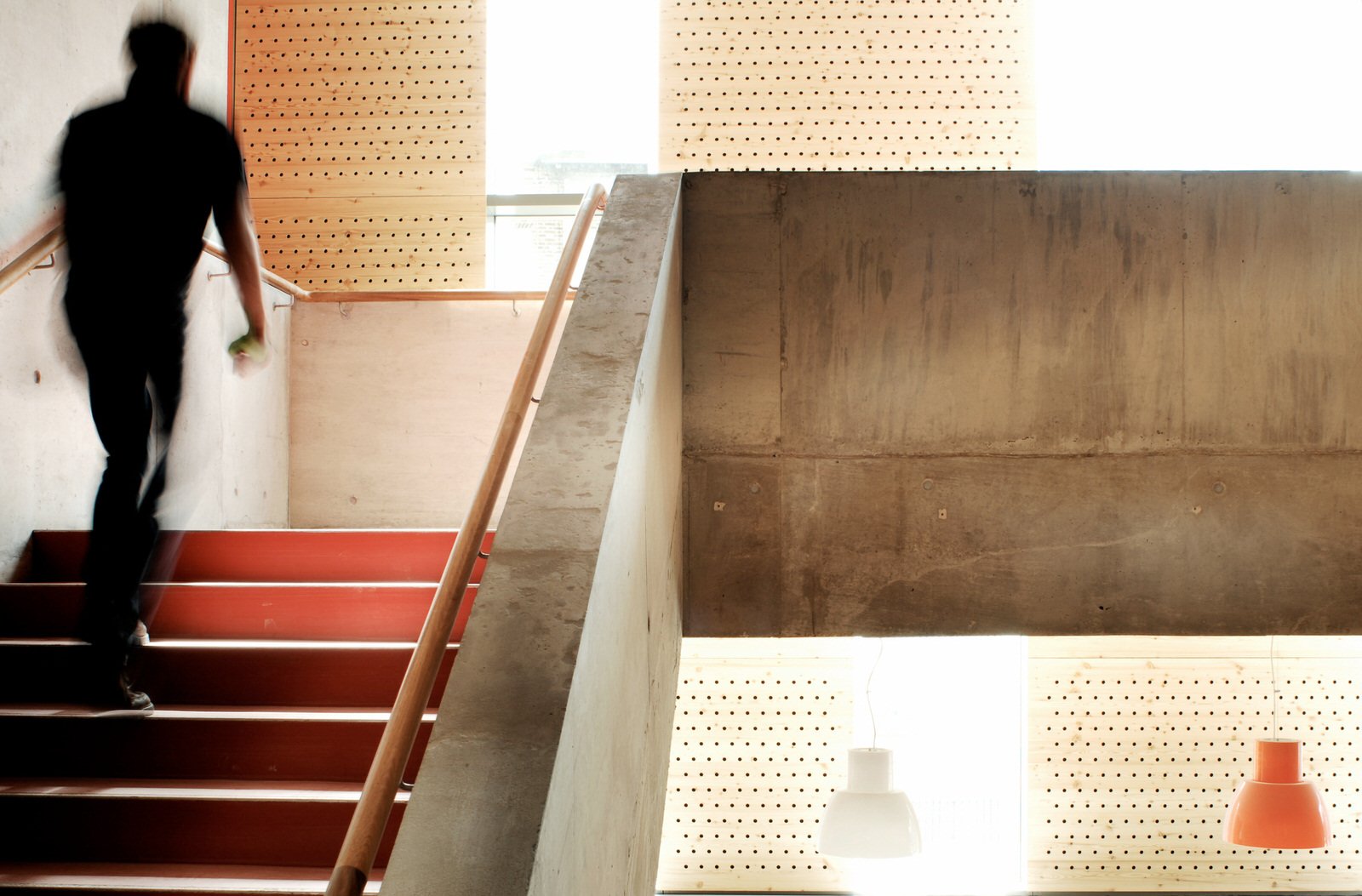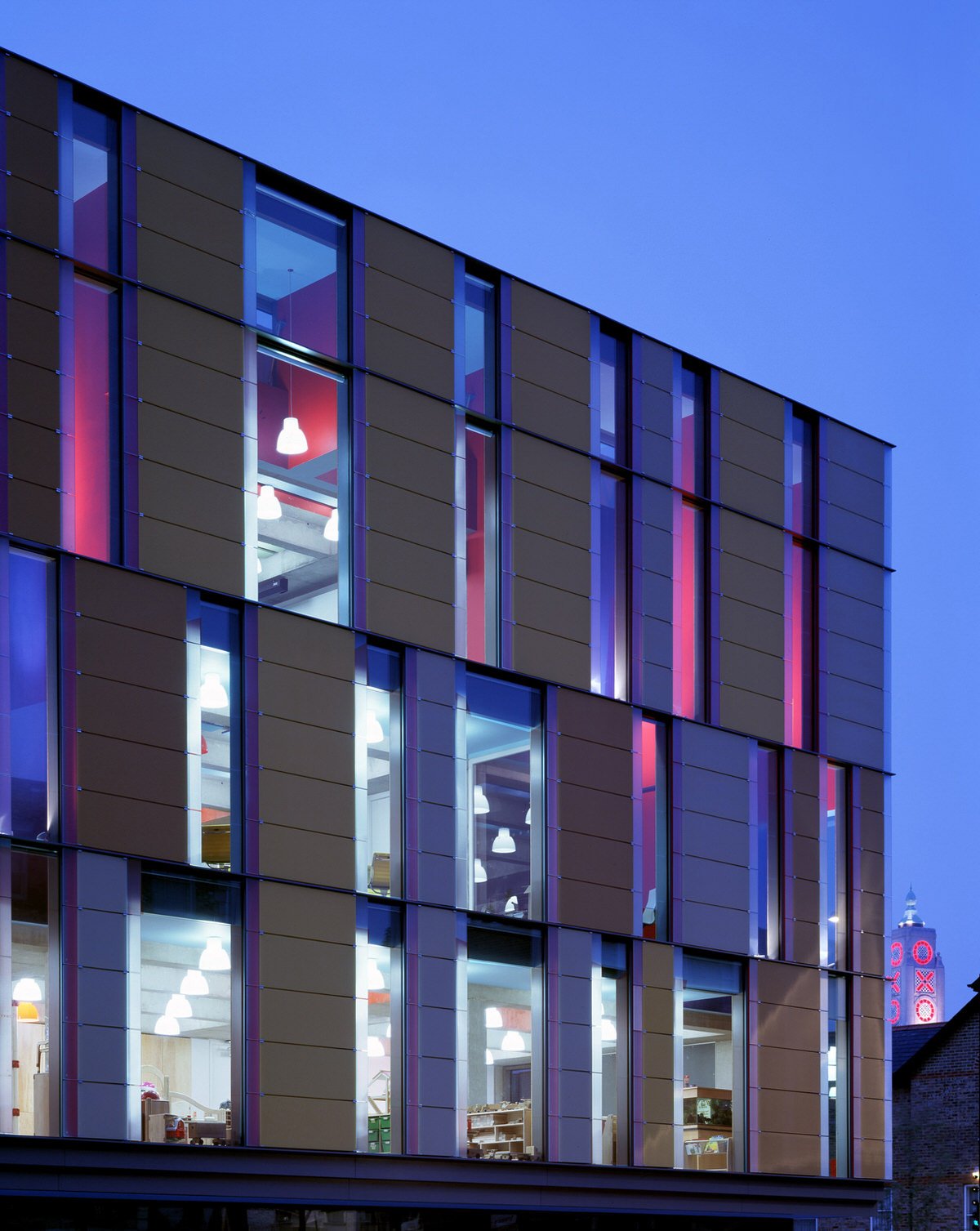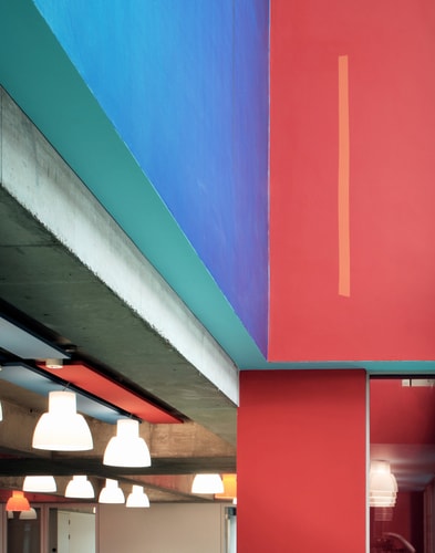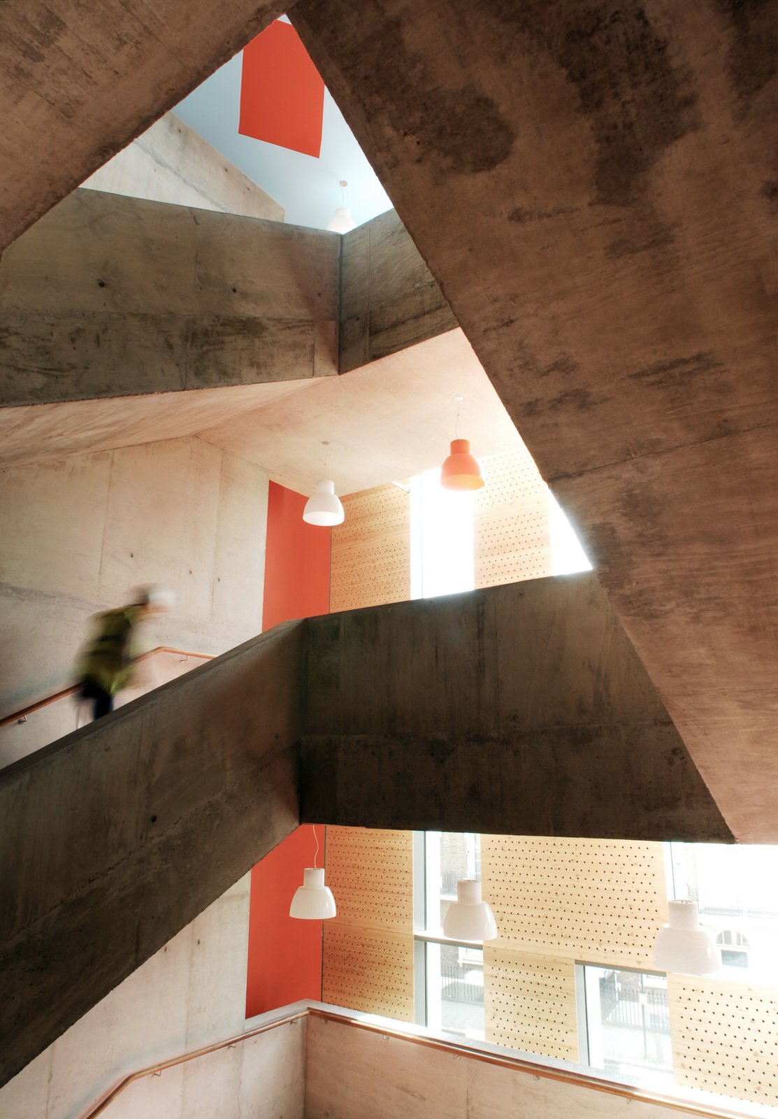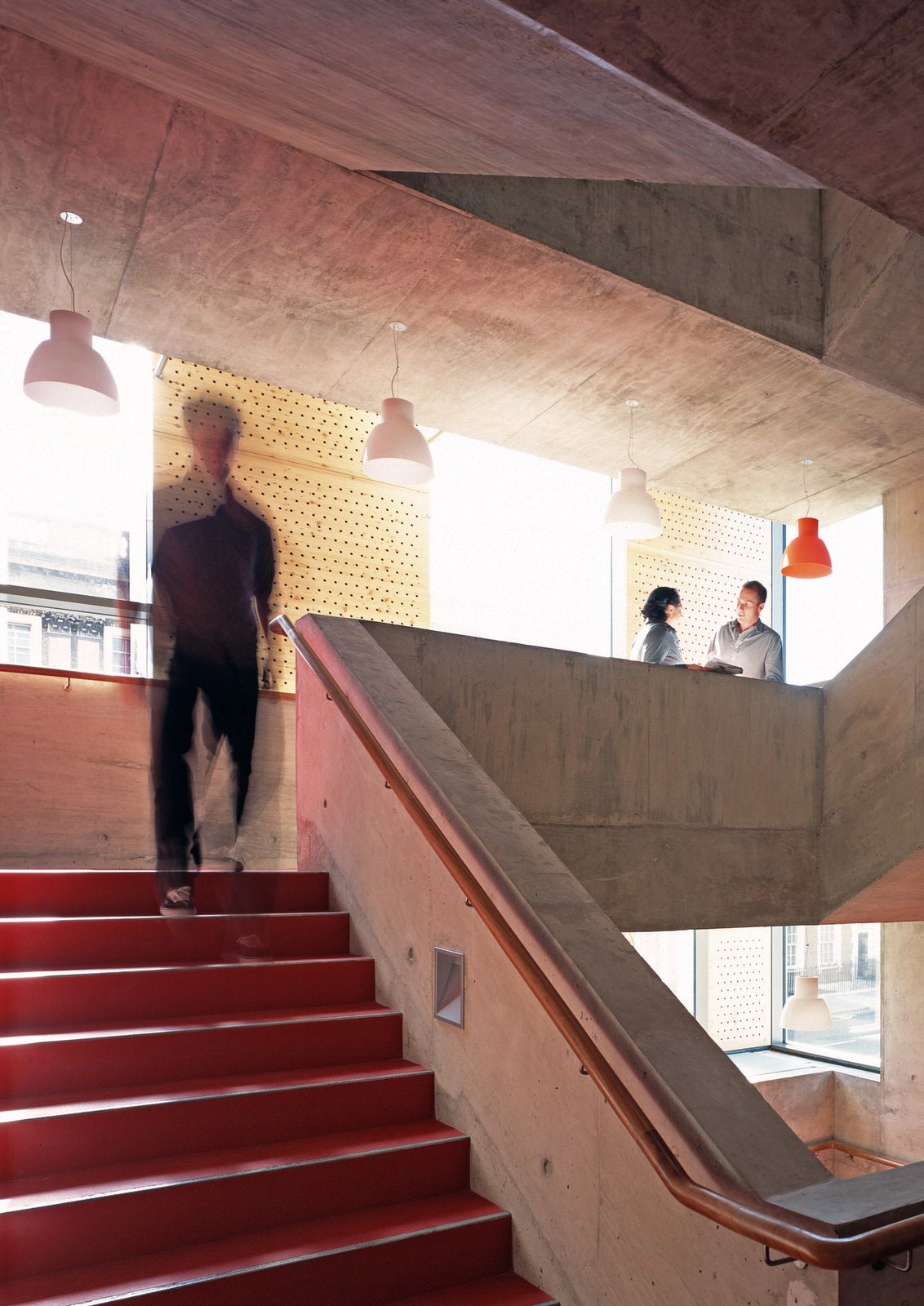 A grand staircase of pale, cast concrete is shared by all uses within the building, acting as an informal meeting and gathering space. It is designed eventually to serve a second phase of equal size. The building is naturally ventilated via a brightly coloured façade of solar chimneys, the result of a collaboration with artist Antoni Malinowski. Cool, fresh air is drawn from the garden façade and extracted from each floor by natural convection via roof vents from the hotter, noisier street façade, resulting in exceptionally good internal conditions.