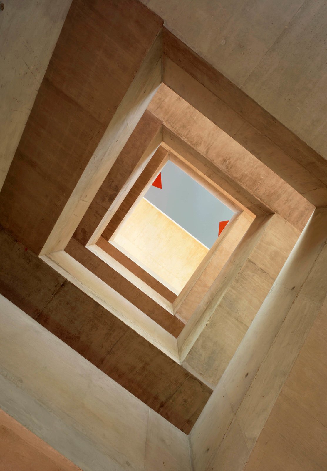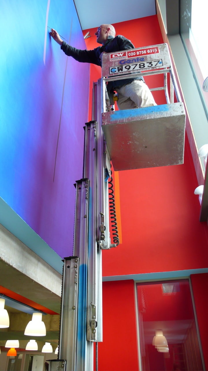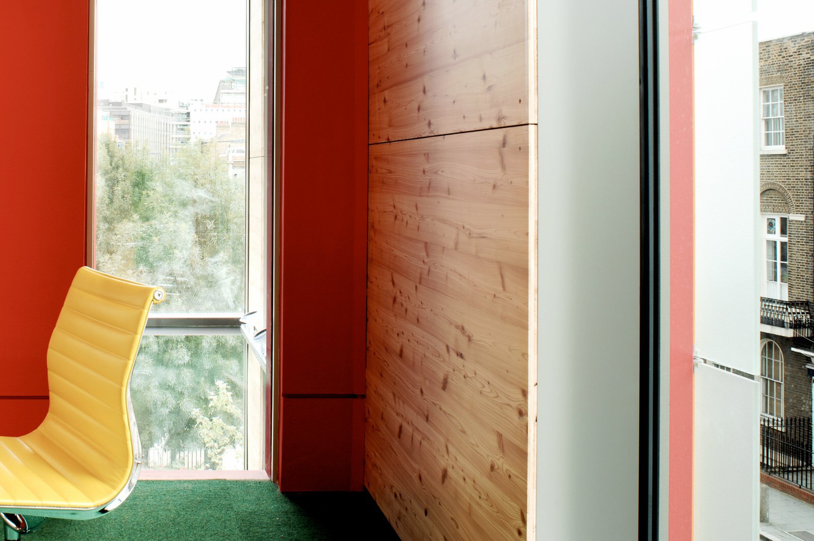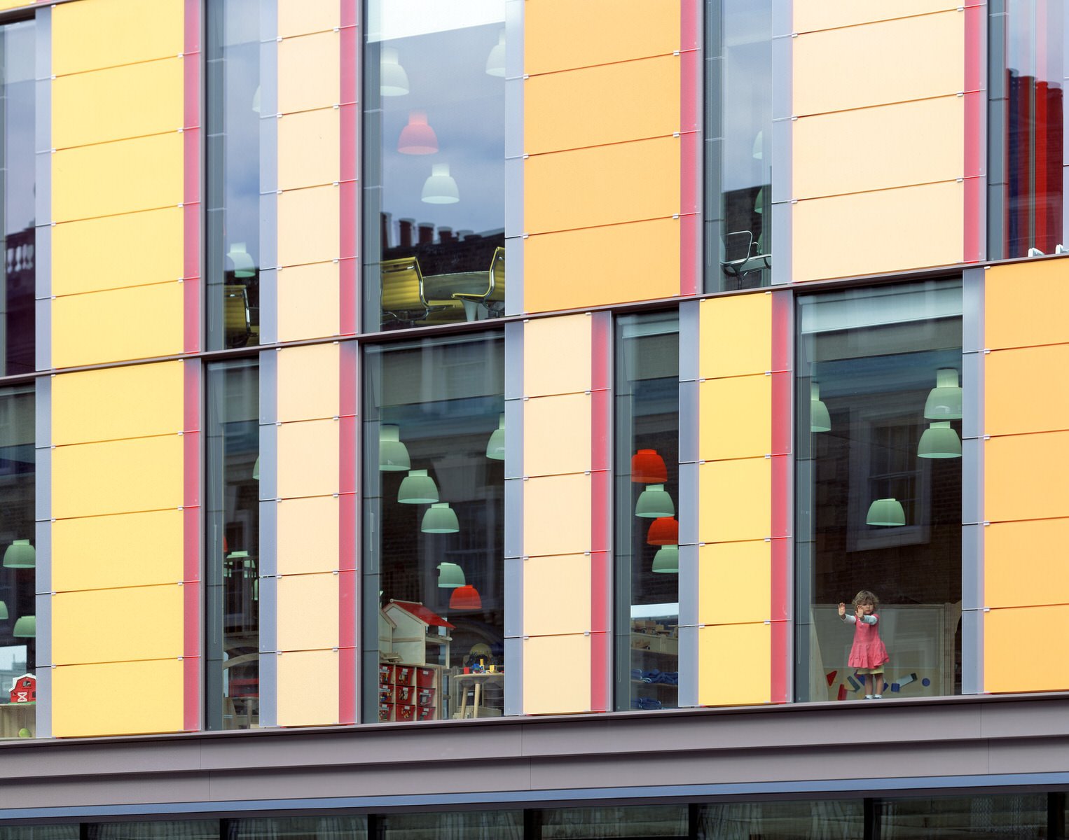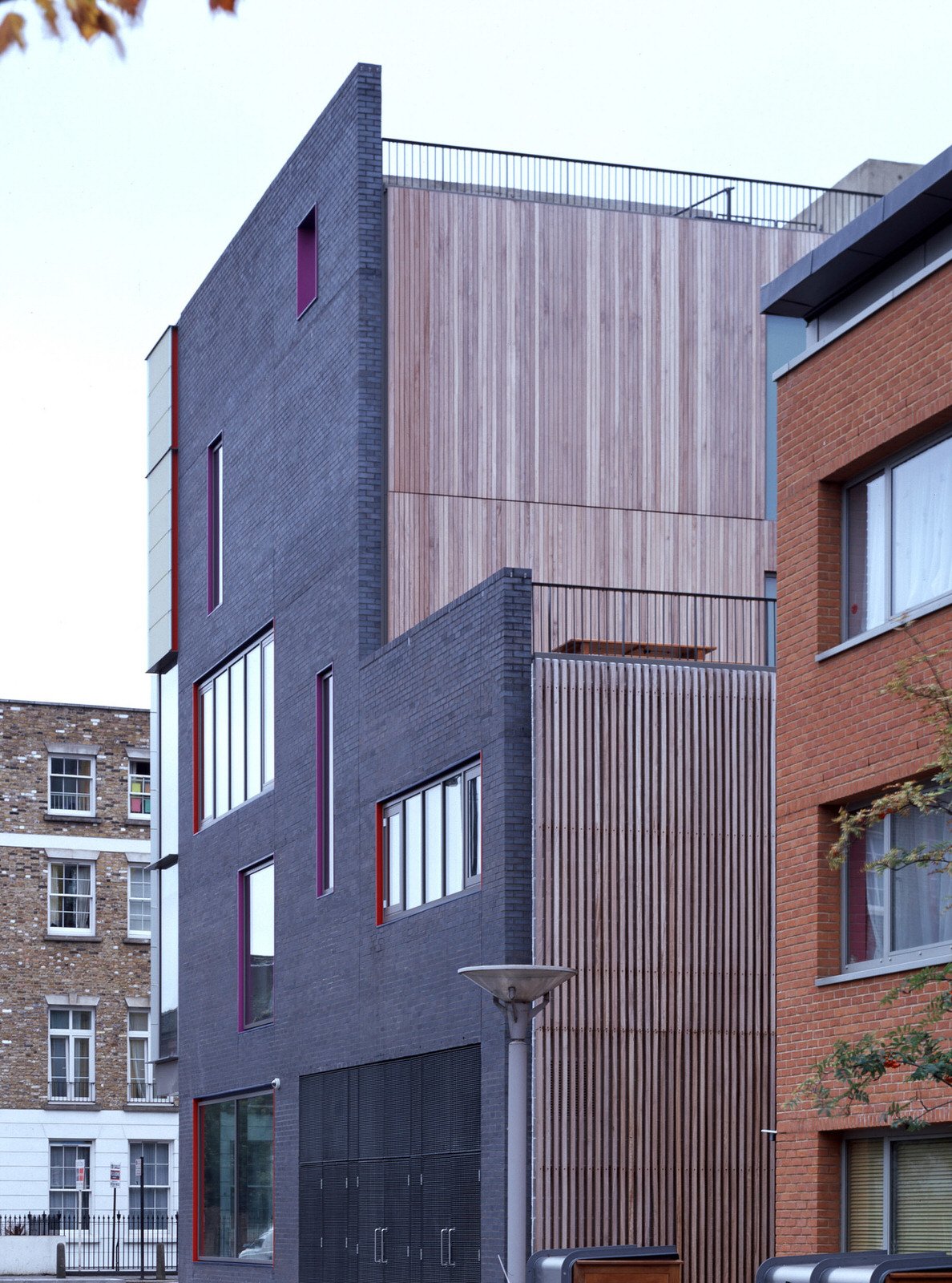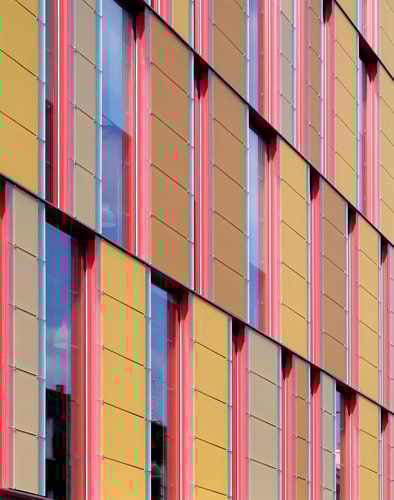 A grand staircase of pale, cast concrete is shared by all uses within the building, acting as an informal meeting and gathering space. It is designed eventually to serve a second phase of equal size. The building is naturally ventilated via a brightly coloured façade of solar chimneys, the result of a collaboration with artist Antoni Malinowski. Cool, fresh air is drawn from the garden façade and extracted from each floor by natural convection via roof vents from the hotter, noisier street façade, resulting in exceptionally good internal conditions.