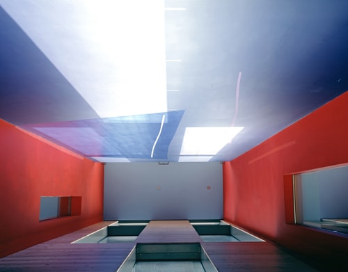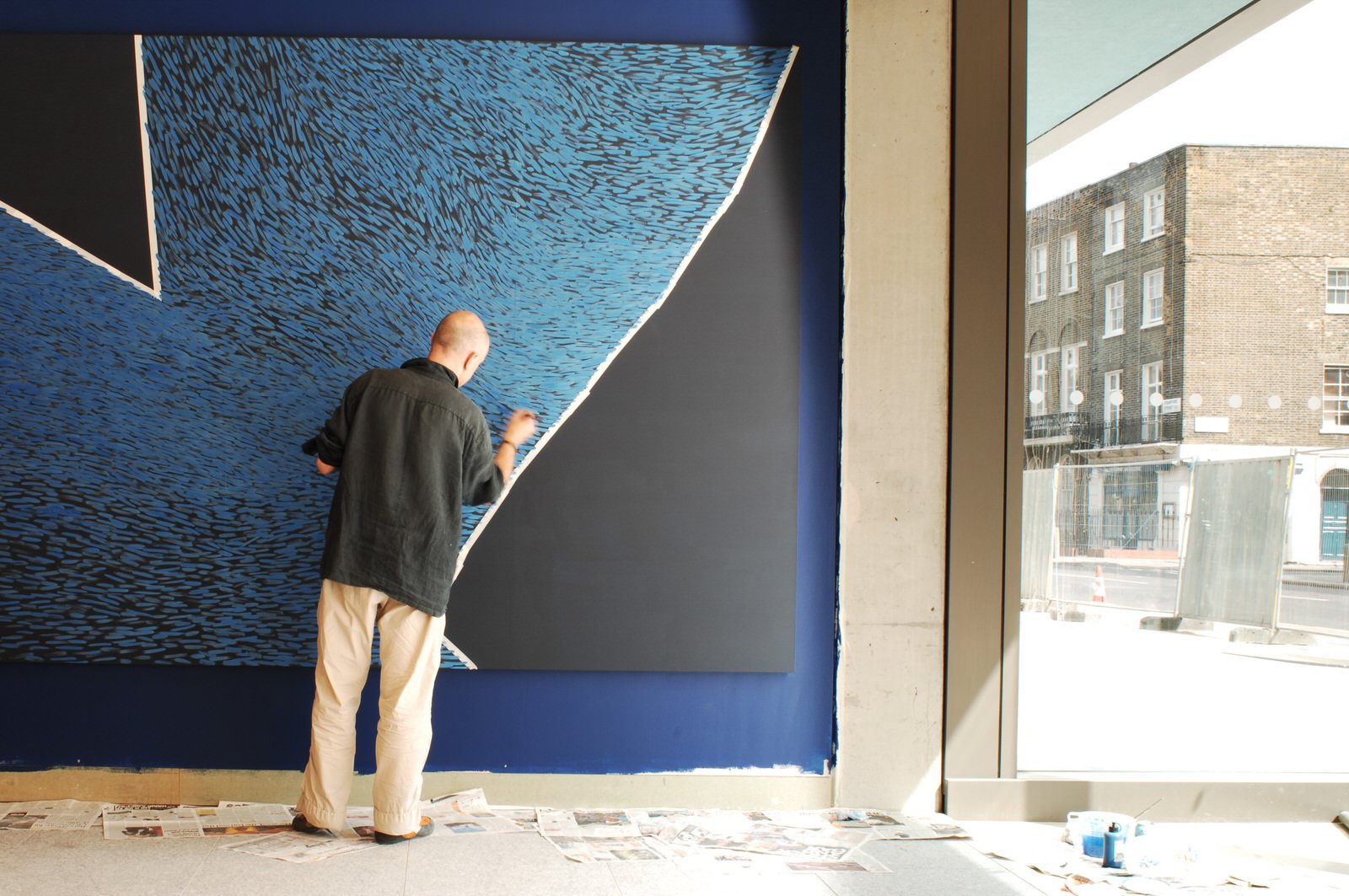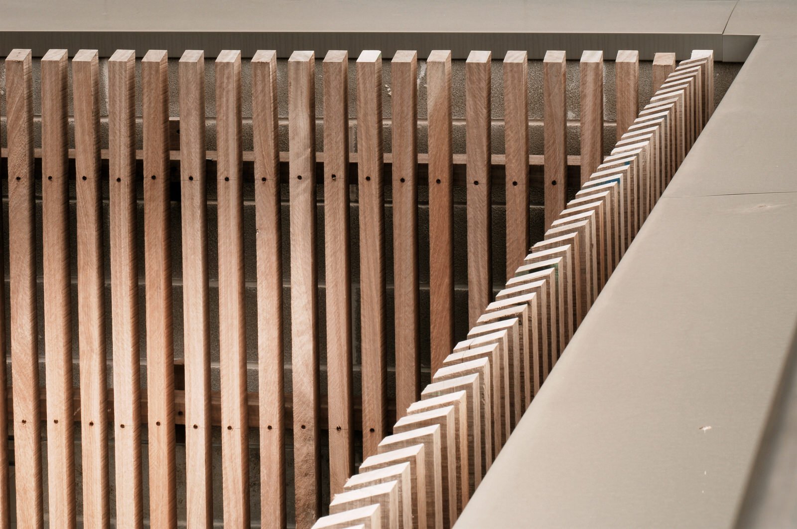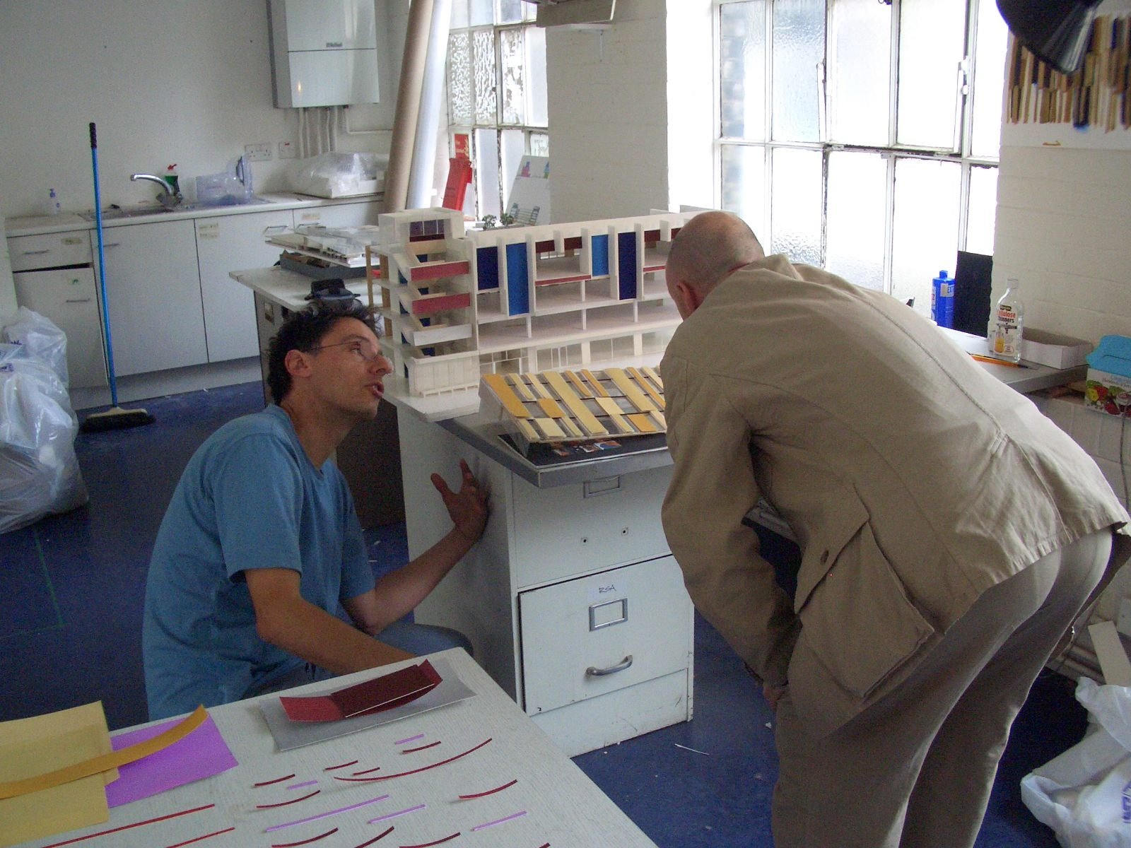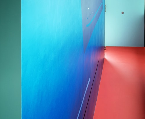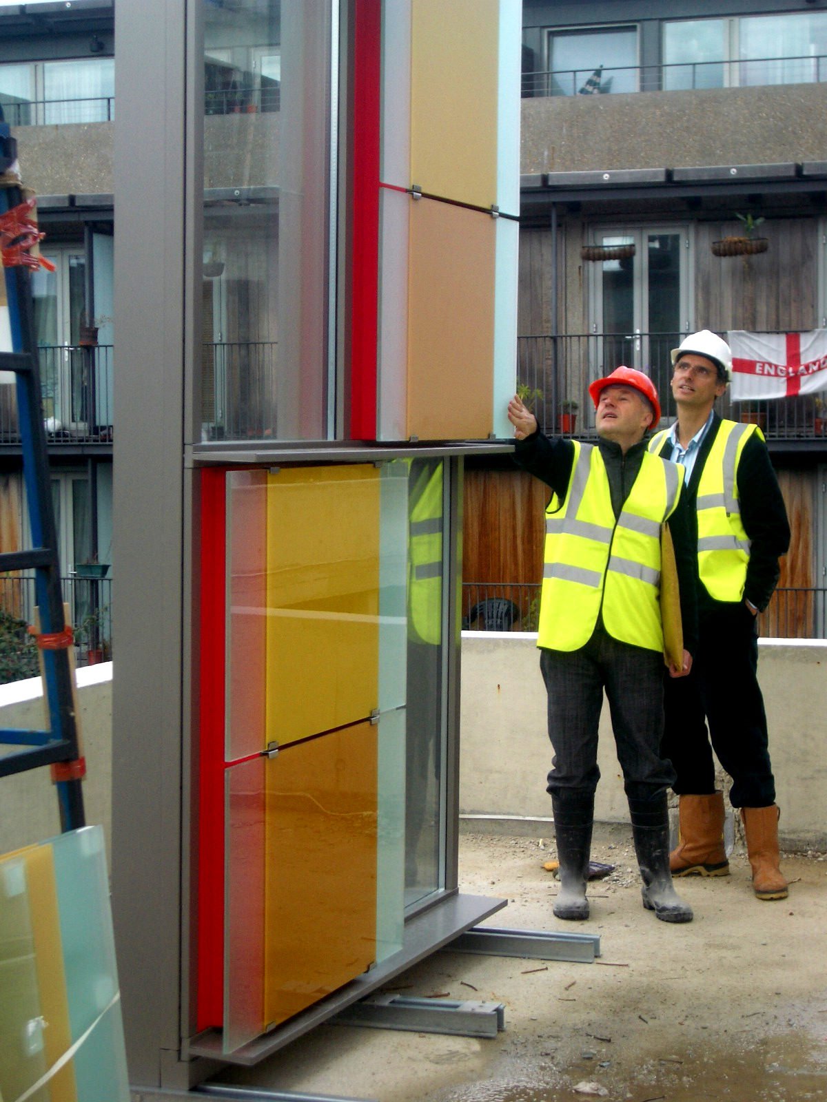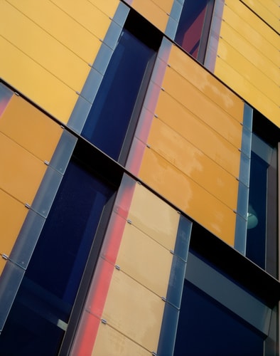 A grand staircase of pale, cast concrete is shared by all uses within the building, acting as an informal meeting and gathering space. It is designed eventually to serve a second phase of equal size. The building is naturally ventilated via a brightly coloured façade of solar chimneys, the result of a collaboration with artist Antoni Malinowski. Cool, fresh air is drawn from the garden façade and extracted from each floor by natural convection via roof vents from the hotter, noisier street façade, resulting in exceptionally good internal conditions.