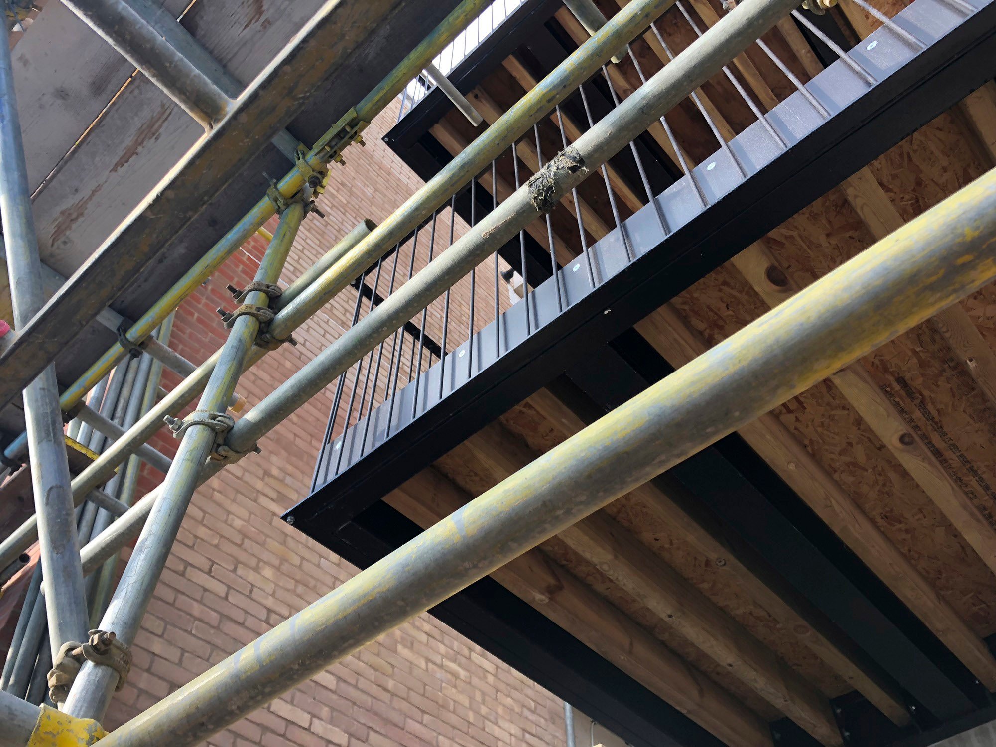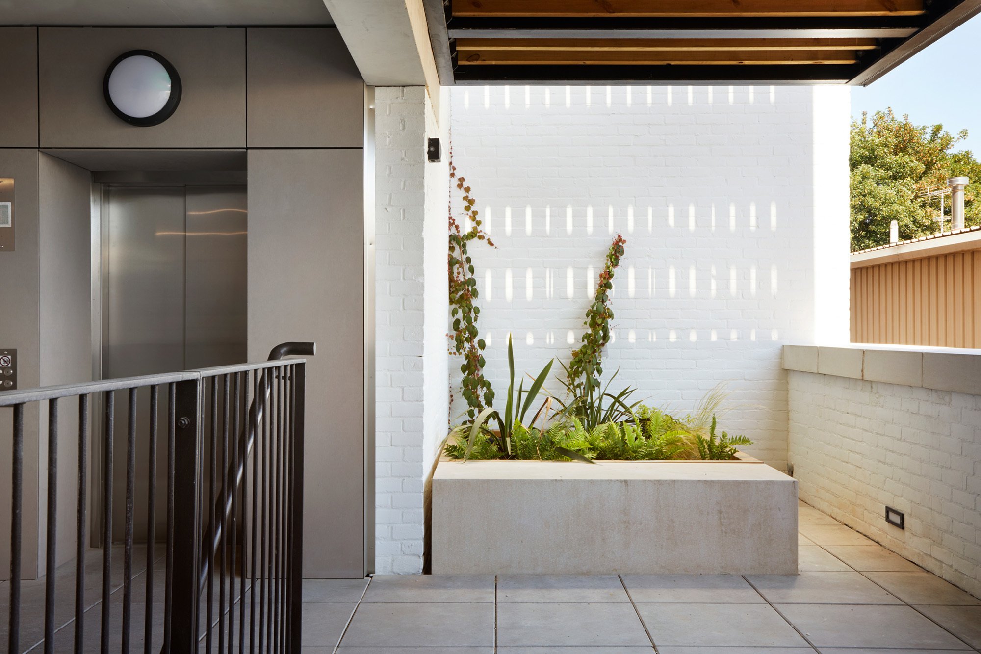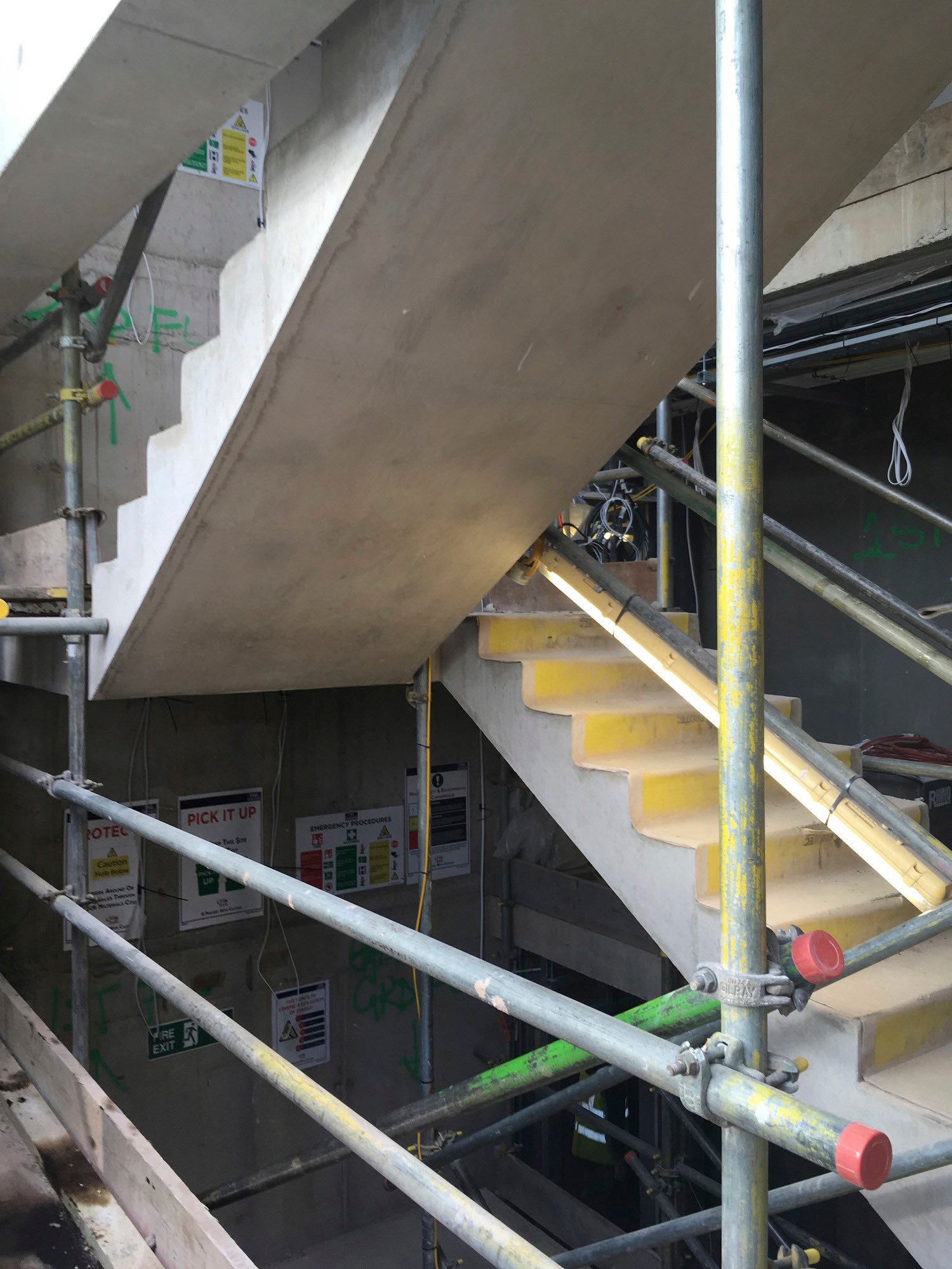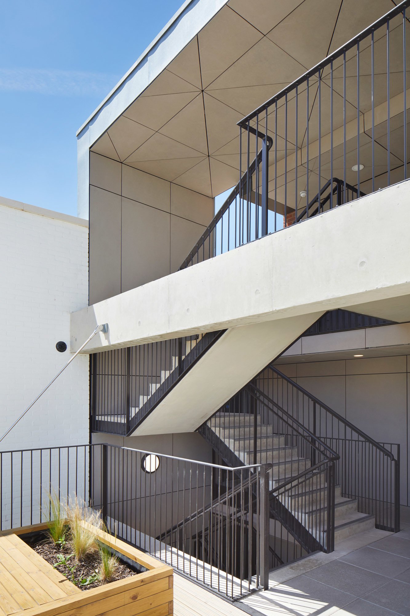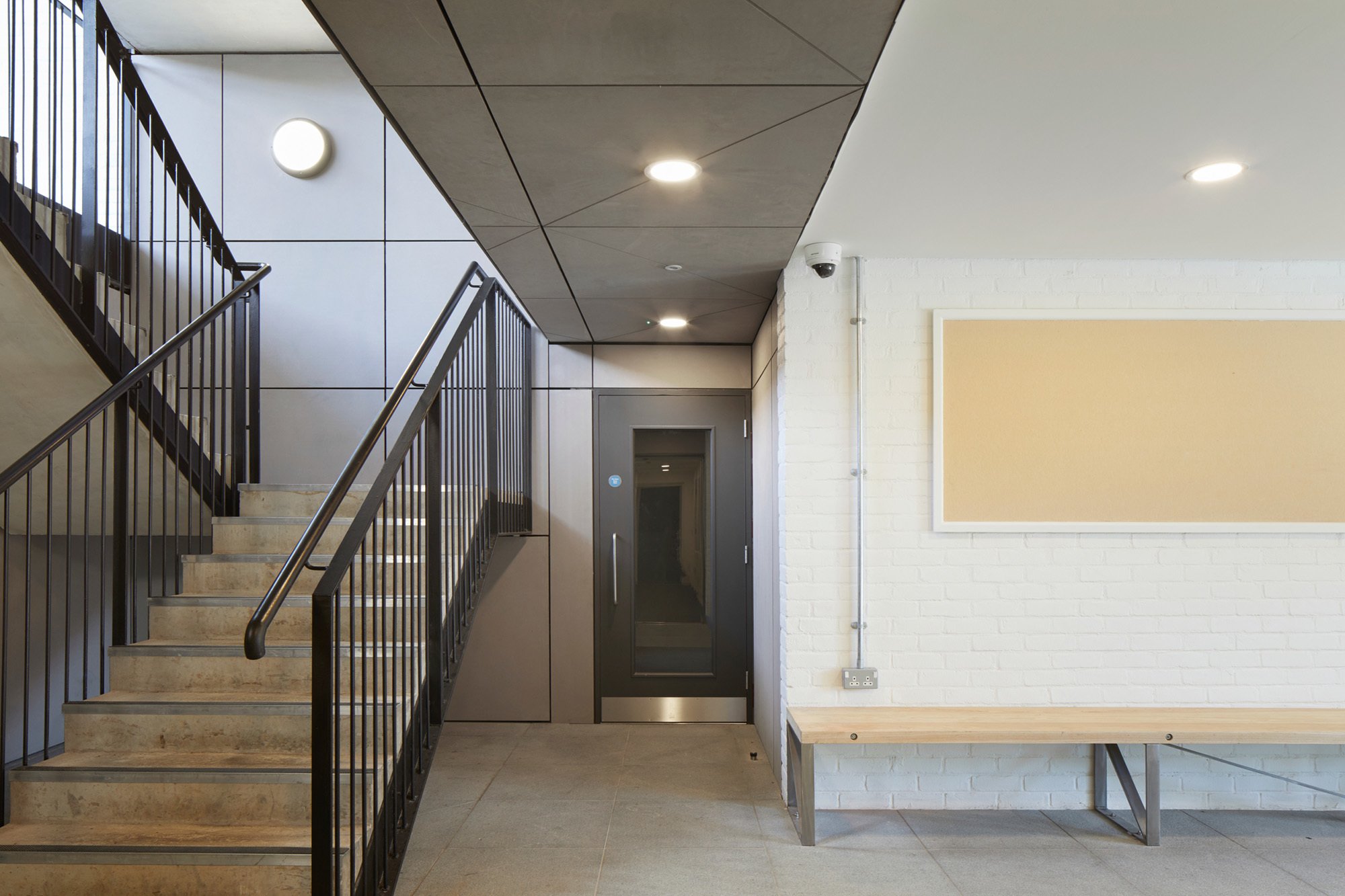 In order to provide good external amenity at each level, the main staircase has been opened to the exterior to connect directly to a series of communal balconies that hang off the side of the exposed concrete frame, and leads to a large south-facing roof terrace with planting and fixed seating. Whilst still covered from the elements, the opening up of the stair allows good levels of natural light into the heart of the circulation spaces.
