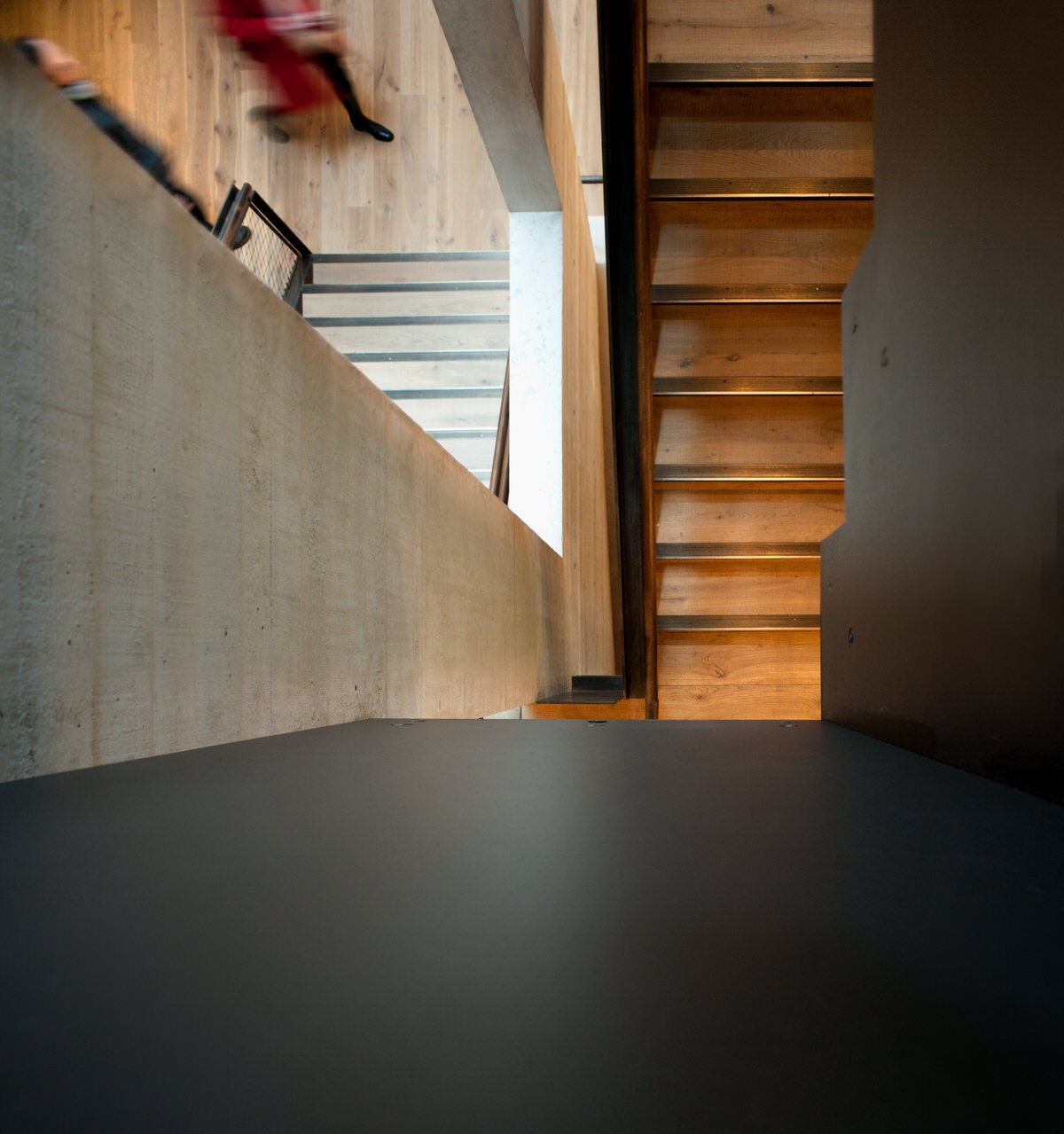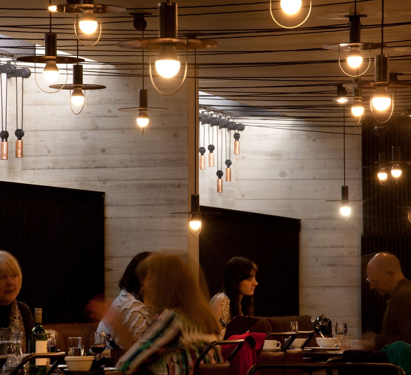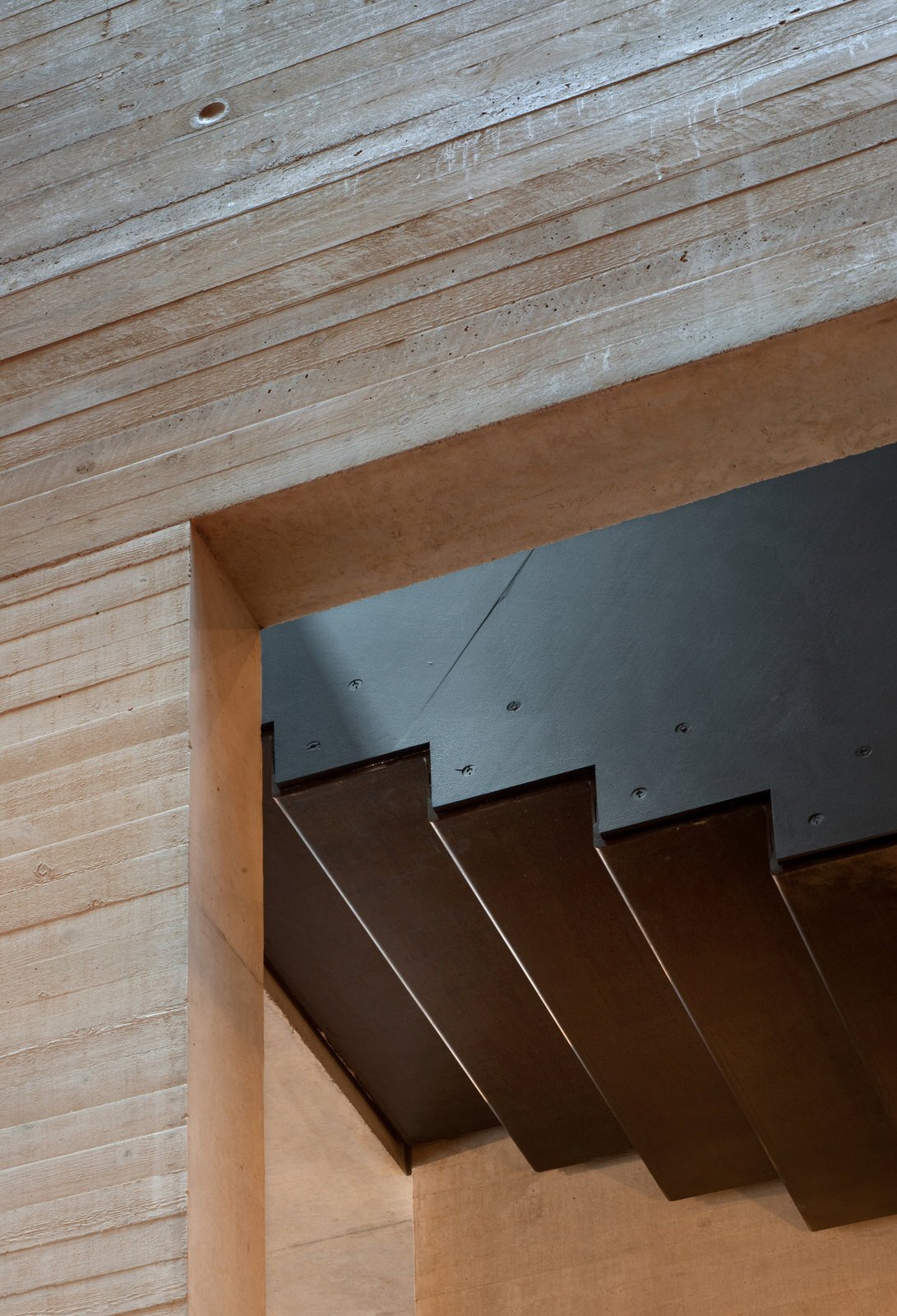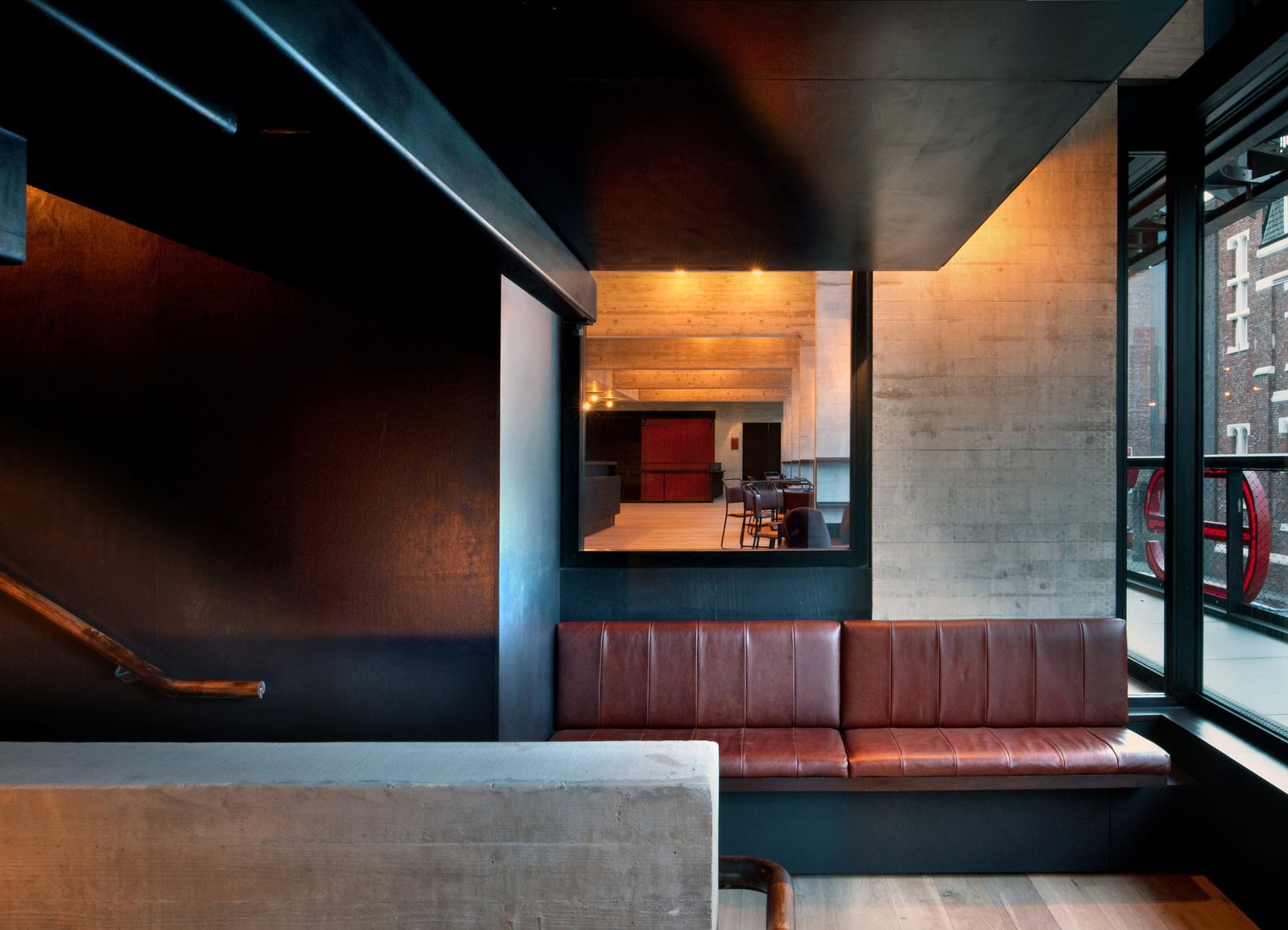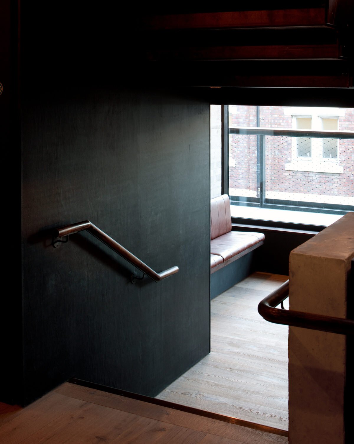 Artist Antoni Malinowski painted the main foyer ceiling to complement an internal palette of reclaimed brick, black steel, oak and reclaimed iroko, richly coloured plywood and pale in situ concrete which extends throughout both the public and back of house areas.