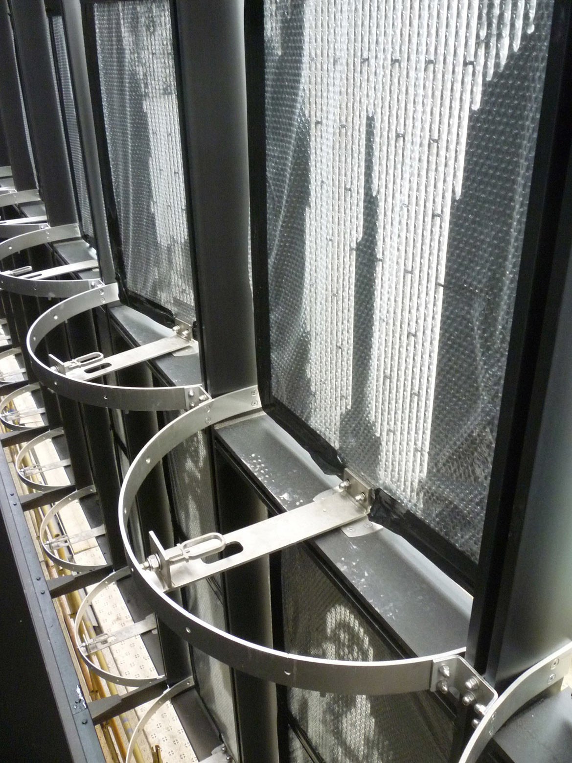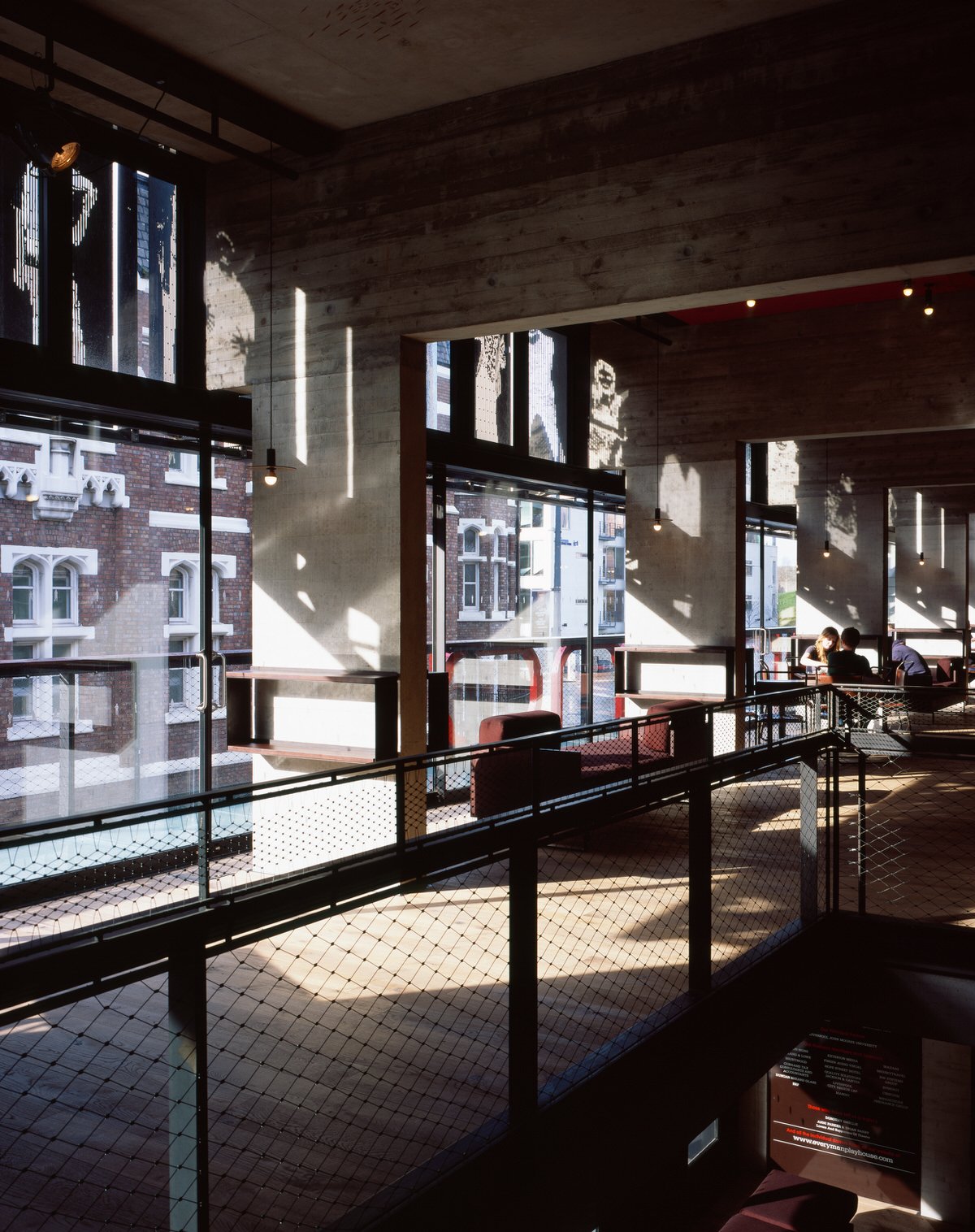 The building achieves unusual levels of energy efficiency through natural ventilation and high thermal mass, assisted by a main west facade of moveable sunshades.