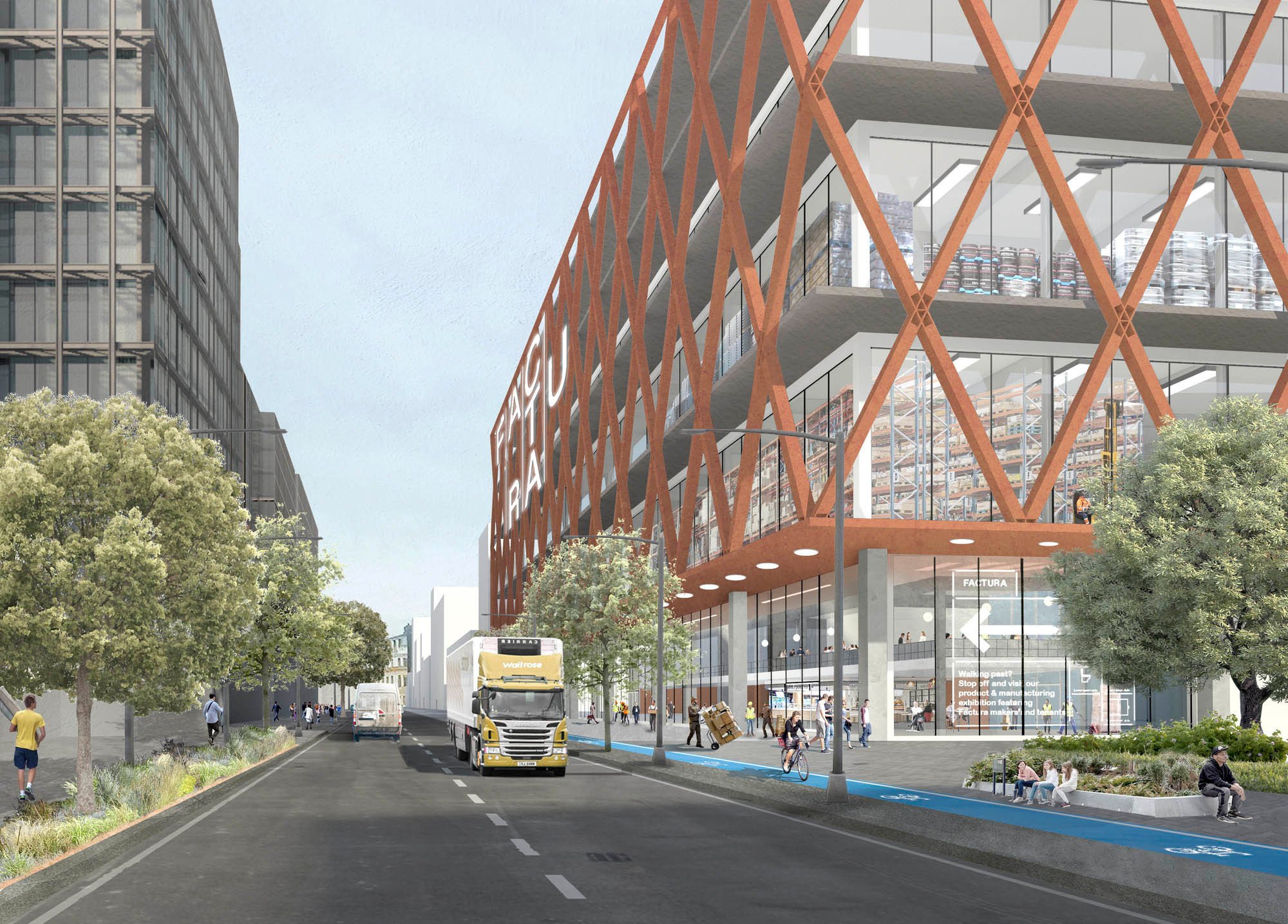 Factura provides a flexible framework for a wide range of businesses and users, from heavyweight production and logistics on the larger scale lower floors, through tech, workshop and New Industry, up to lighter studio, maker space and innovation uses on the upper floors. All of these are serviced by two large banks of goods lifts from a ground floor vehicle yard, with shared reception, business hub, food court, gym and rooftop amenity providing active frontage and engagement with the street. The building reads visually as a series of stacked volumes at different scales, creating a powerful, robust urban form. The projecting base is wrapped in a corten lattice façade, with upper floors articulated by a horizontal brise soleil, incorporating photovoltaic array across facades and roof to maximise on-site generation for electric vehicle charging.