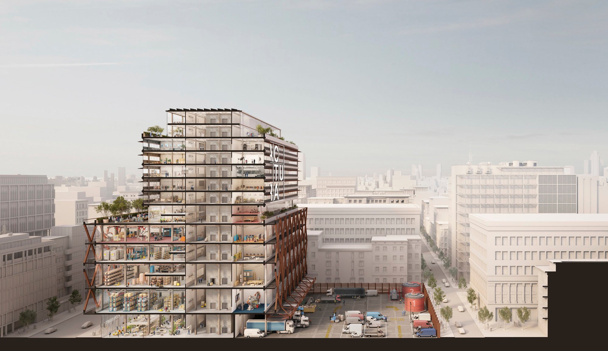 For the manufacturing industry, finding an affordable space in a big city is becoming increasingly difficult. Since 2011 London has lost the potential of providing some 45 million square feet of industrial accommodation to alternative uses. Vehicle access for larger manufacturing and distribution uses often leads to solutions with high infrastructure costs that are only viable on large, out of town sites. With developer L+R, Haworth Tompkins have been developing an urban prototype - a Vertical Factory - that works on a smaller footprint, to unlock the potential of tighter urban sites and provide localised, micro factory units and distribution bases that can be located closer to where customers are. The proposals are for an innovative flatted factory development which provides 65,000 m2 of large format, stacked, flexible, industrial workspace for 1,500 occupants across 13 floors.