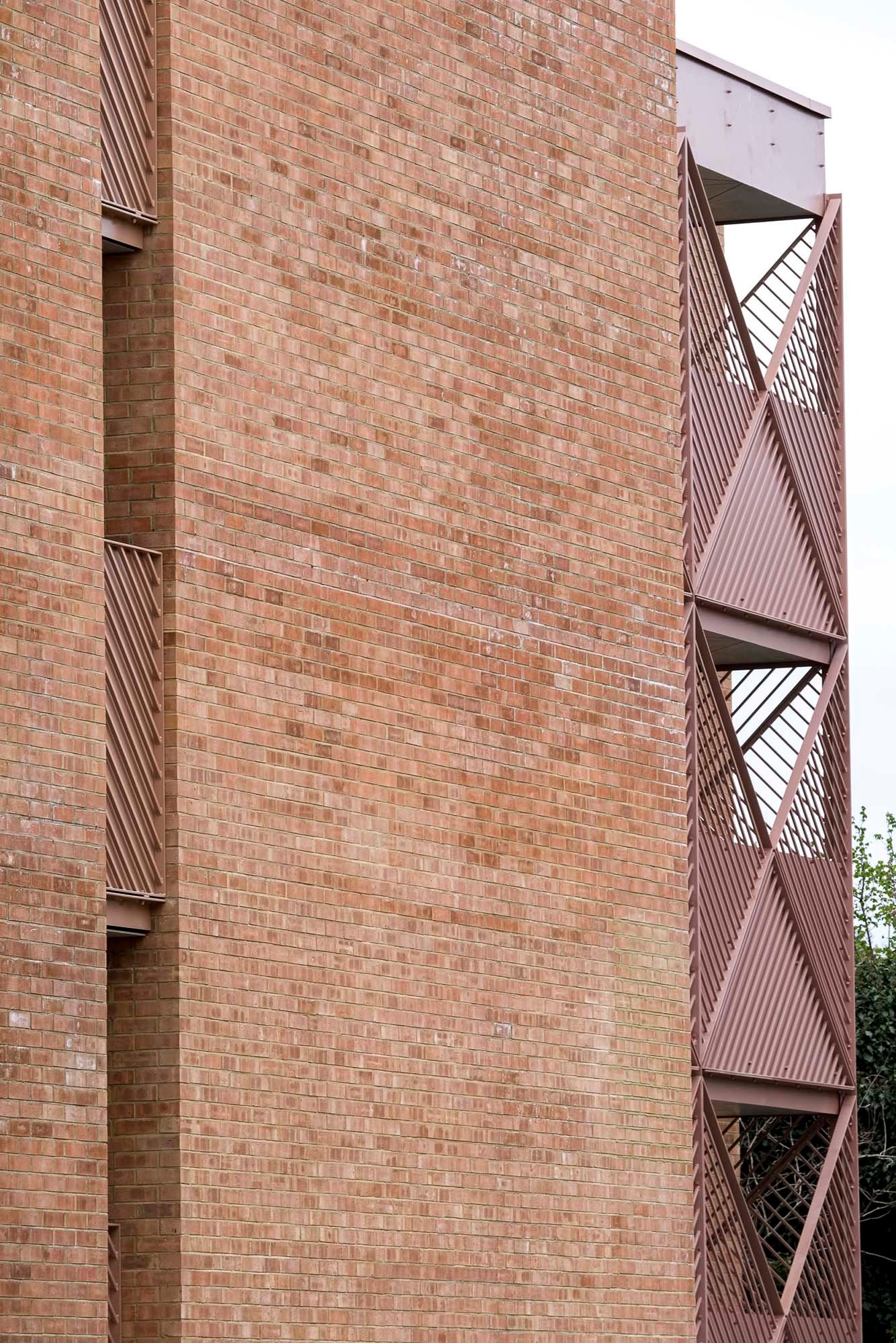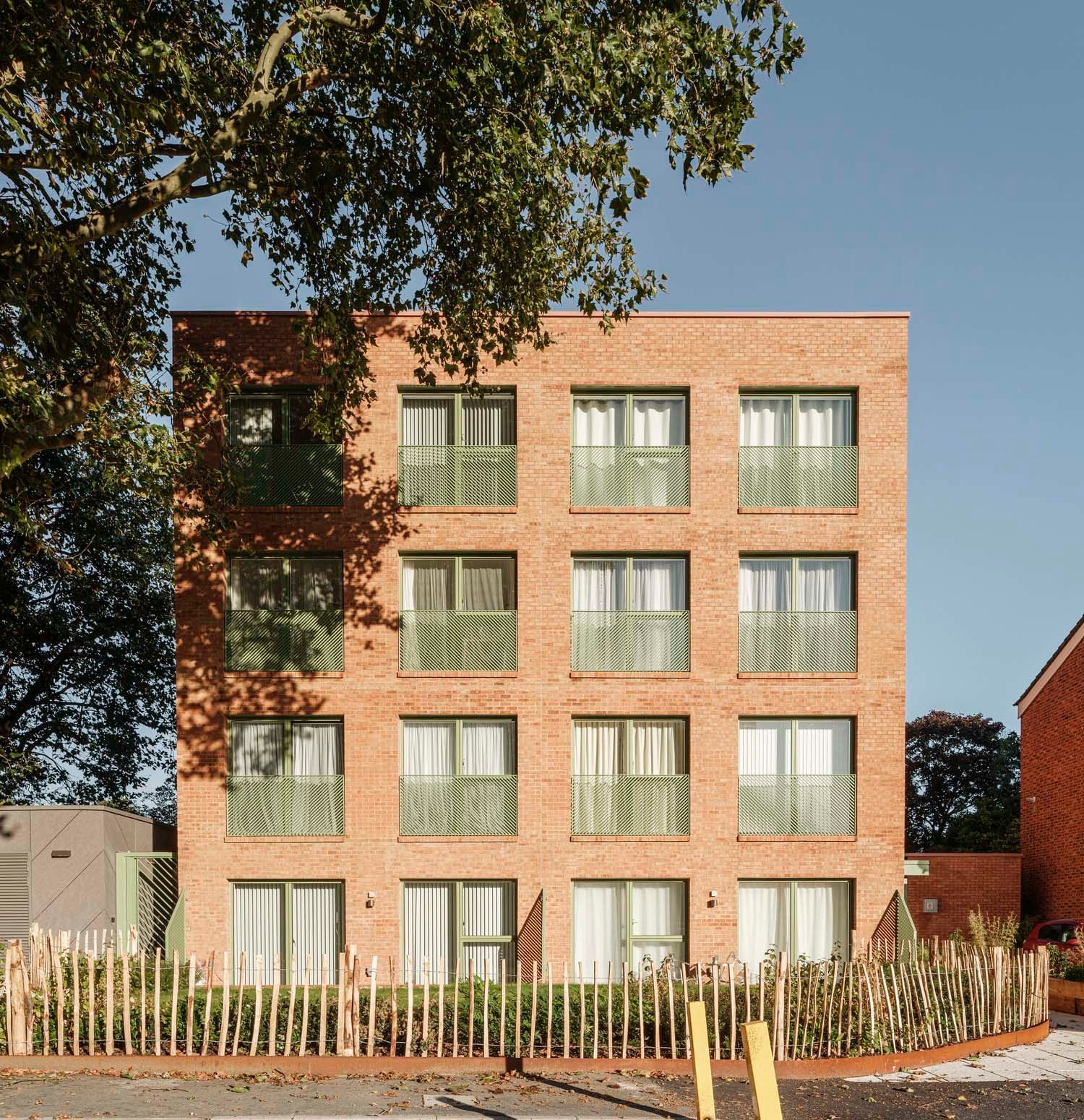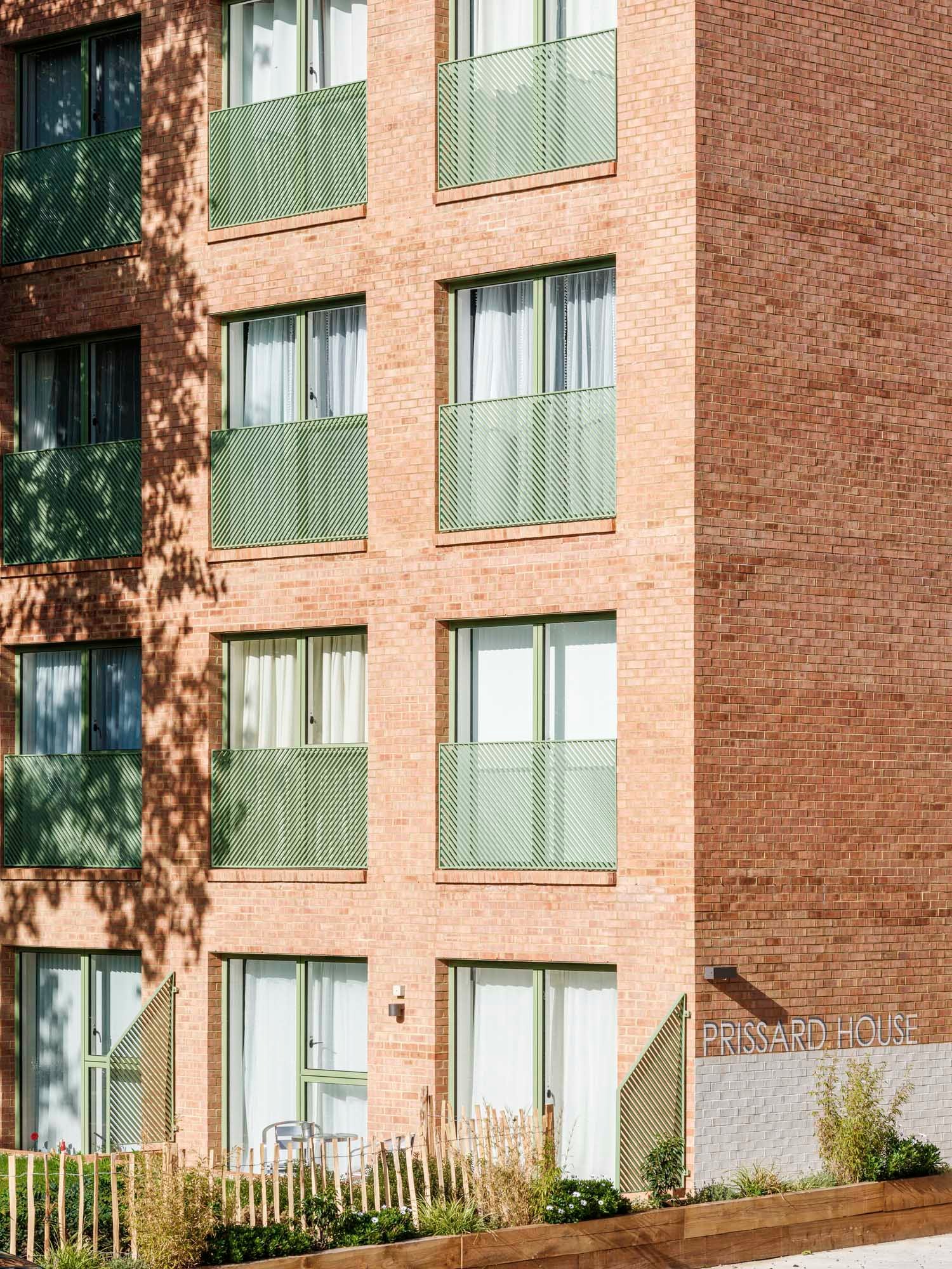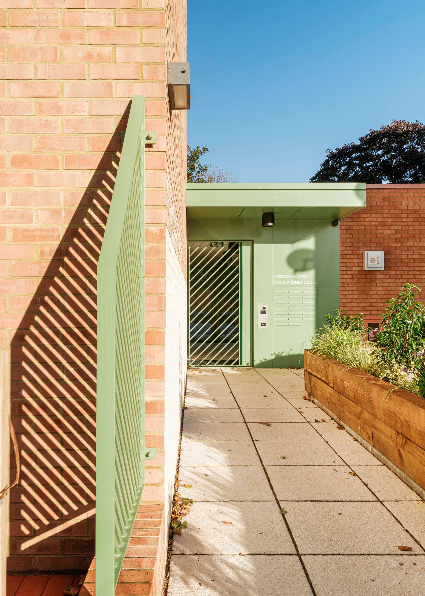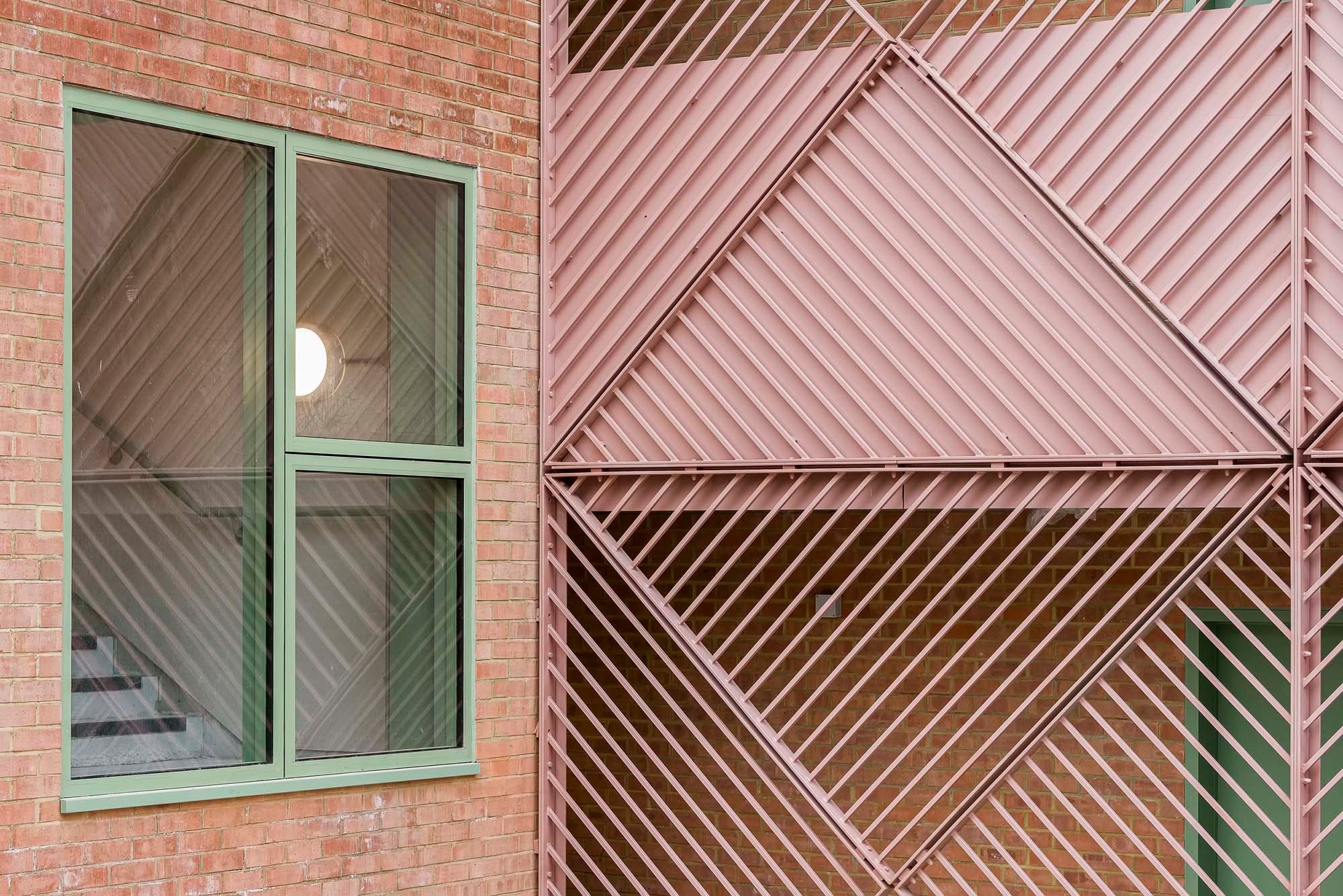 Green window frames reference those of The Shrubbery Building, a 1930s Grade II listed apartment block located to the north of the site. Pink metalwork screens the external galleries, and is matched to the colour of the brickwork. We innovatively utilised the gallery screen to perform a number of roles included providing privacy, protection and as a trellis for climbing plants.