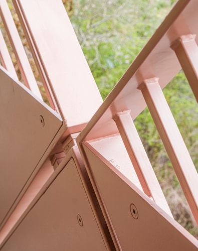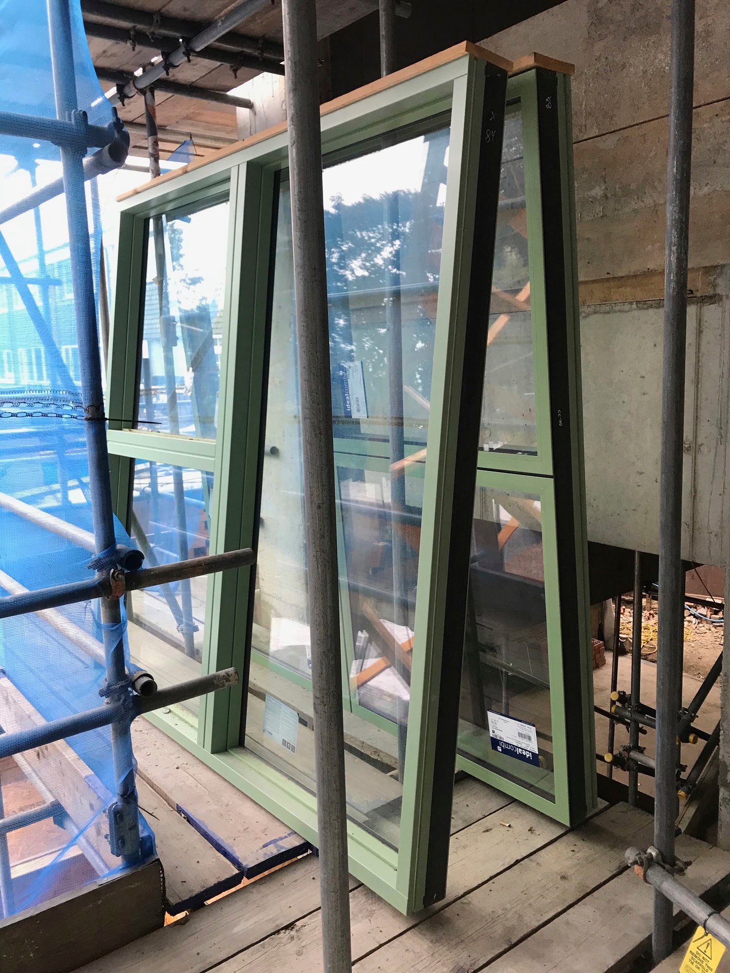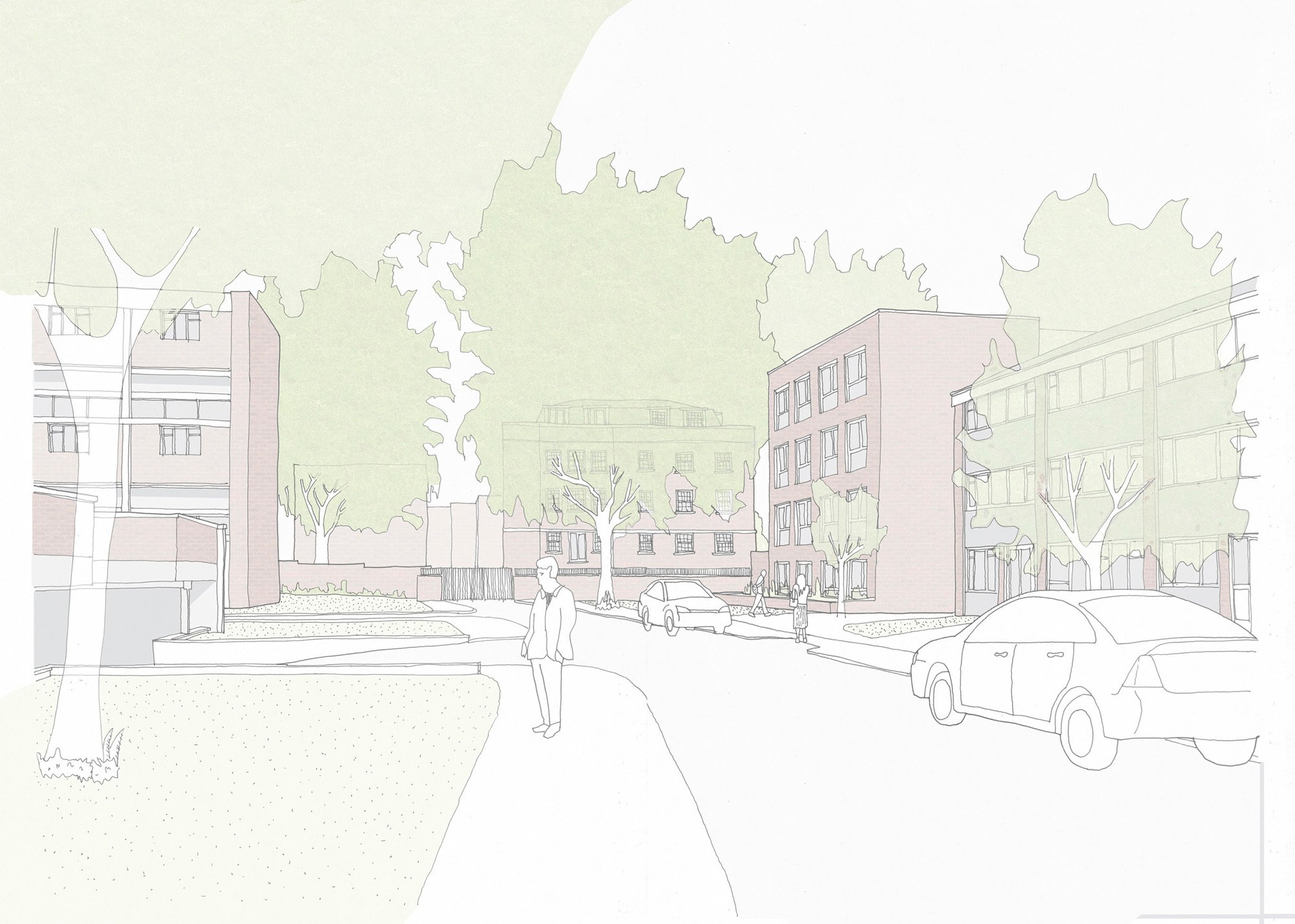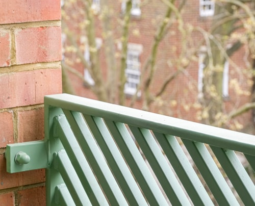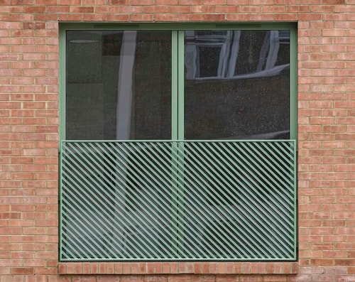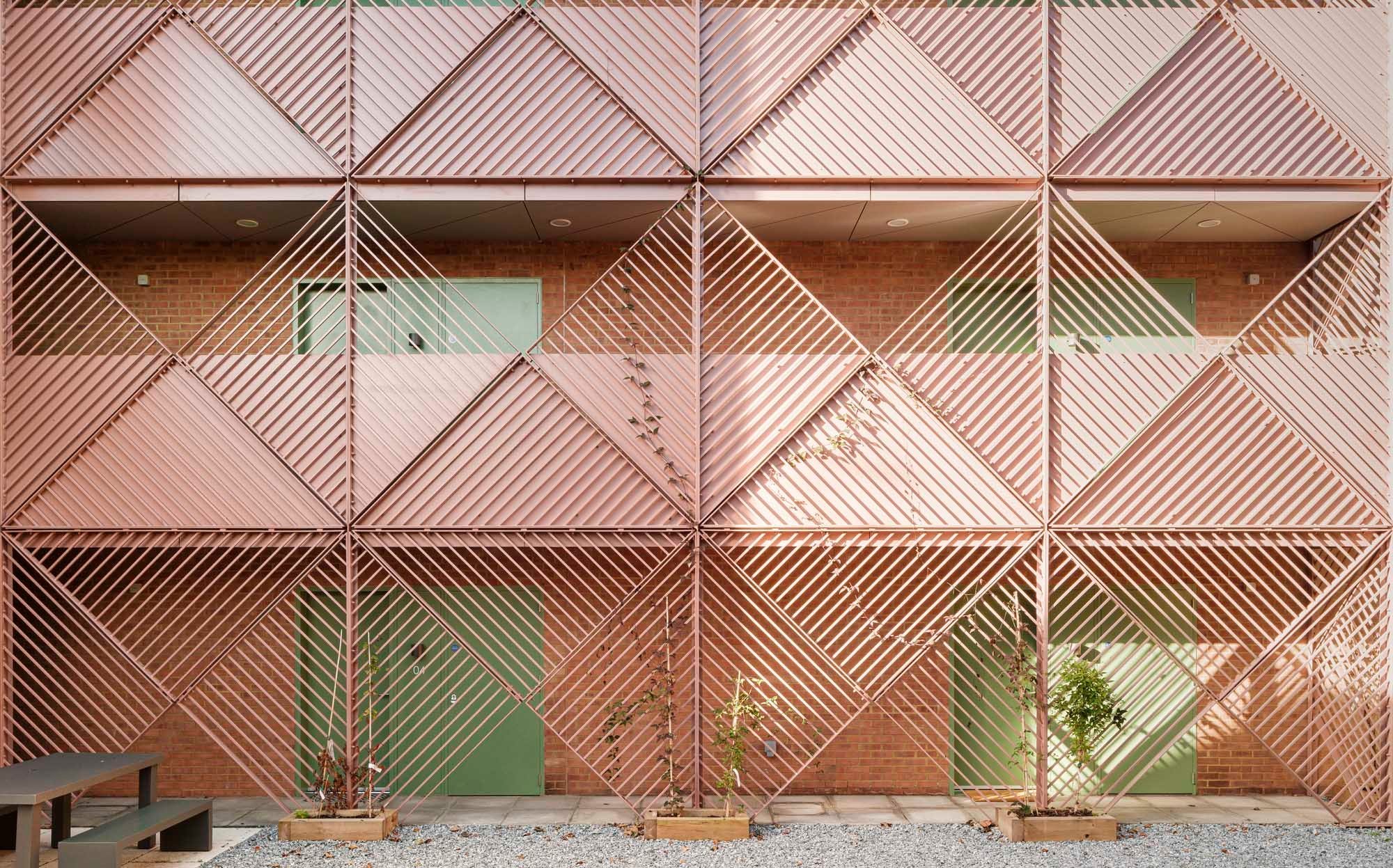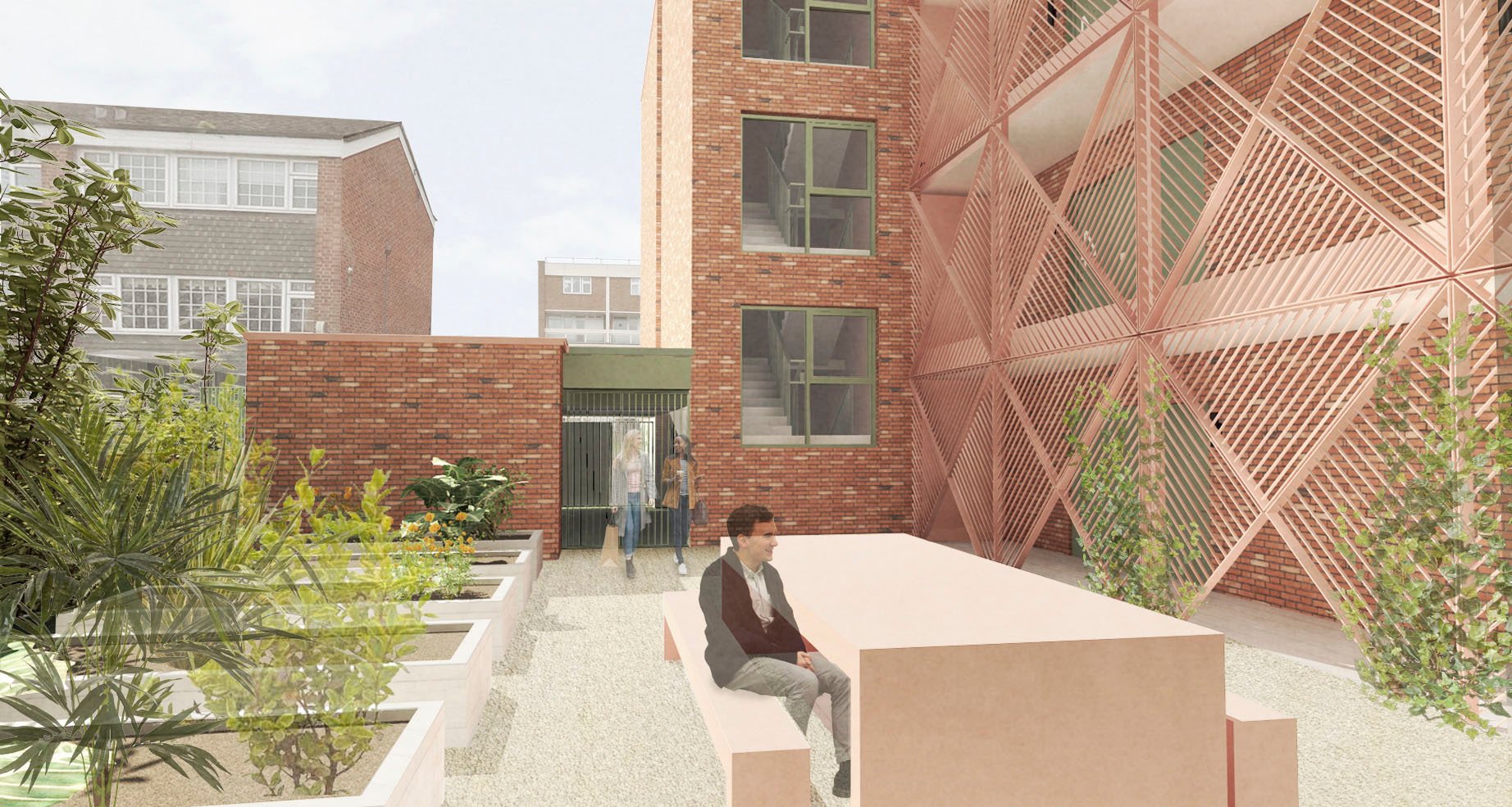 Green window frames reference those of The Shrubbery Building, a 1930s Grade II listed apartment block located to the north of the site. Pink metalwork screens the external galleries, and is matched to the colour of the brickwork. We innovatively utilised the gallery screen to perform a number of roles included providing privacy, protection and as a trellis for climbing plants.