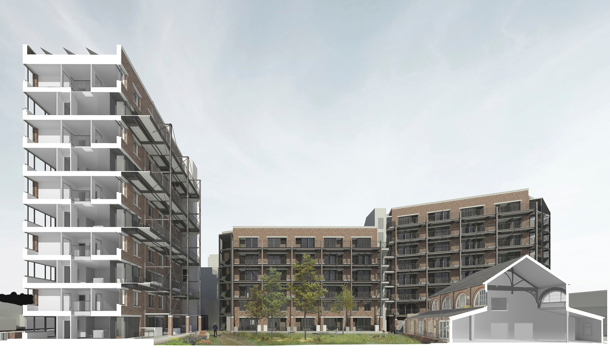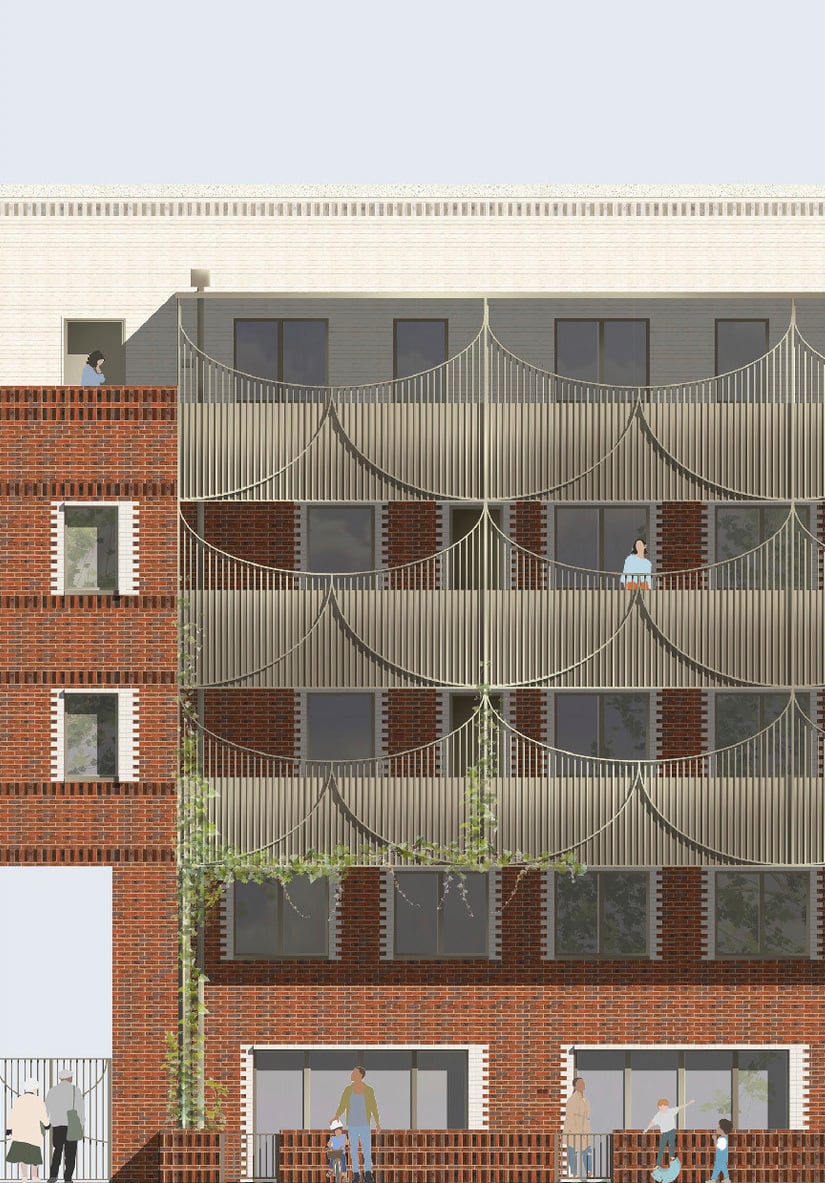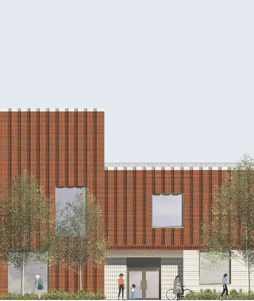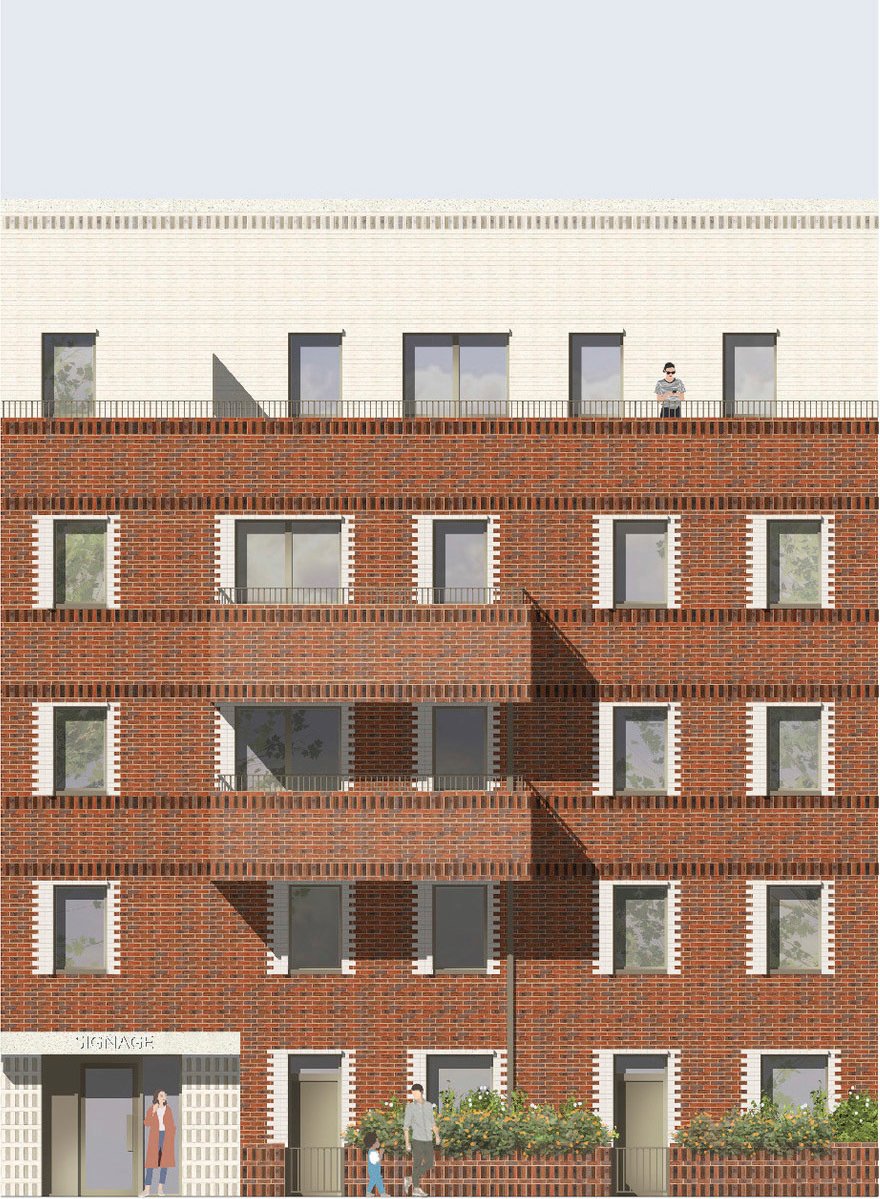 The three residential blocks range from five to eight storeys and have a horizontal expression, which is intended to make the proposal feel domestic in its character. The continuous red brick band, articulated by a projecting soldier course of matching brickwork, forms the windowsills and balconies. The brickwork detailing has sought inspiration from the surrounding buildings along High Street North and within the local Durham Road conservation area. The gym has a vertically ribbed brick texture, which visually contrasts the horizontal banding of the residential elements and celebrates it as a non-residential use activating the corner.
