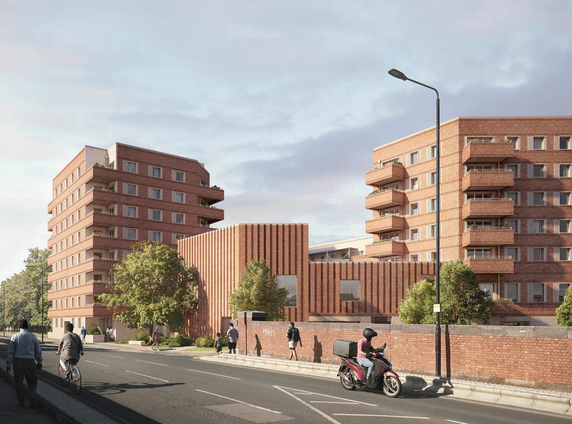 Haworth Tompkins are working with Newham Council to redevelop the Greenhill Centre Site in Manor Park, north London. The gym which currently occupies the majority of the existing site, will be reprovided onsite alongside 81 new homes for local people, all of which are allocated as affordable. The scheme has welcoming and high-quality residential entrances and a generous central communal garden enhanced by the existing mature trees on site.