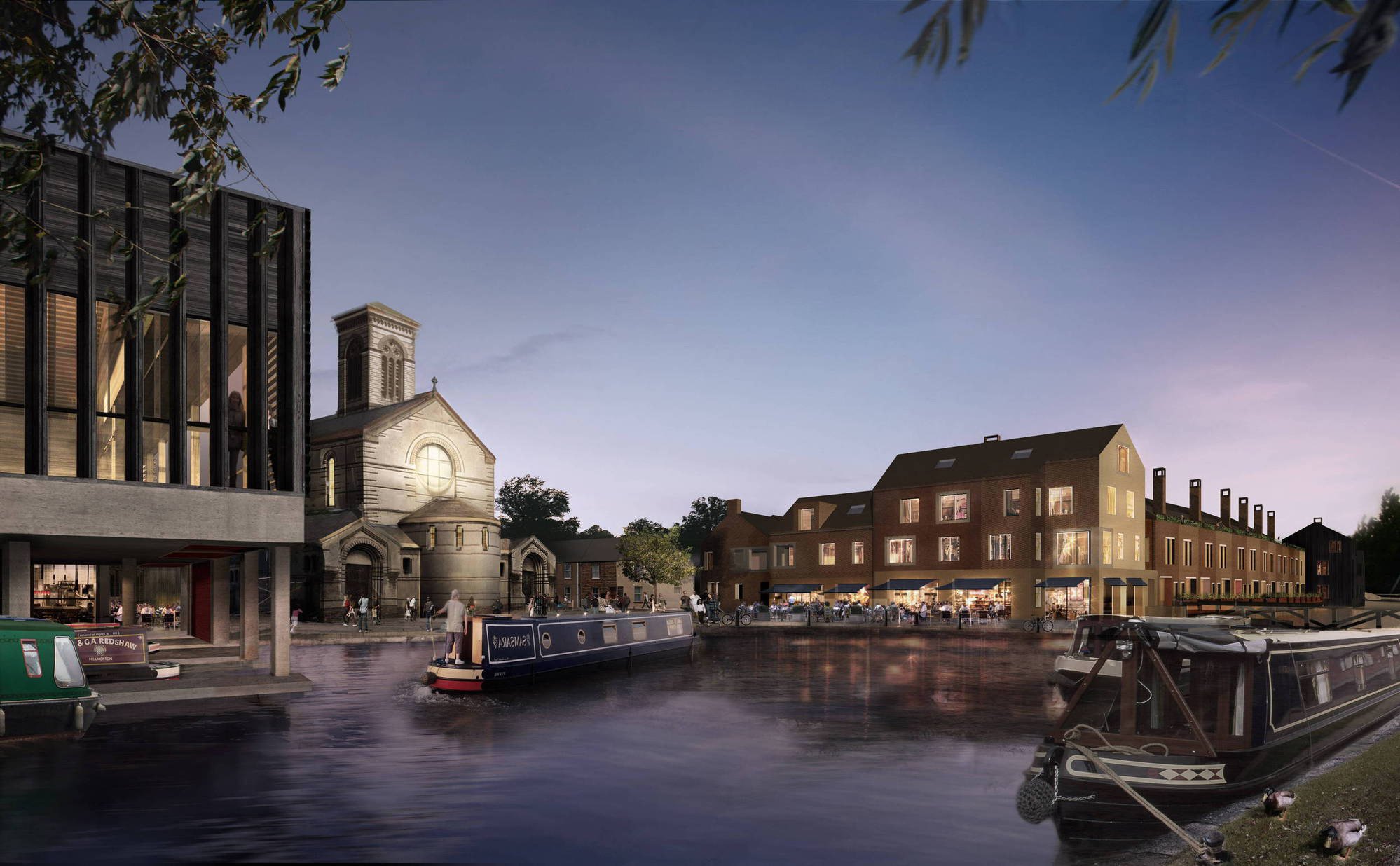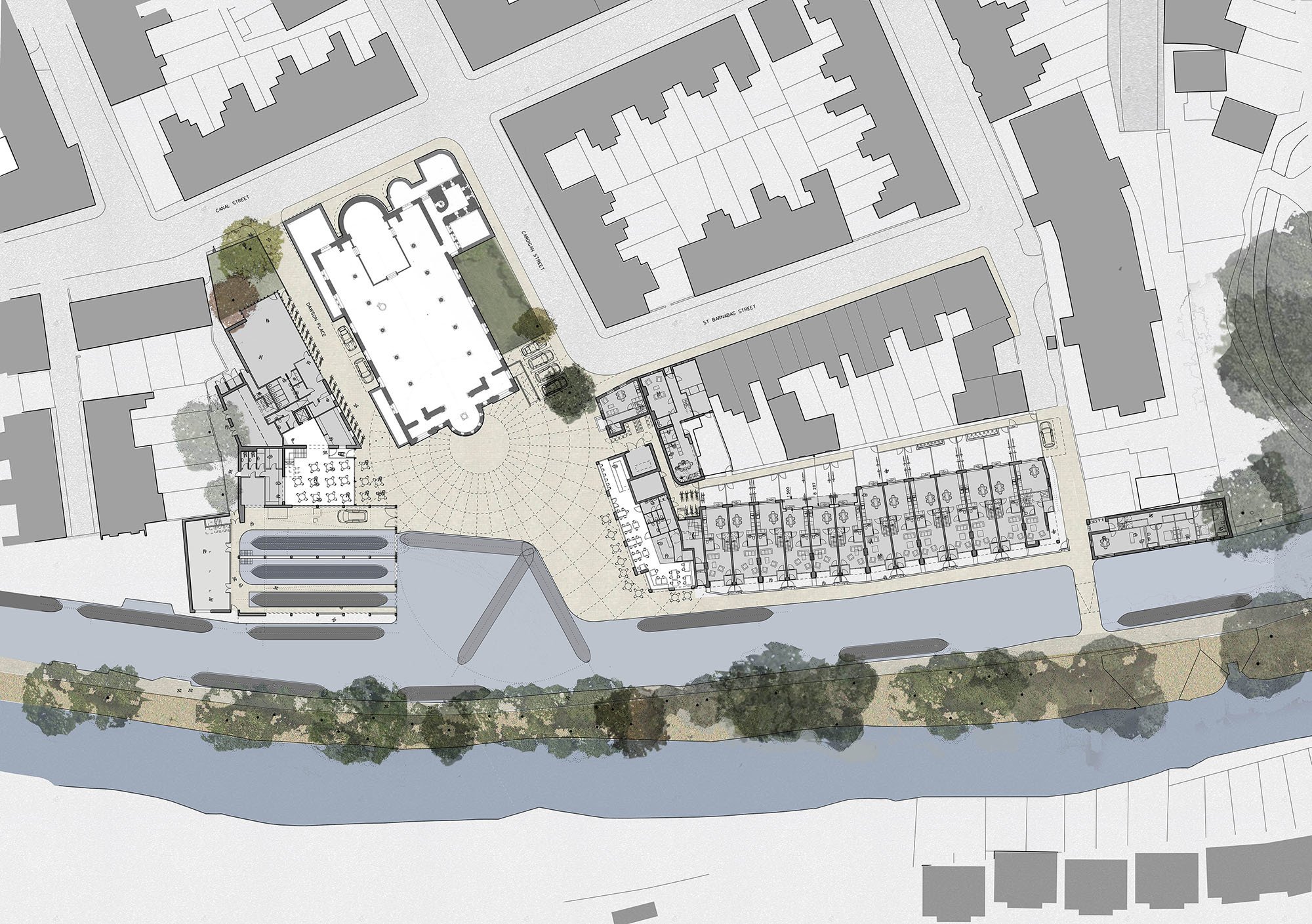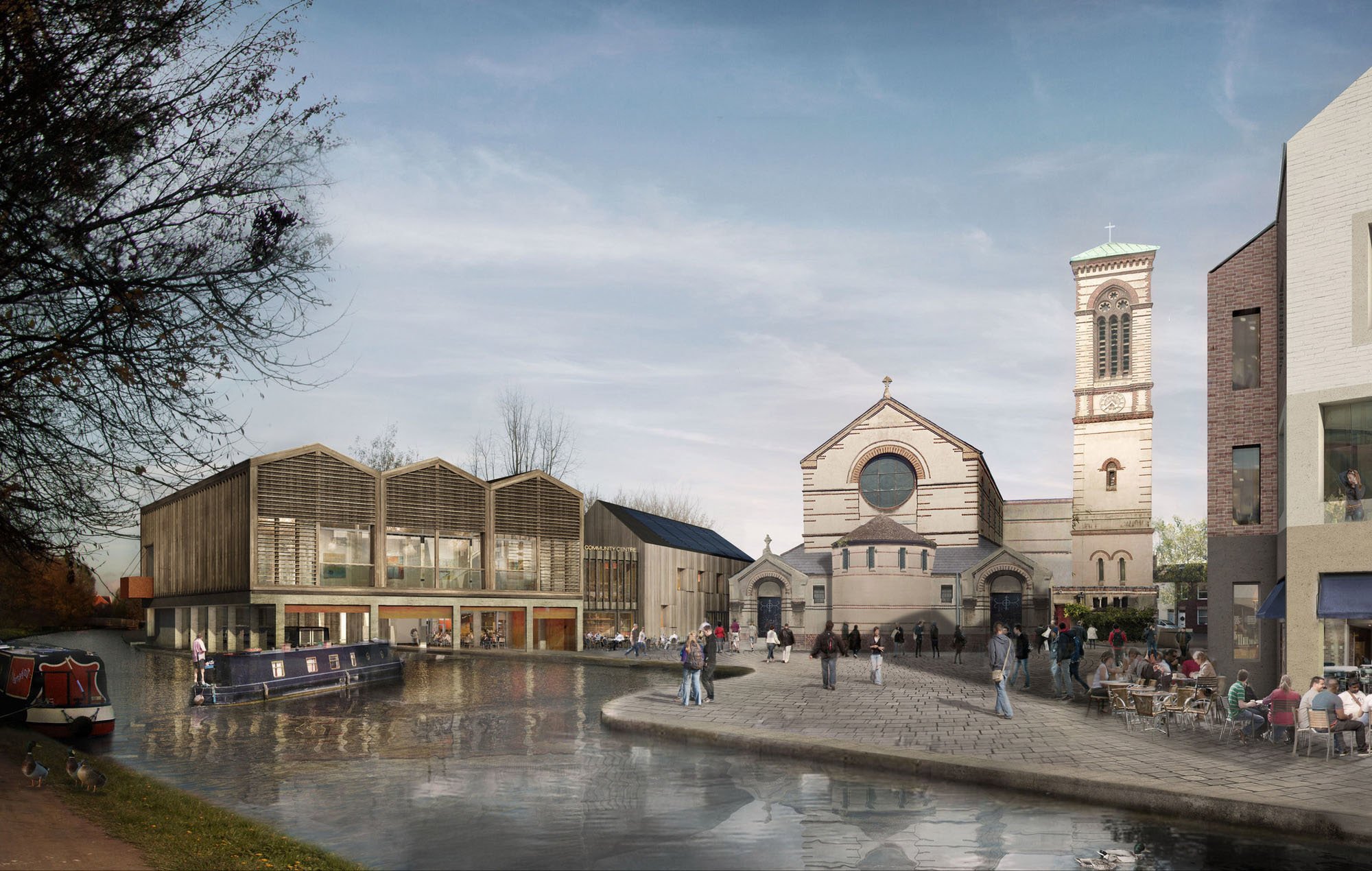 The proposals provided a new public square, a community centre with cafe, exhibition space, multi-use halls, meeting rooms, a pre-school facility with outdoor play space, a community boatyard; a small commercial restaurant; affordable residential apartments overlooking square and private houses along a new stretch of canal towpath, with a footbridge connecting the site to the railway station. Having been granted detailed planning permission in April 2016, currently the scheme has not been built and the site remains derelict.