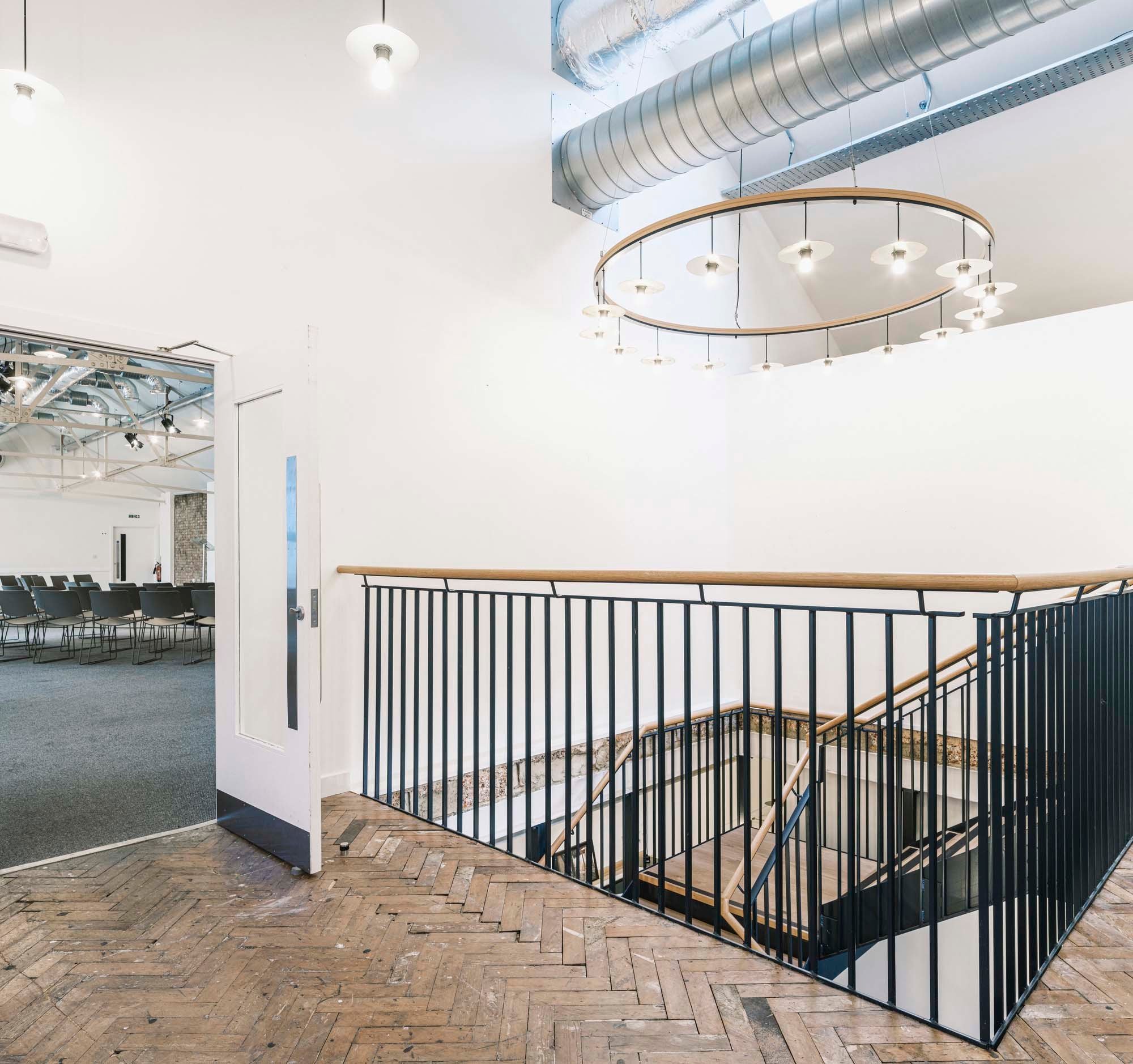 Haworth Tompkins undertook a complete internal re-organisation, peeling back years of alterations and additions. It revealed the former open plan upper floor, perfectly suited for its new use as a congregation space, providing a 200-seat auditorium sitting alongside a large open plan office space overlooking Pentonville Road. The ground floor houses a café, meeting and community rooms. Re-configured circulation improves connections between ground and first floors, with a generous open staircase linking the entrance café and the auditorium.