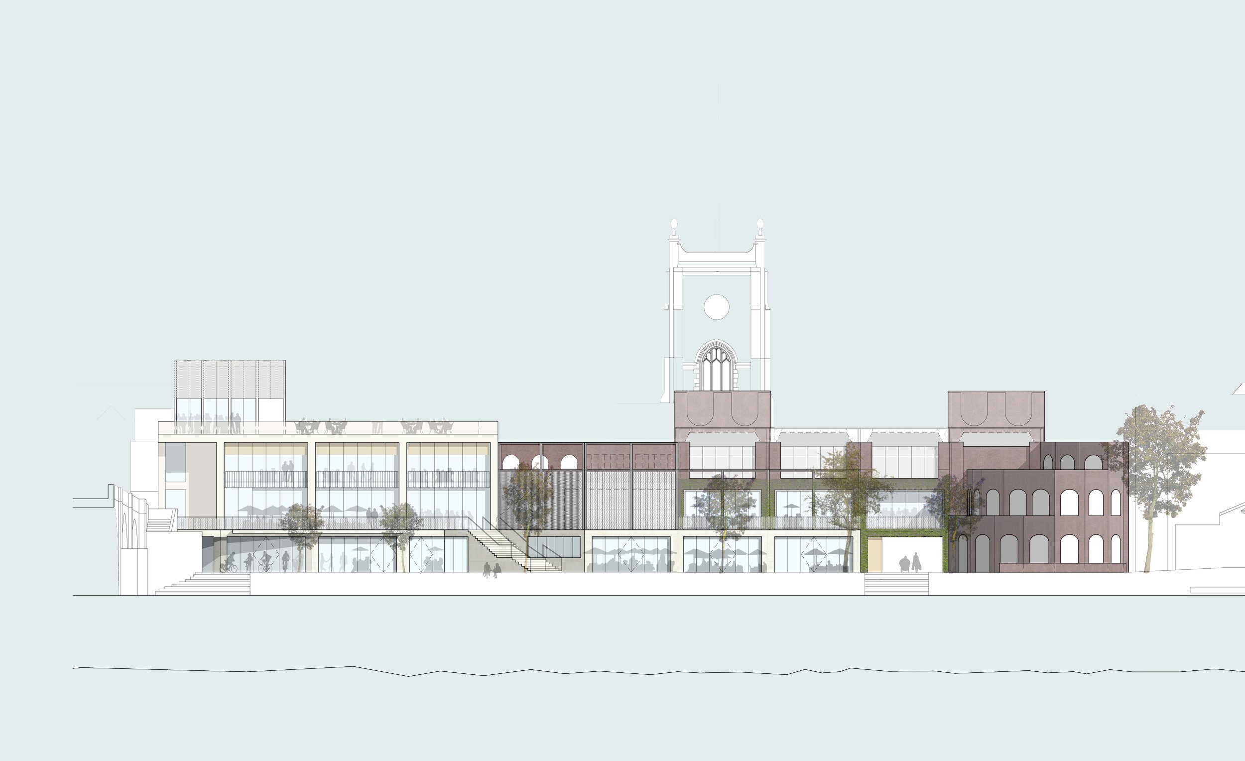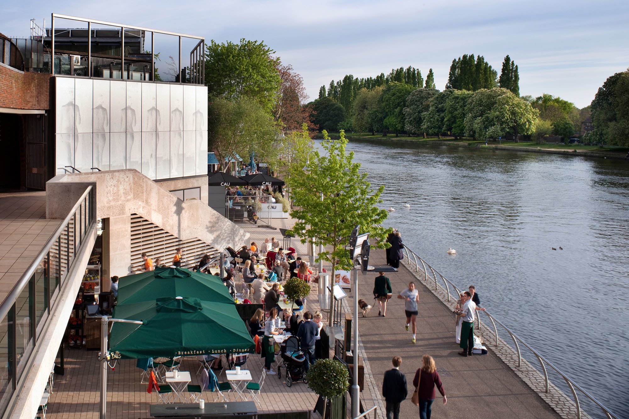 In this first phase Haworth Tompkins have capitalised on the potential of this special setting by re-orientating the building to face the river, and improving connections from the town centre to the east. These works have served to re-establish the ‘Riverside’ as a destination prior to the renovation of the rest of the building, and will allow the existing leases for the other tenants in the upper levels to run their natural course.