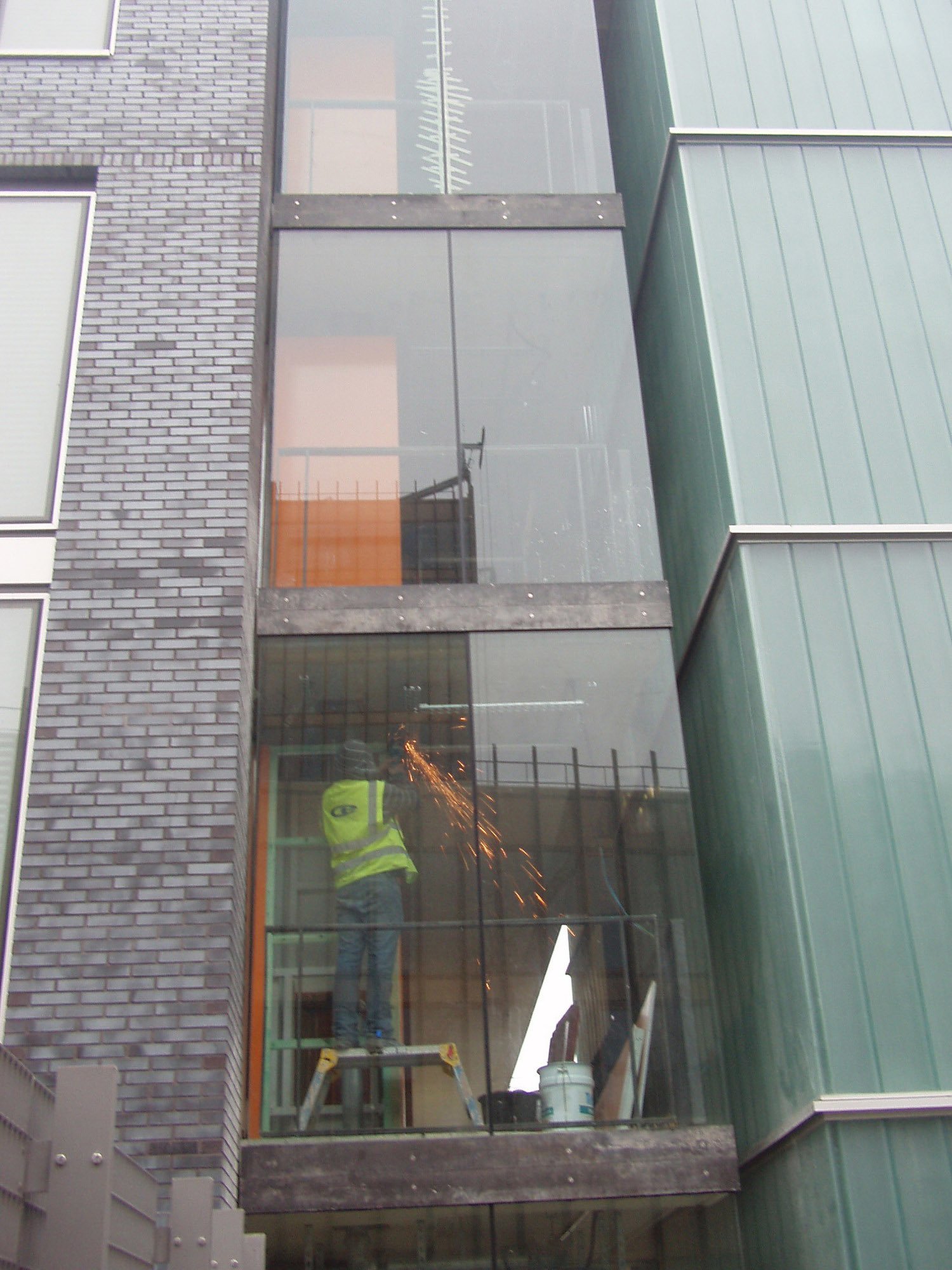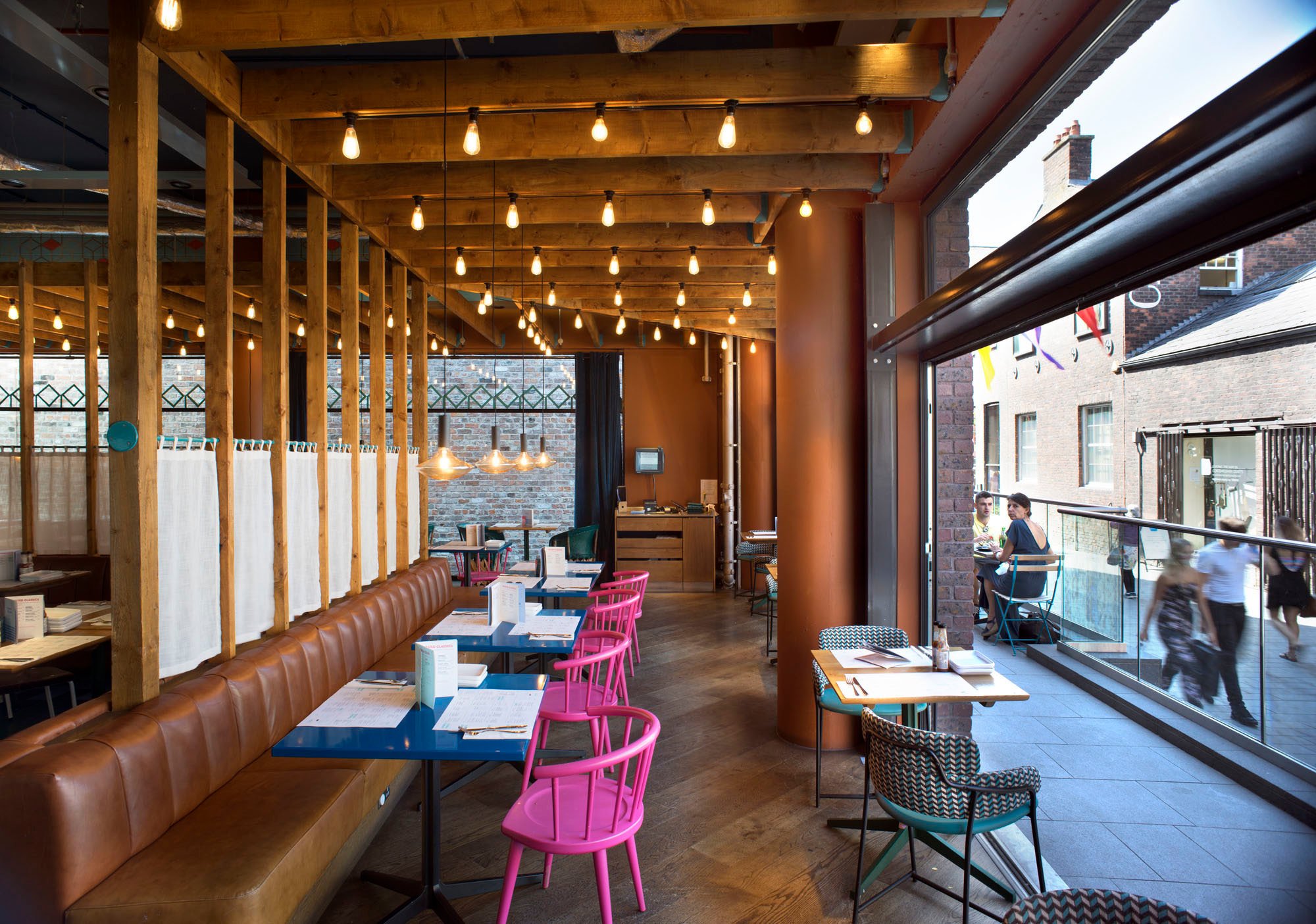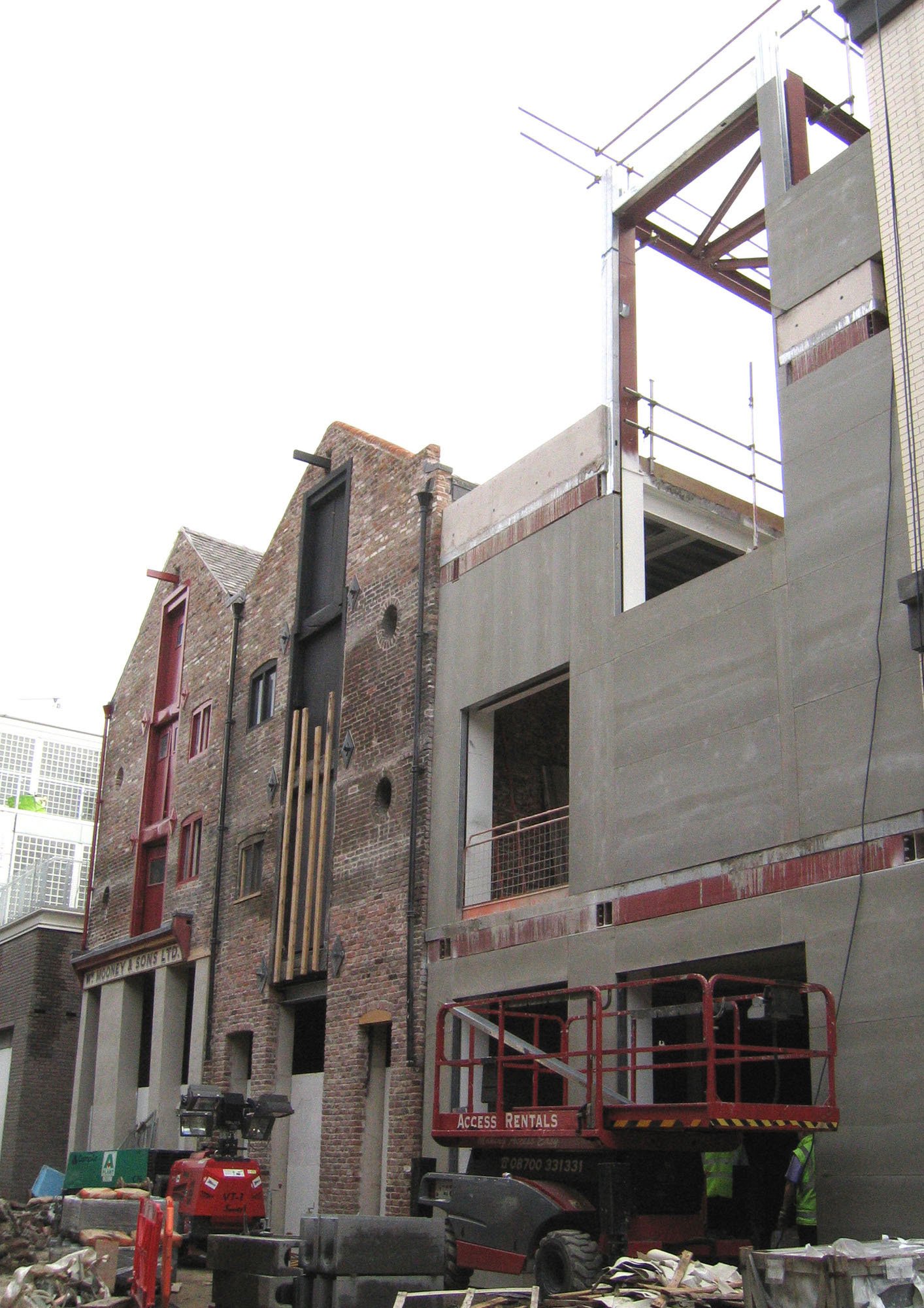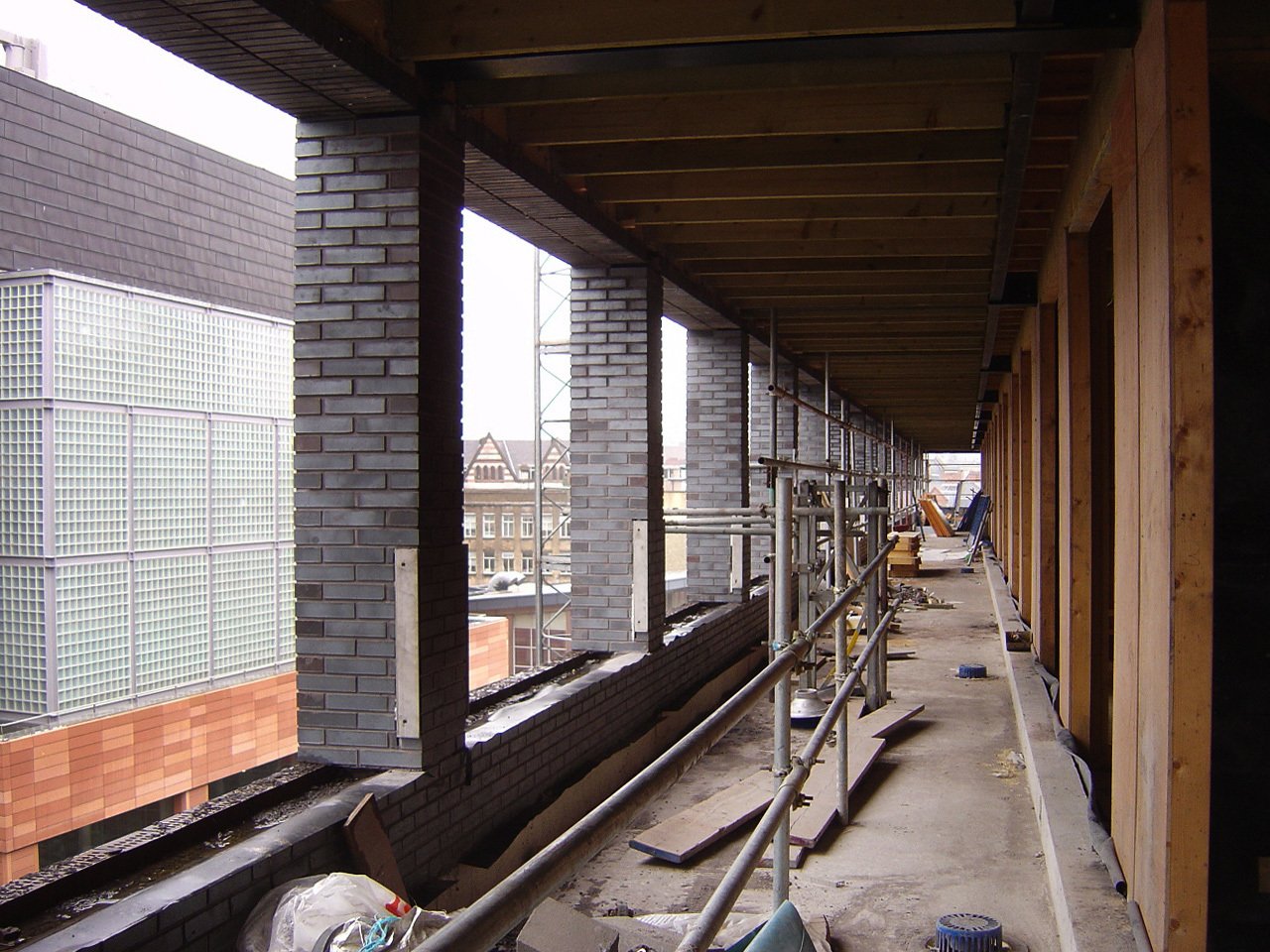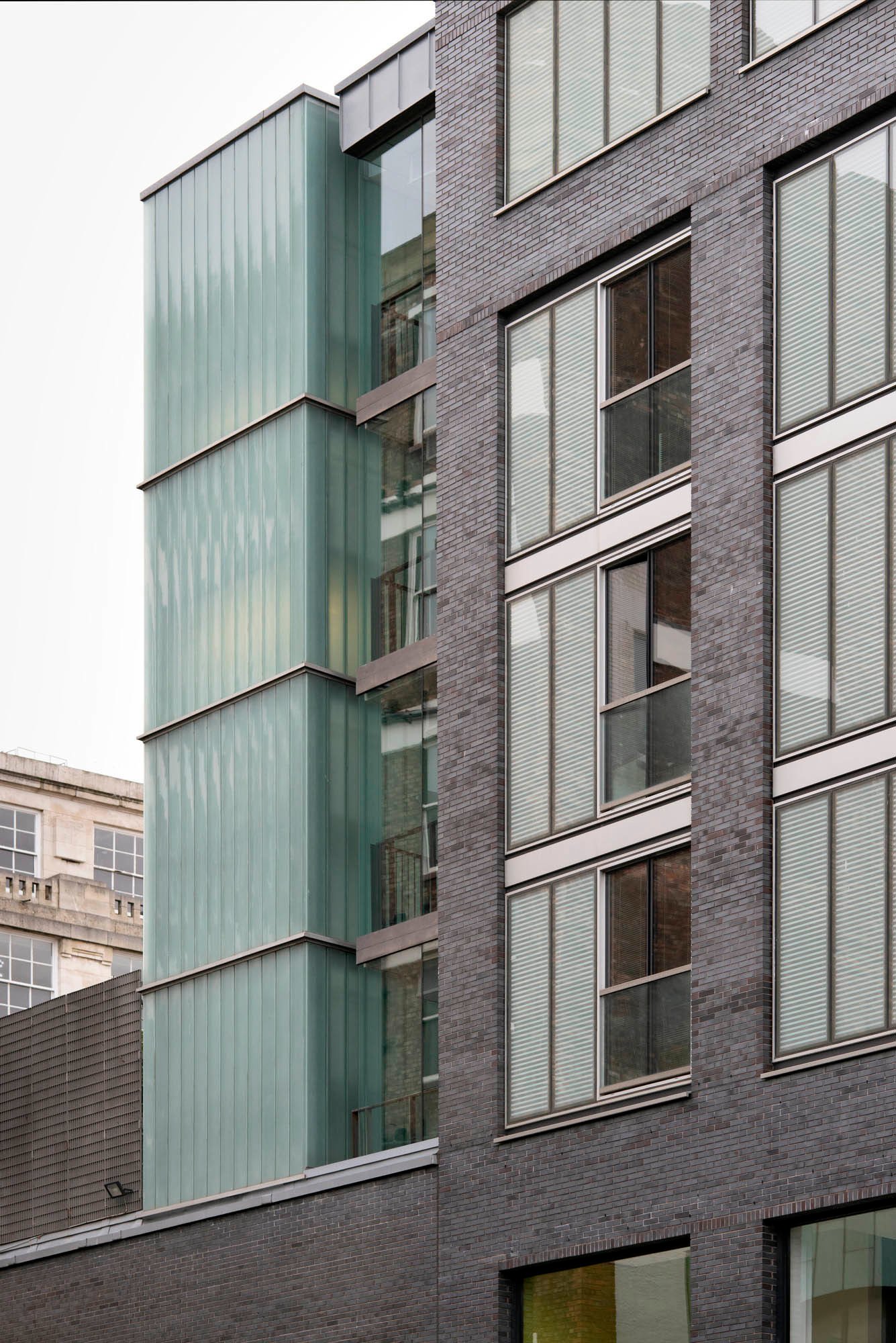 The site forms the apex of a triangular urban block formed by the junction of two very different urban contexts: Hanover St and College Lane. Along Hanover Street, the new trabeated brickwork facade and projecting roof lanterns responds to the scale and character of the robust warehouse buildings to the south of the site. On College Lane, the building is set back to create a series of faceted terraces, which respond to the scale and character of the neighbouring Grade I listed Bluecoats Chambers.