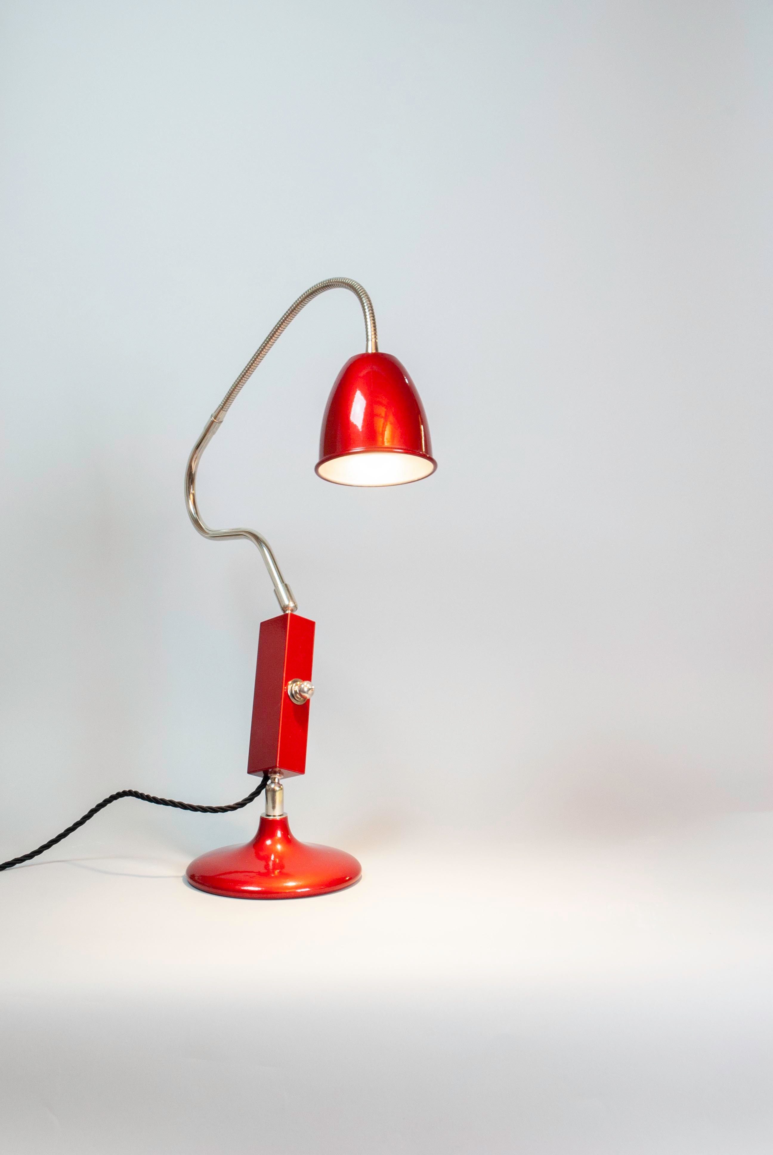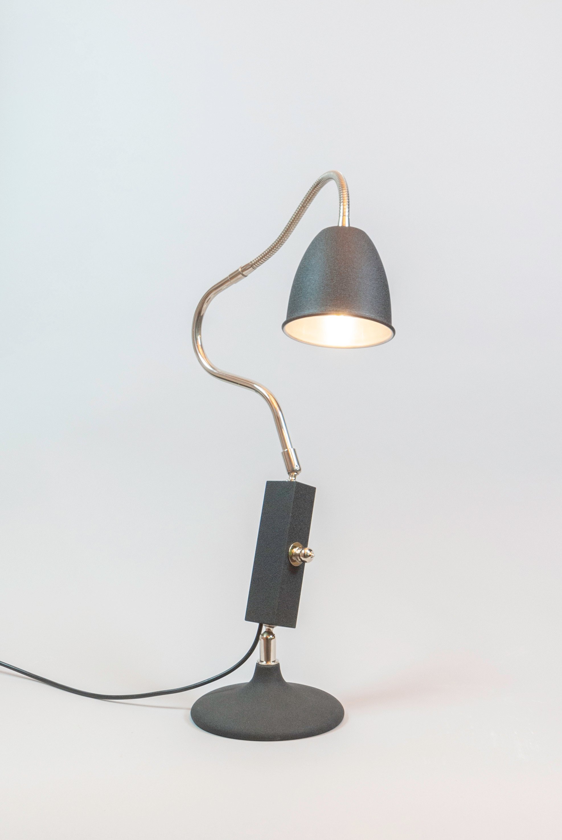 Designed by Tony McIntyre for the London Library, this unique desk lamp successfully combines the mechanics of functionality with a high-design aesthetic. The light can be shone in any direction and light levels adjusted to suit the reader. Ideal as a desk lamp, by the bedside or as a general reading light, a 6 watt high-efficiency low-energy LED bulb provides the light source and a dimmer switch adjusts light levels. Handcrafted in England, the lamp uses the highest quality materials - brass, nickel plate, aluminium - and is available in a variety of finishes. The electrical cord is made from fabric-covered plaited strands and is available in pink or black.