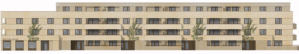 The design approach at Meeting House Lane produces a scheme that makes a dramatic improvement to the current underutilised spaces and lack of amenity around the site. At an urban level it repairs the street by re-instating a regular rhythm that mirrors the Victorian terraced housing opposite. It is a confident form with a simple palette of materials which respond to the scale and mixed character of the surroundings. The scheme provides 29 social rent dwellings comprised of nine one-bedroom, 14 two-bedroom and six three-bedroom units. The internal organisation creates a building with 100% dual aspect dwellings through the use of four cores. All wheelchair accessible units are at ground level with generous gardens and defensible space to ensure privacy is maintained.