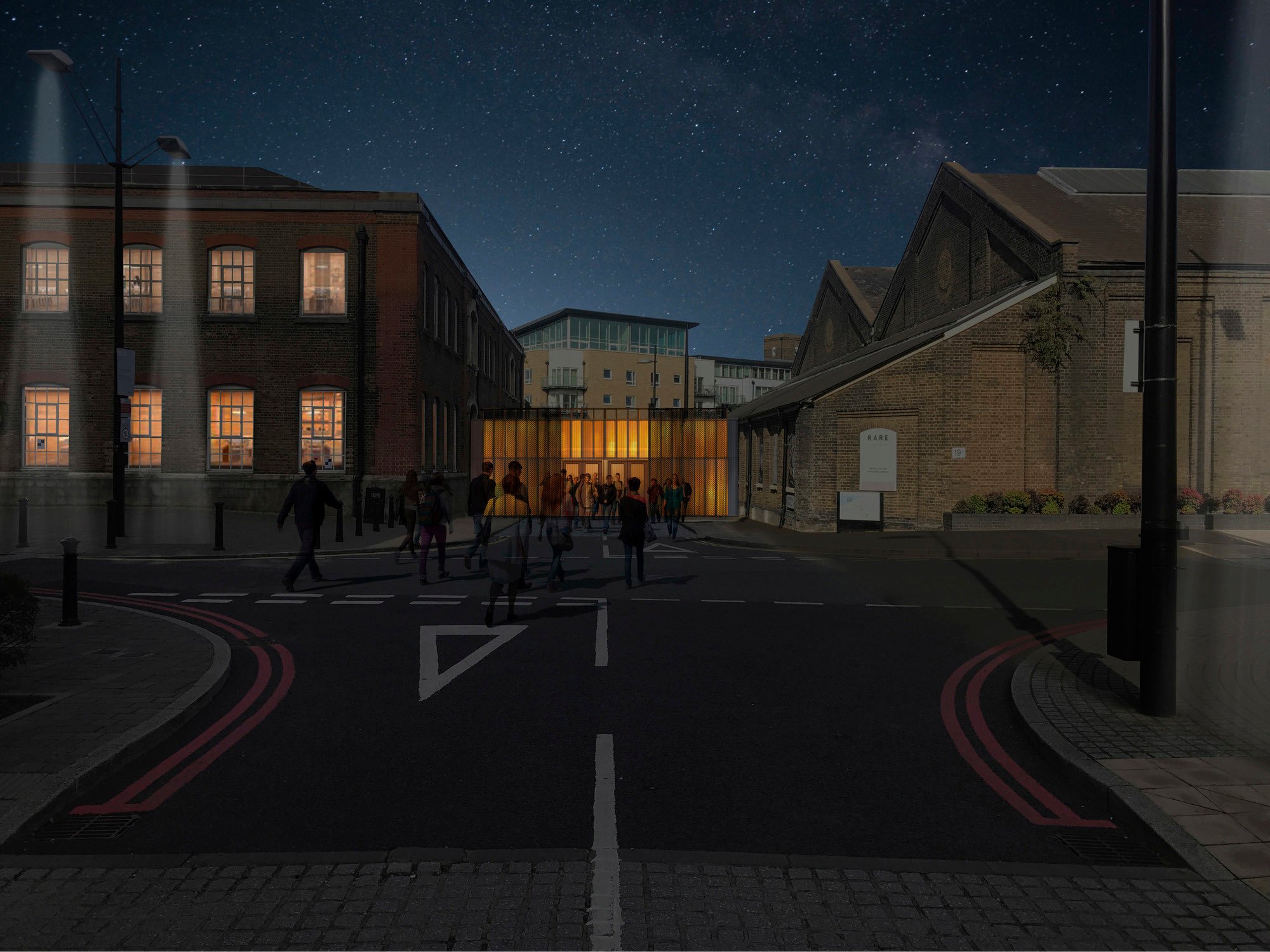 Constrained by a temporary lifespan and its connection to listed structures and uneven road surfaces, the lightweight timber framed structure is a complex negotiation of internal floor levels supported by a system of sand-bag foundations. Clad in polycarbonate with a decorative chainmail mesh cladding, the material palette for the link building acknowledges the significance of the adjacent Grade II listed industrial buildings whilst announcing itself as a convivial and welcoming destination.