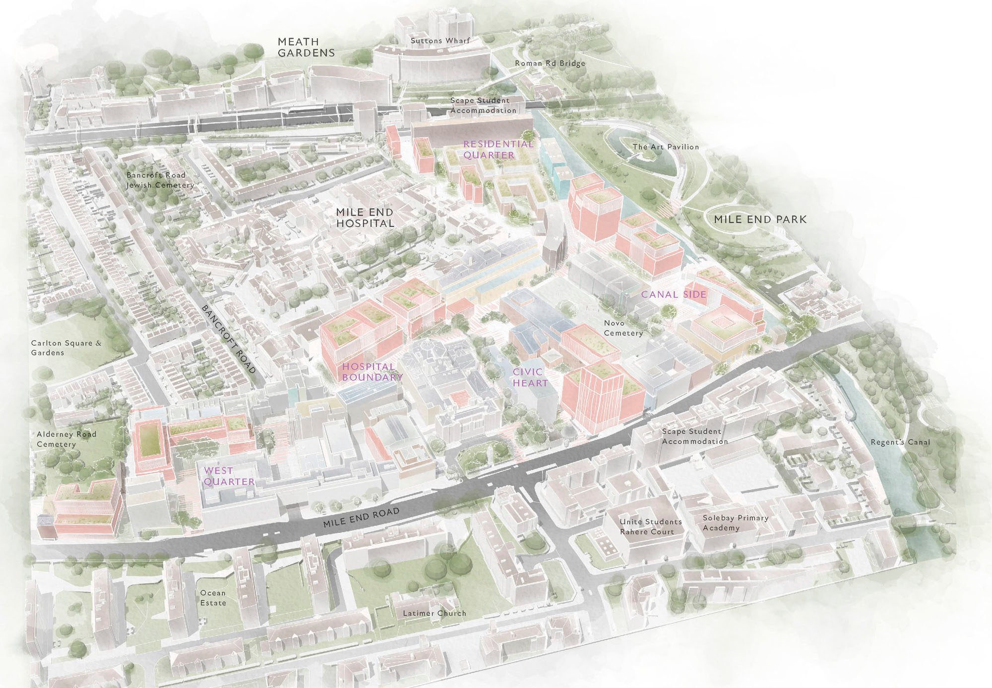 The opportunities are focused within five different zones of the campus, each with its own set of unique circumstances. Case studies explore the most significant sites for opportunities, but do not detract from the potential for future development in the remaining areas. As well as setting out the key design principles that should be followed, a case study option is provided for each development site indicating how the principles could be applied. Opportunities for the retrofit of existing buildings are also considered. The SPD supports the Tower Hamlets Local Plan and provides further detail on how planning policies should be implemented within the SPD area. The document will provide material weight in planning decisions; and will therefore help the council to evaluate individual planning applications on the campus to assess whether they are in line with the coherent growth strategy set out within.