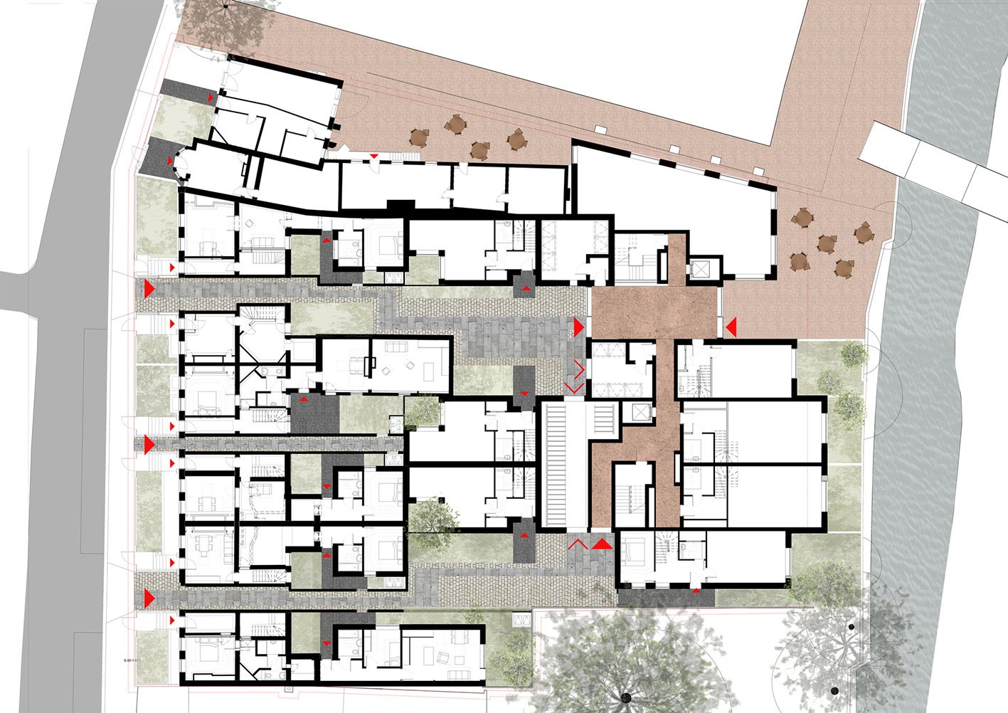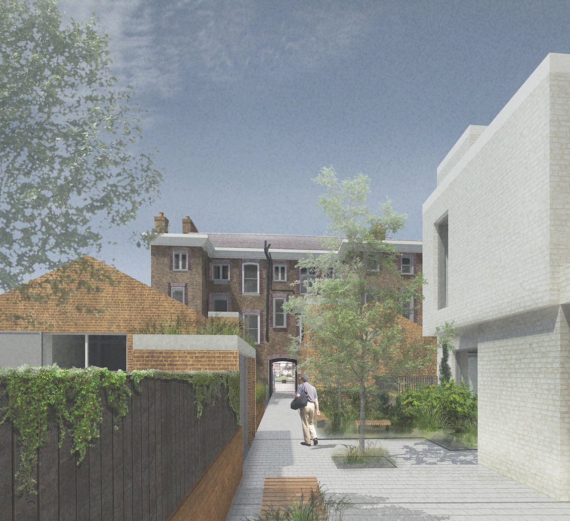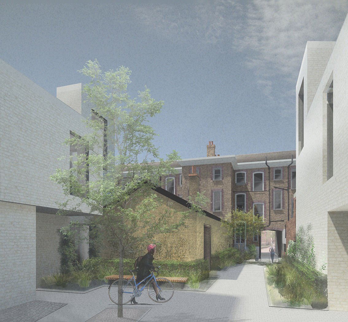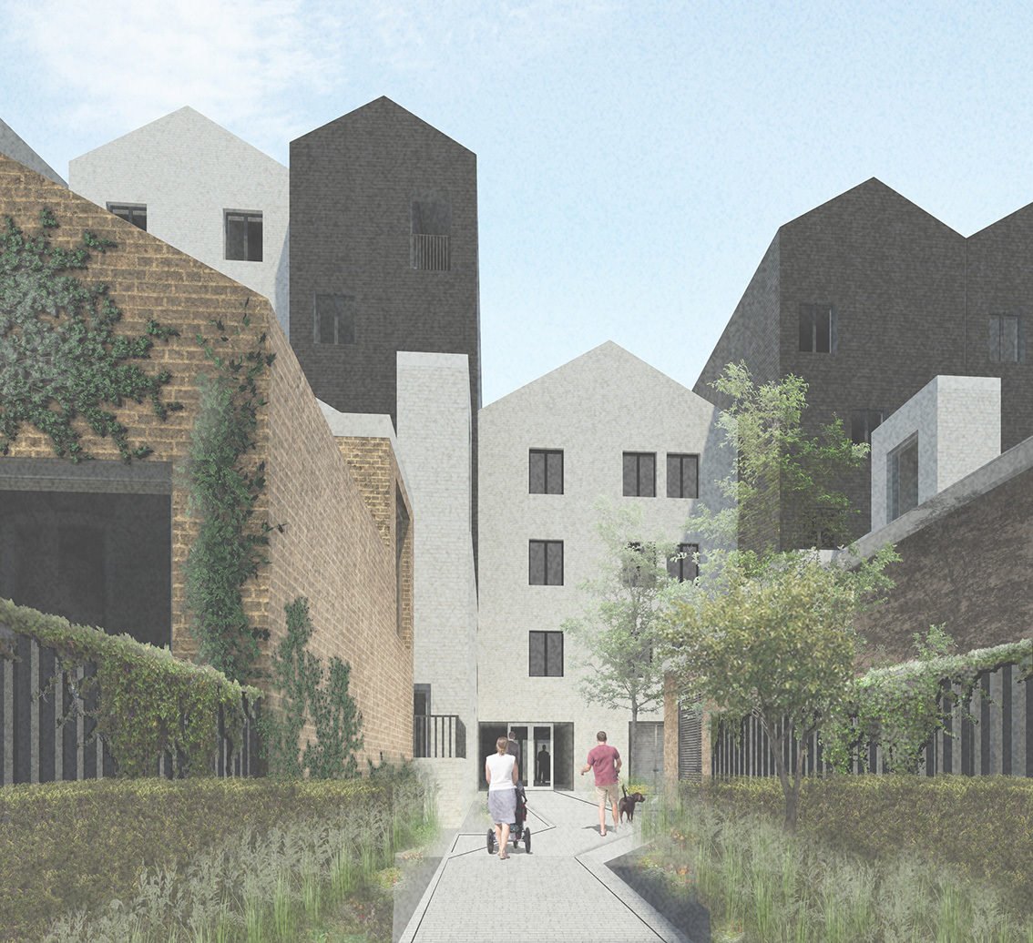 The terrace has three entrances leading to paved courtyard spaces that access the buildings on the river. These existing spaces had an intimate gritty character created by their materiality and scale. They inspired the figure ground for the new proposal which makes reference to the warehouse typology with varying roof pitches and a linear character relating to the original Burbage plots. By building around these spaces with small courtyard houses woven between the smaller scale historic fabric, a strong link between the old and the new development on the river is made. The division of public and private routes allowed the public route on the eastern boundary to accommodate live/work dwellings for artists and a connection to the river and the rest of the RAM brewery development.