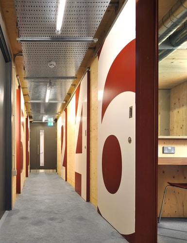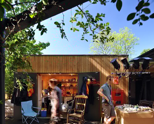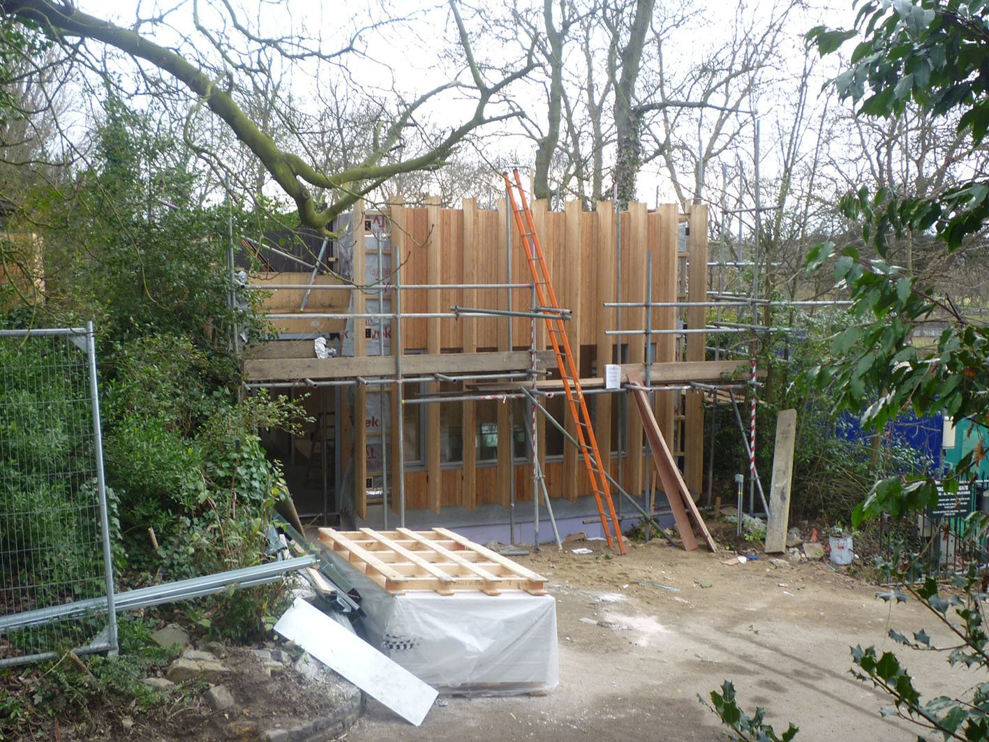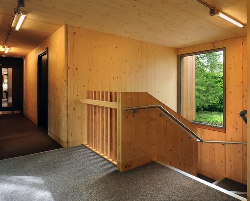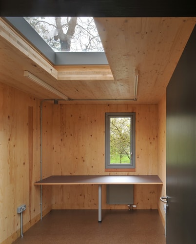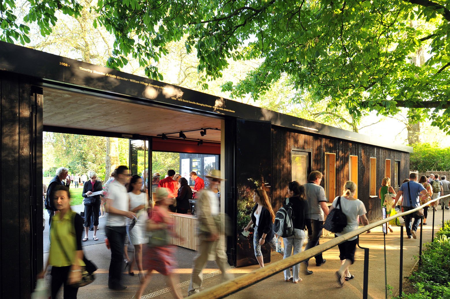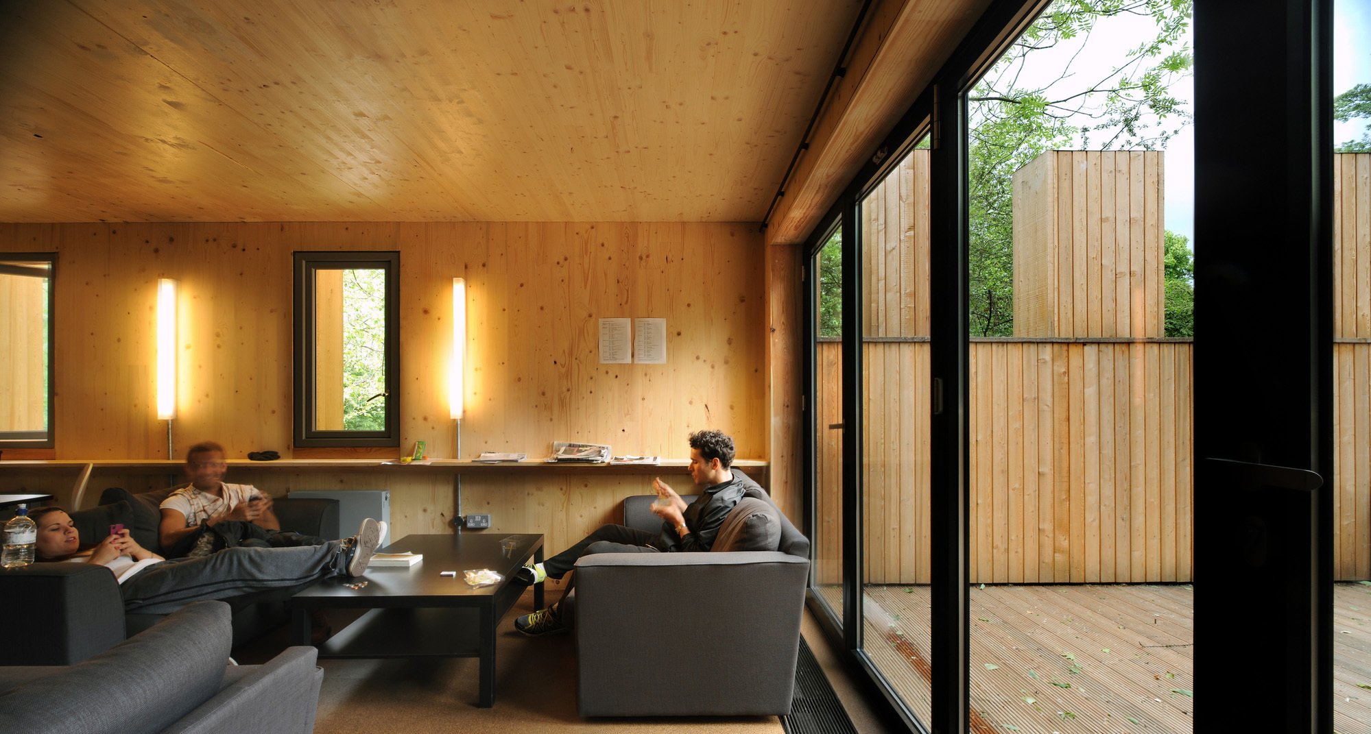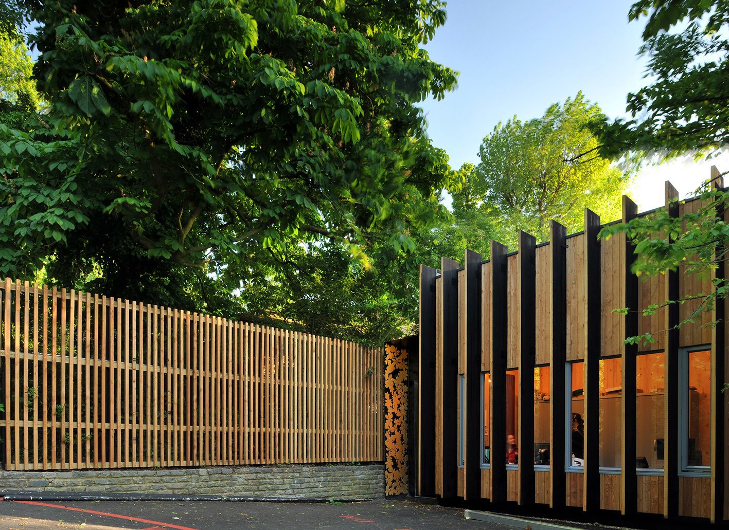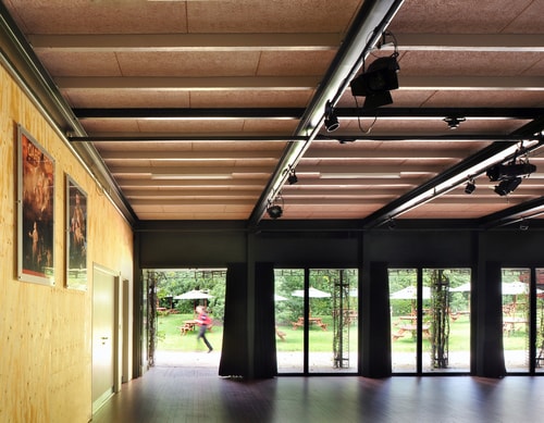 A second phase has added new offices and back of house facilities amongst the trees and a new box office and entrance building, enabling the organisation to remain resident on the site throughout the year for the first time. The new buildings are made of prefabricated timber panels for clean, fast construction and low carbon use.