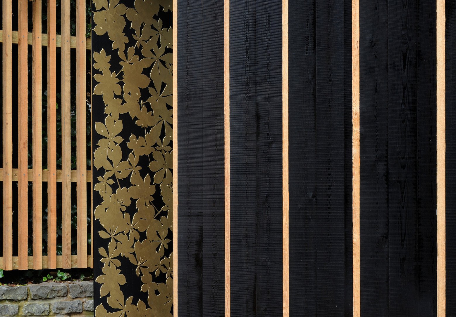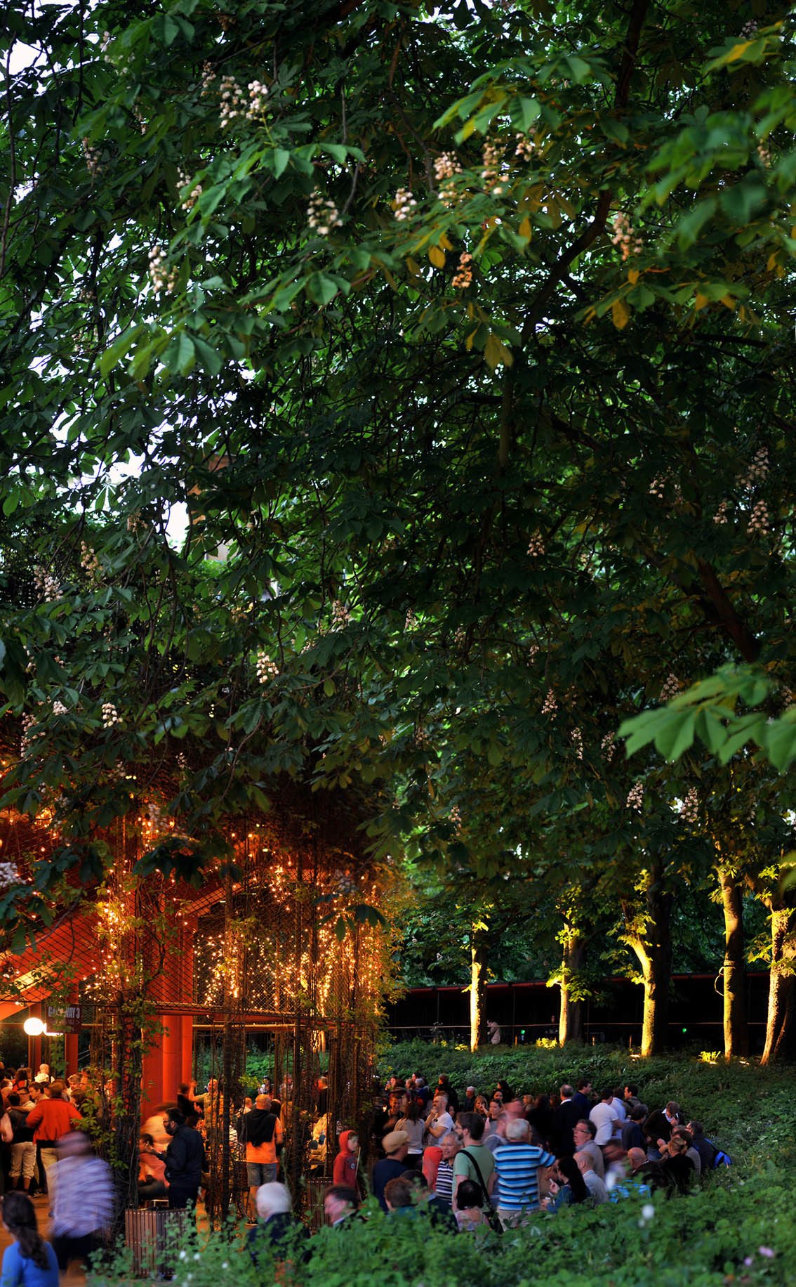 Working with landscape architect Camlin Lonsdale, the first phase of work reconfigured the foyer and front of house areas to create picnic lawns, a new studio for rehearsal, performance, events and catering, sheltered seating areas and a long, covered bar amongst the mature Horse Chestnut trees. A language of planted trellises and woven hazel façades was used to merge architecture and natural landscape into a single, seamless environment.