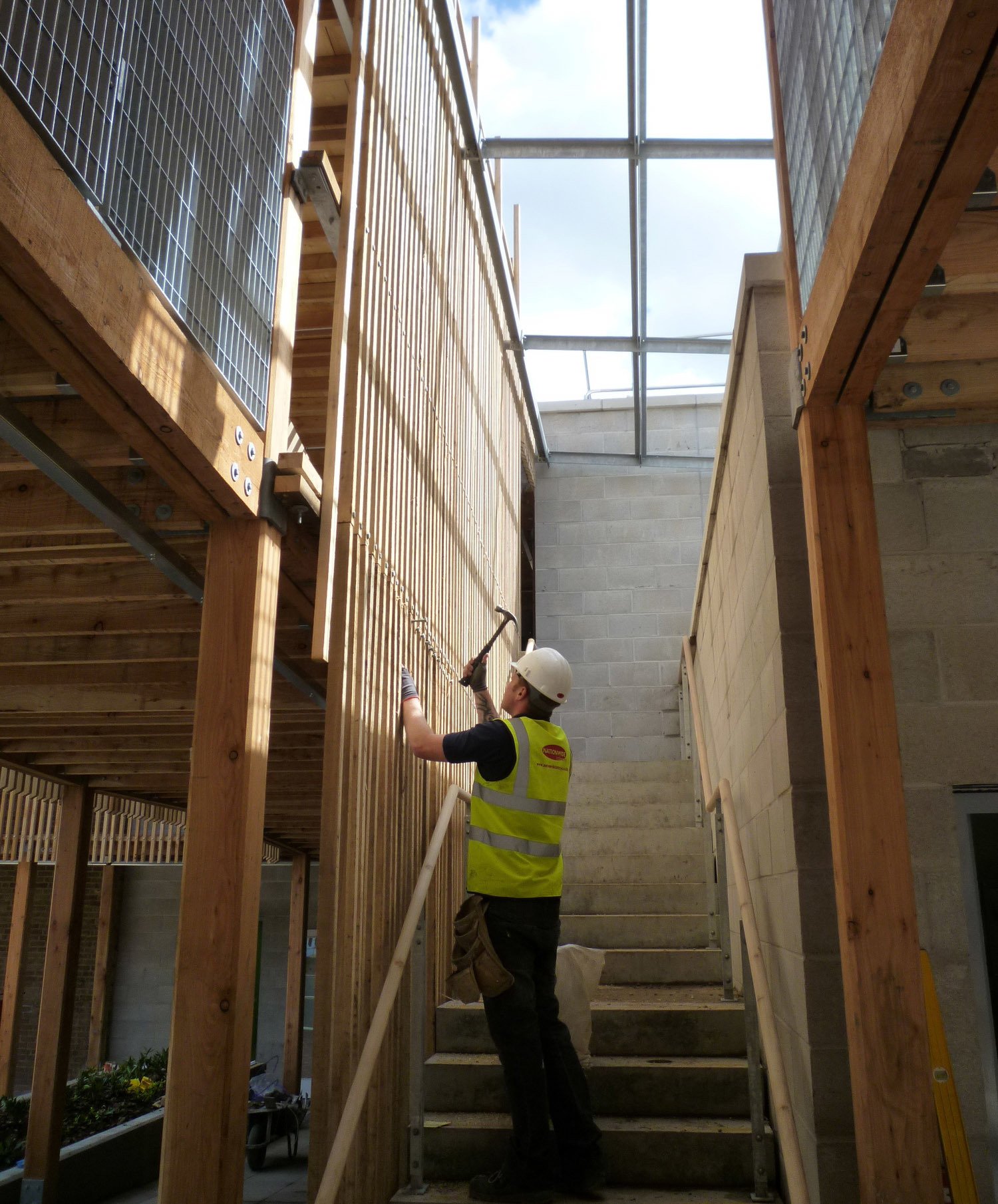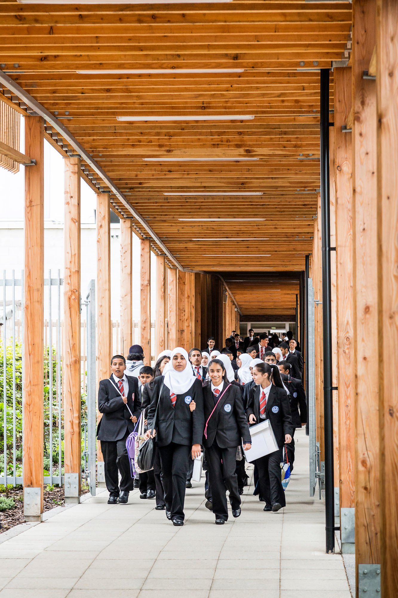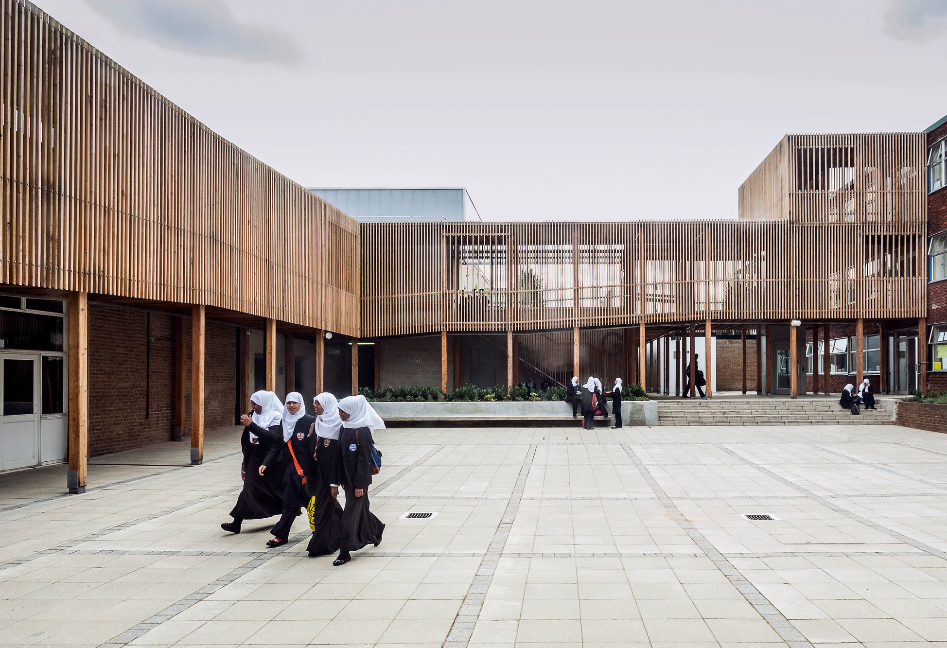 The new interventions create a strong identity for the school, distinct from the existing fabric, yet carefully integrated to unify the whole campus. The choice of timber is multi-layered: it provides an attractive, robust, maintenance free enclosure, and its organic nature contrasts with the tough urbanity of the surrounding buildings, softening the existing campus to create a sheltered collegiate atmosphere.
