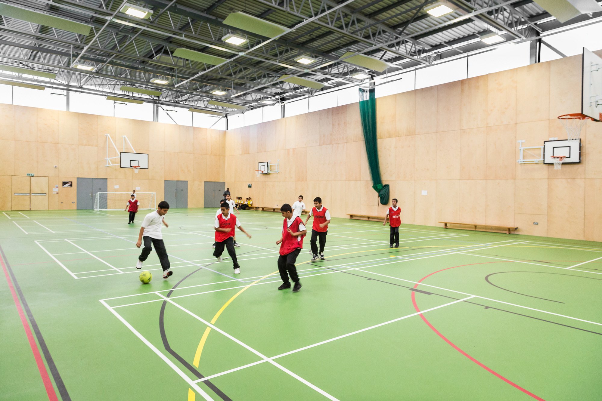 A new full-size, timber-lined sports hall is flooded with natural light from the tall translucent band of clerestory polycarbonate that runs around all four sides. Above the changing rooms a ‘market place’ has been created in collaboration with the artist Catherine Greig. A series of shops along the circulation route linking the courtyard to the playground, provide space for enterprising students to set up small businesses selling produce to their peers during school breaks.