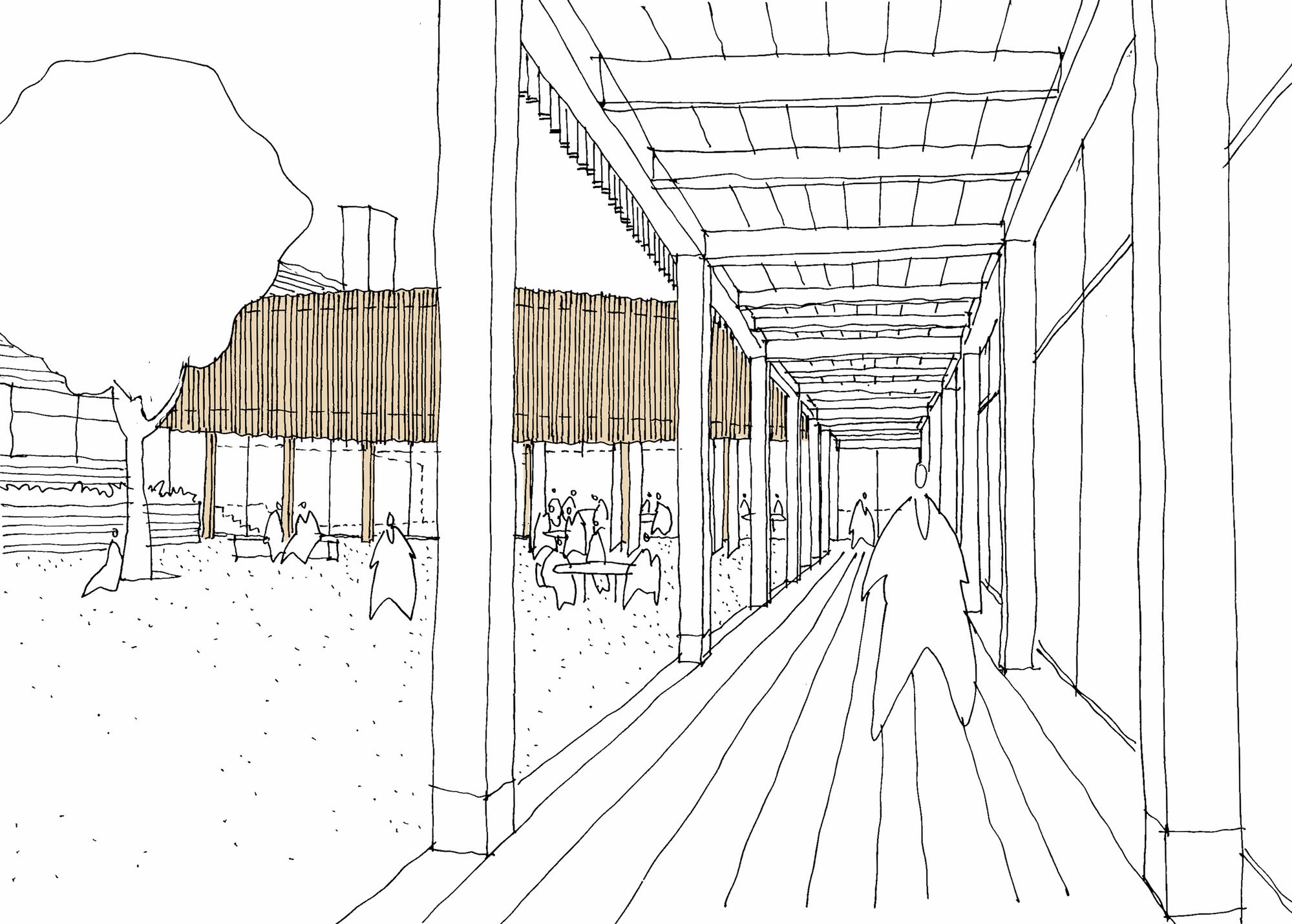 A larch clad covered walkway leads from the main entrance into the heart of the school’s campus and encloses three sides of a previously under-utilised courtyard. Visually uniting the disparate buildings and external spaces, the walkways give coherence to the school by establishing a clear hierarchy of routes, improving orientation and bringing focus back onto the sheltered central courtyard, a shared amenity that can be used to meet, reflect, study and dine.