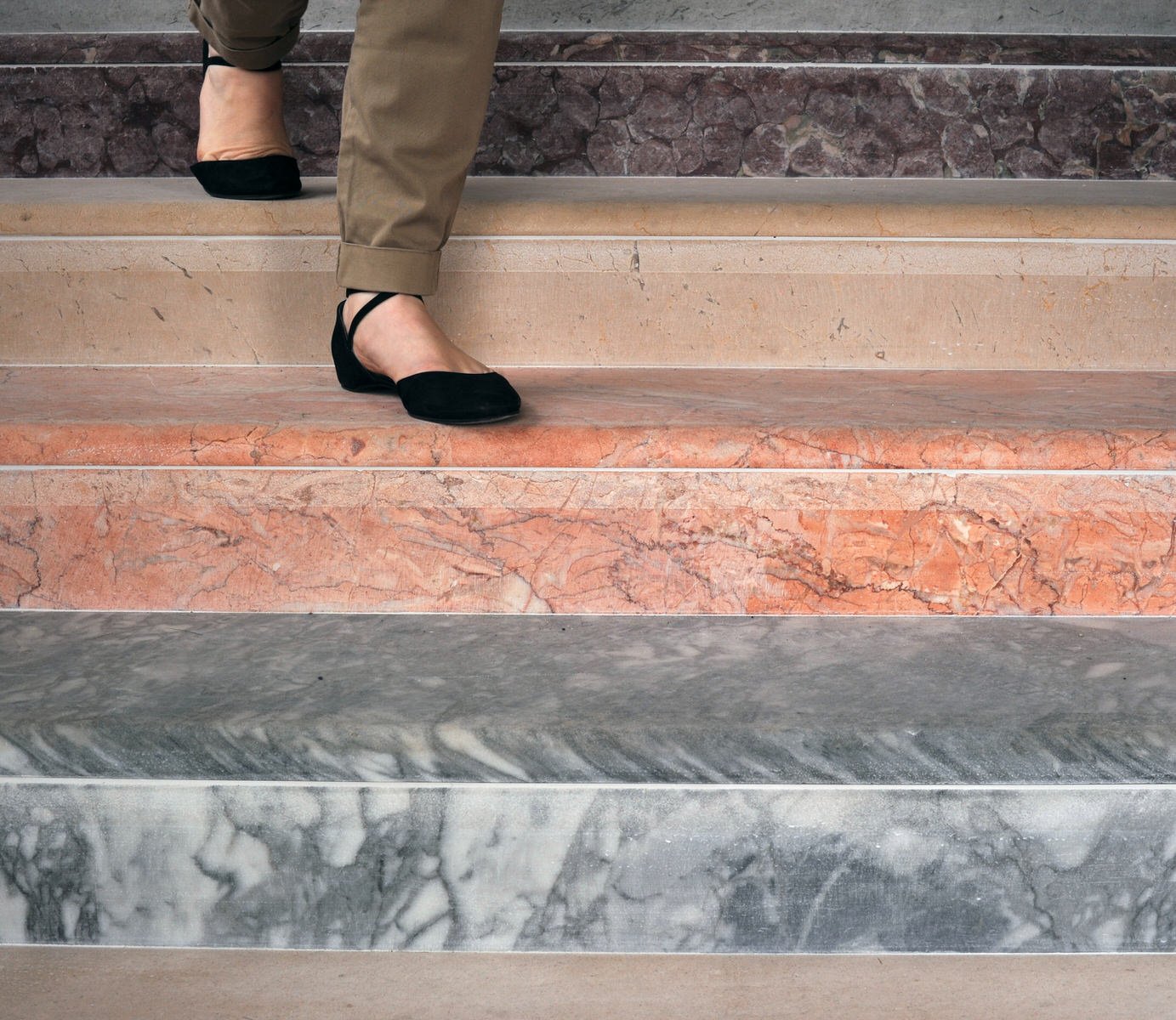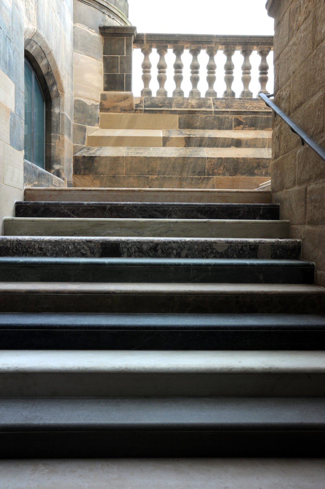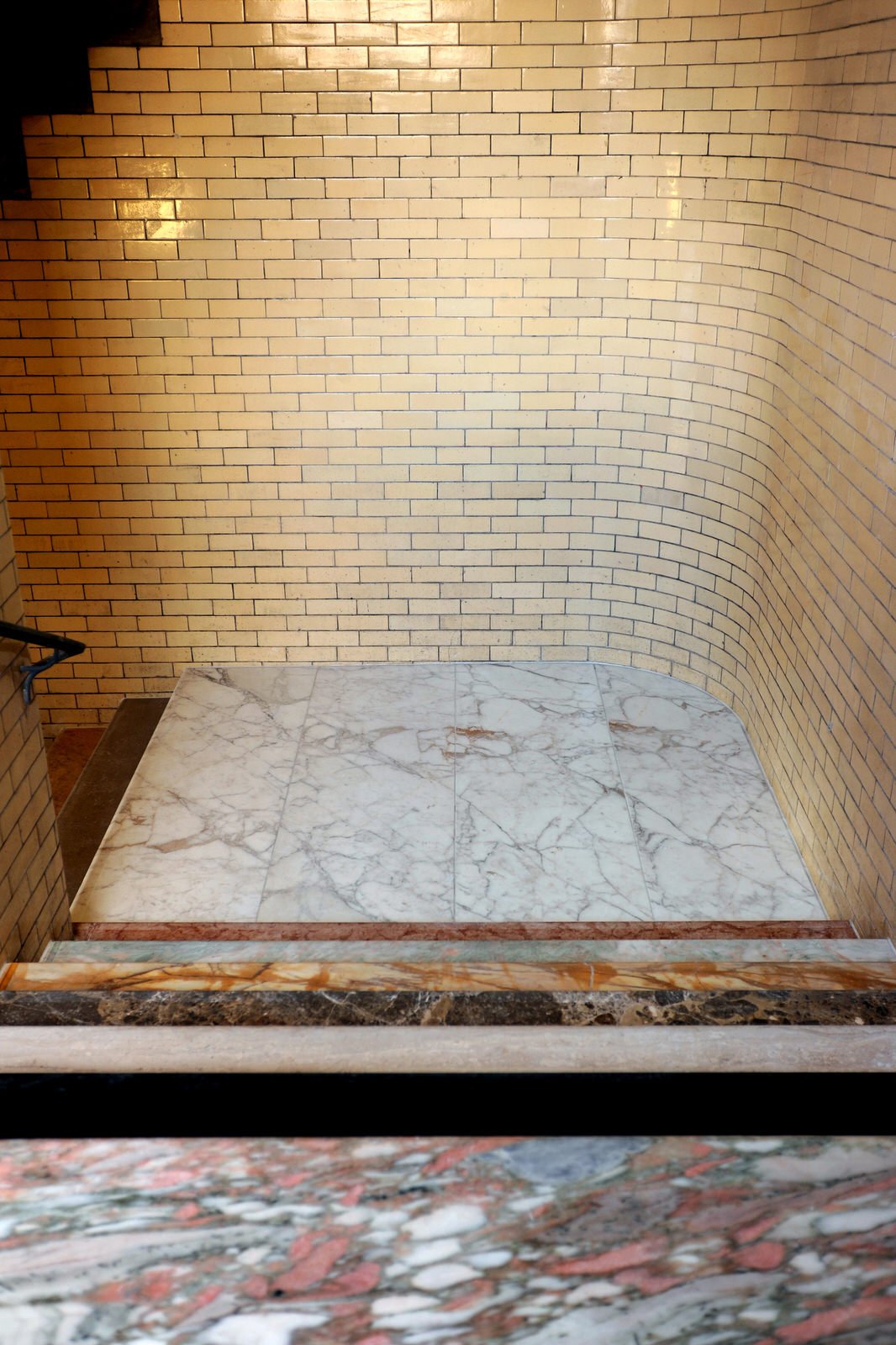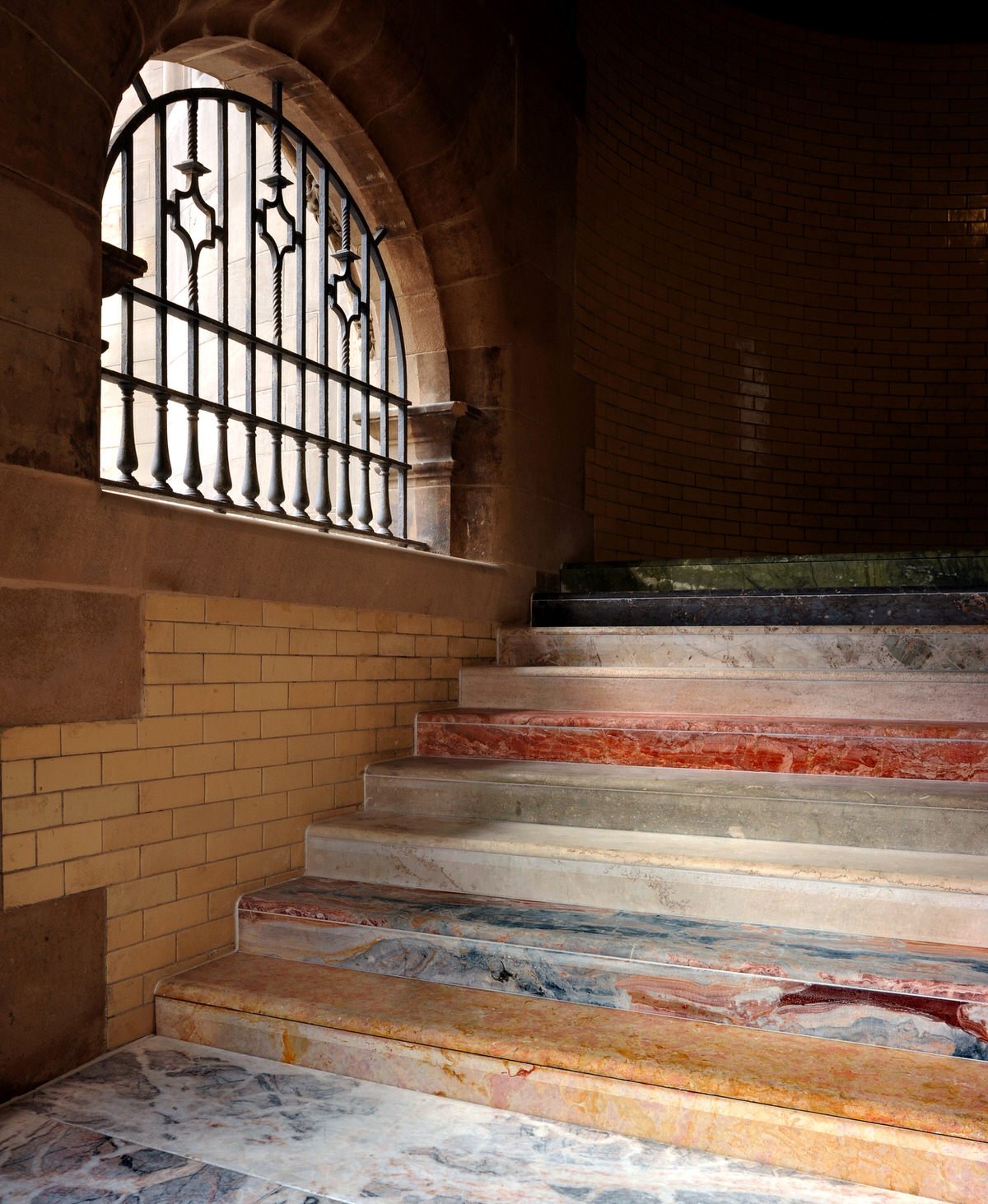 As part of the renovation The Fruitmarket Gallery commissioned a new public installation by Turner-Prize winning artist Martin Creed. Haworth Tompkins worked with local architect Chris Bowes to restore the stone tower and developed the design and implementation of the artwork proposal to re-surface the steps with different and contrasting marbles from all over the world.
