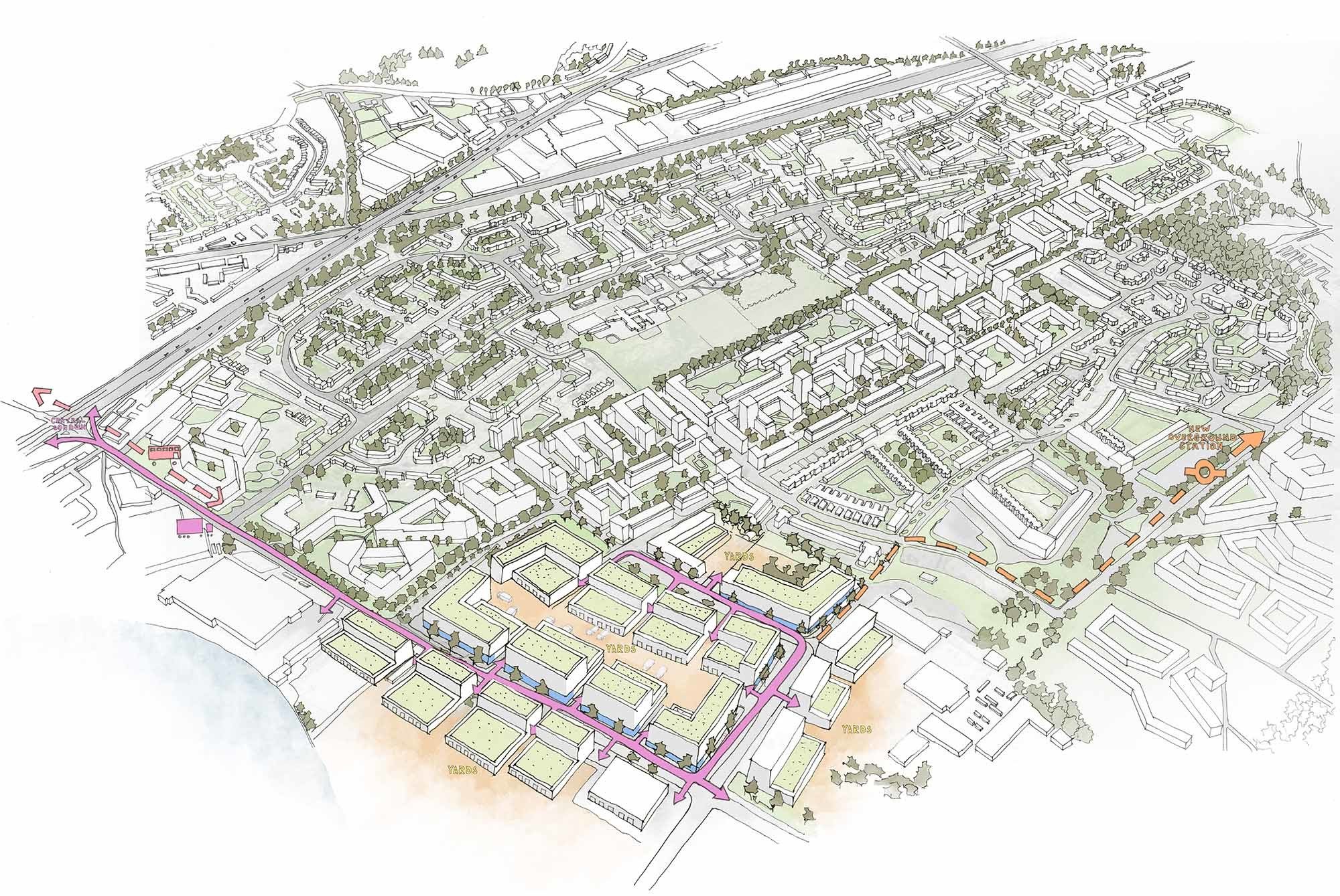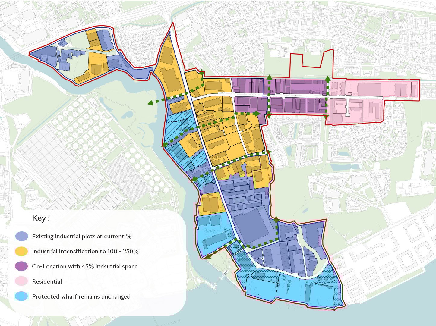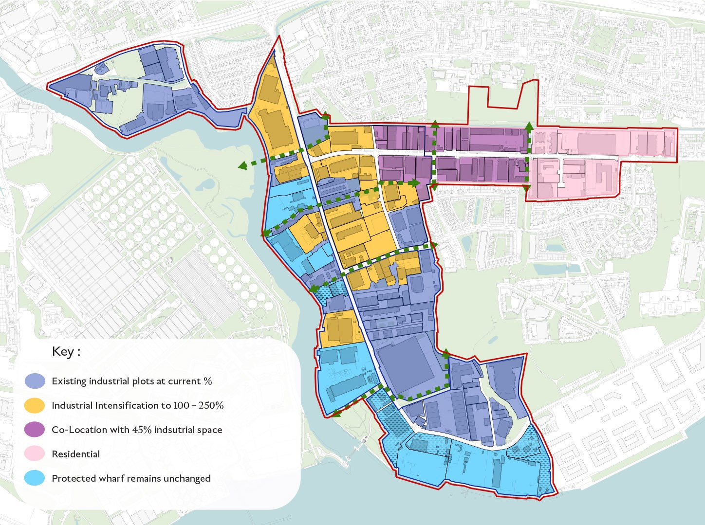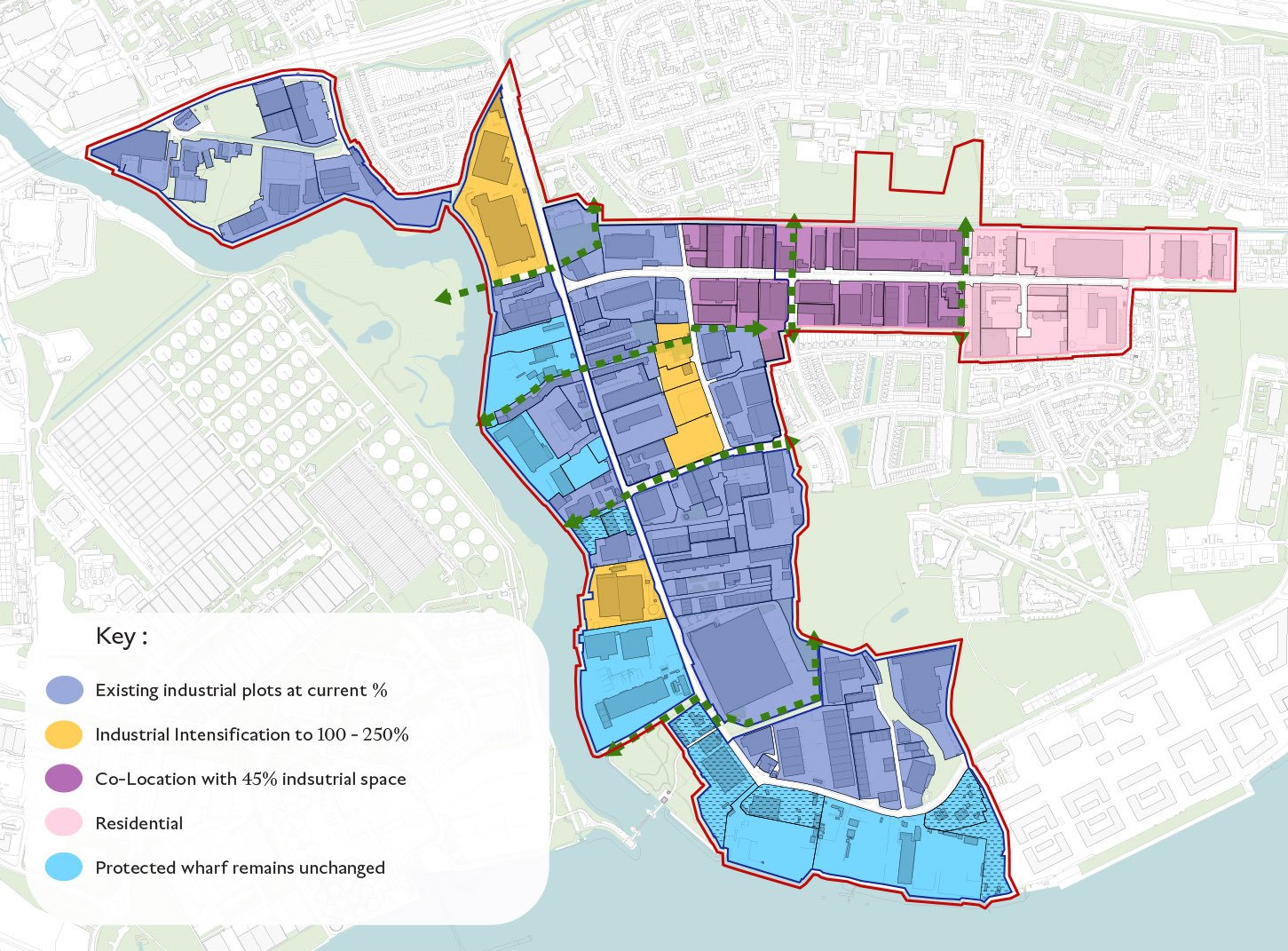 The intensification strategy for the area is proposed as a flexible, phased framework with an increasing amount of industrial floorspace being delivered incrementally as sites come forwards, across a 20-30 year period. Intensification is achieved through the development of plots in the centre of the site as modern, multistorey, industrial buildings with plot development ratios of 100-200%.