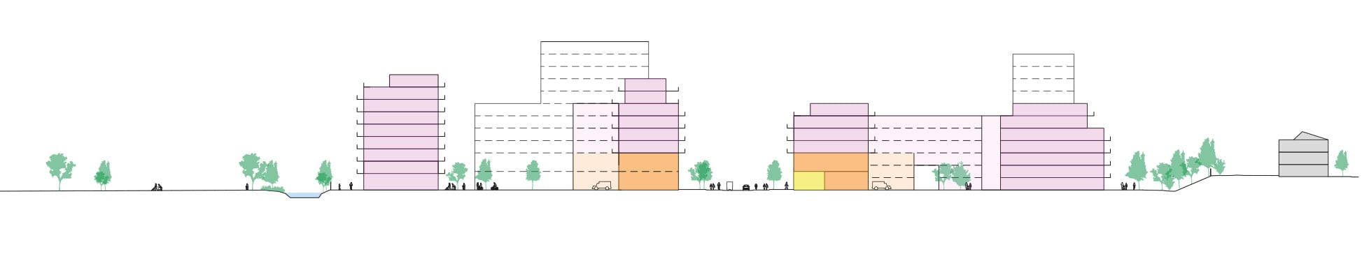 To develop the overall land zoning strategy which underpins the masterplan vision, while delivering the industrial space requirements for SIL land within the London Plan, we carried out quantitative floorspace modelling to assess different land zoning and intensification scenarios. The result is new masterplan zoning which seeks to intensify industrial uses within the centre of the site (shown in yellow) in order to release land for colocation and residential uses in the eastern part of the site, creating three distinct character areas along the length of Thames Road. The east end of the road is rezoned for residential and community uses, the centre is designated as a transitional colocation zone with a mixture of residential, community and cleaner industrial uses, and the west end houses intensified, multistorey industrial space.