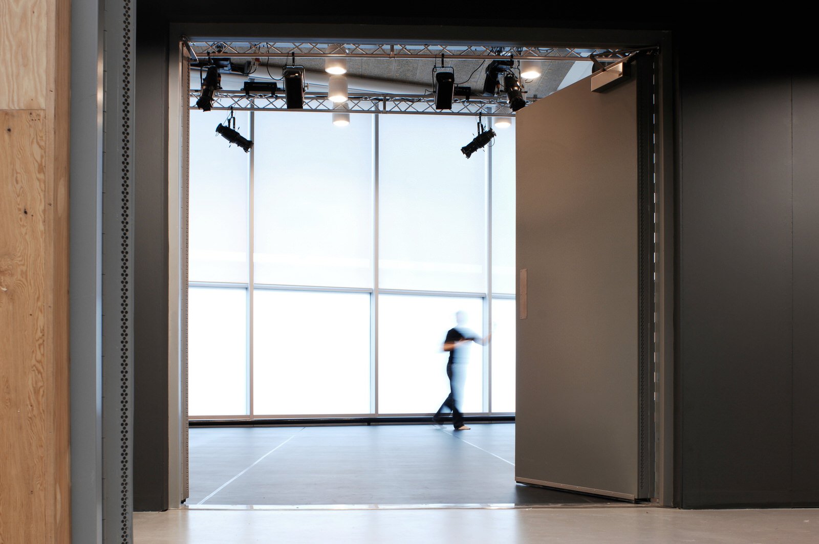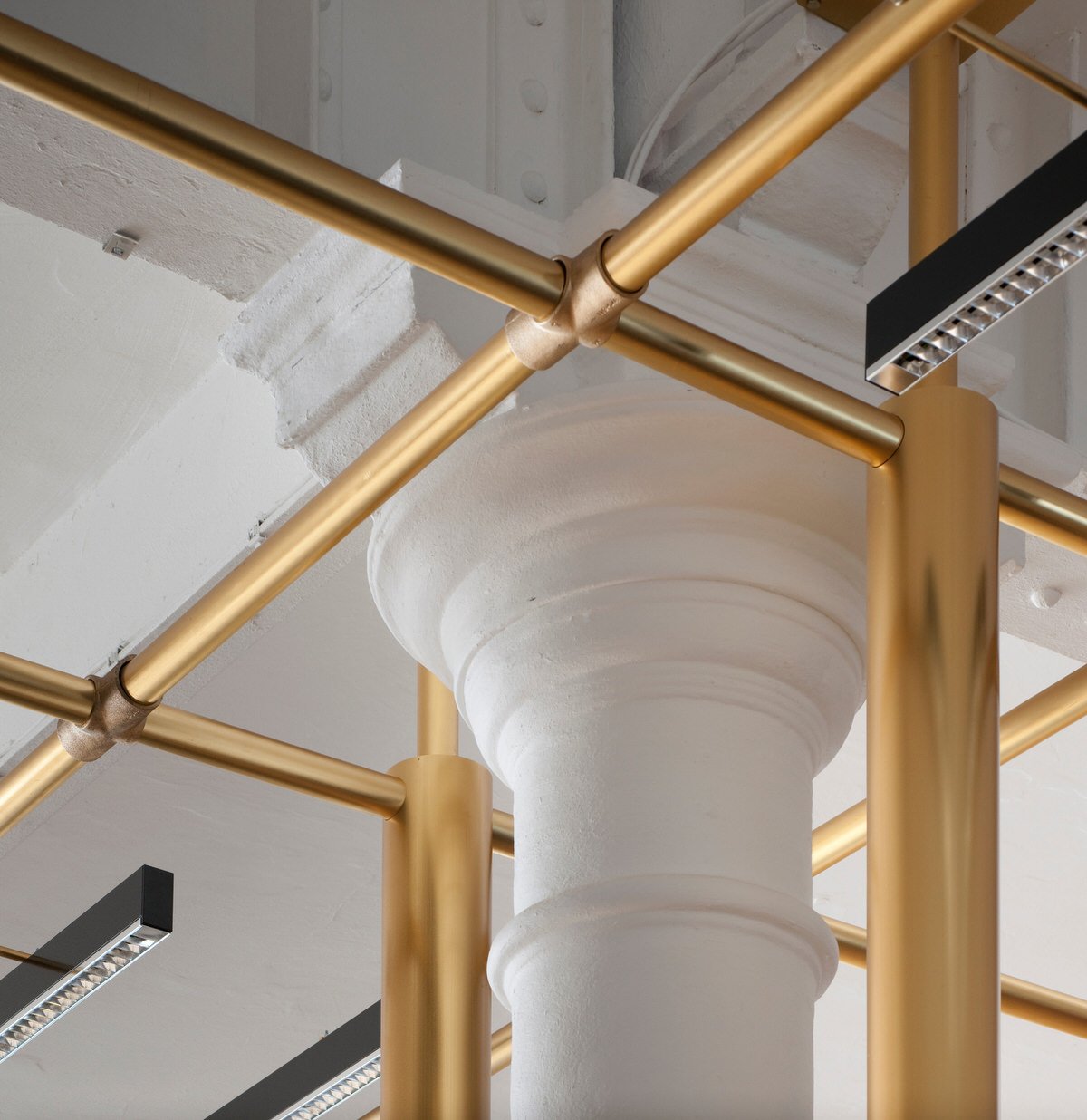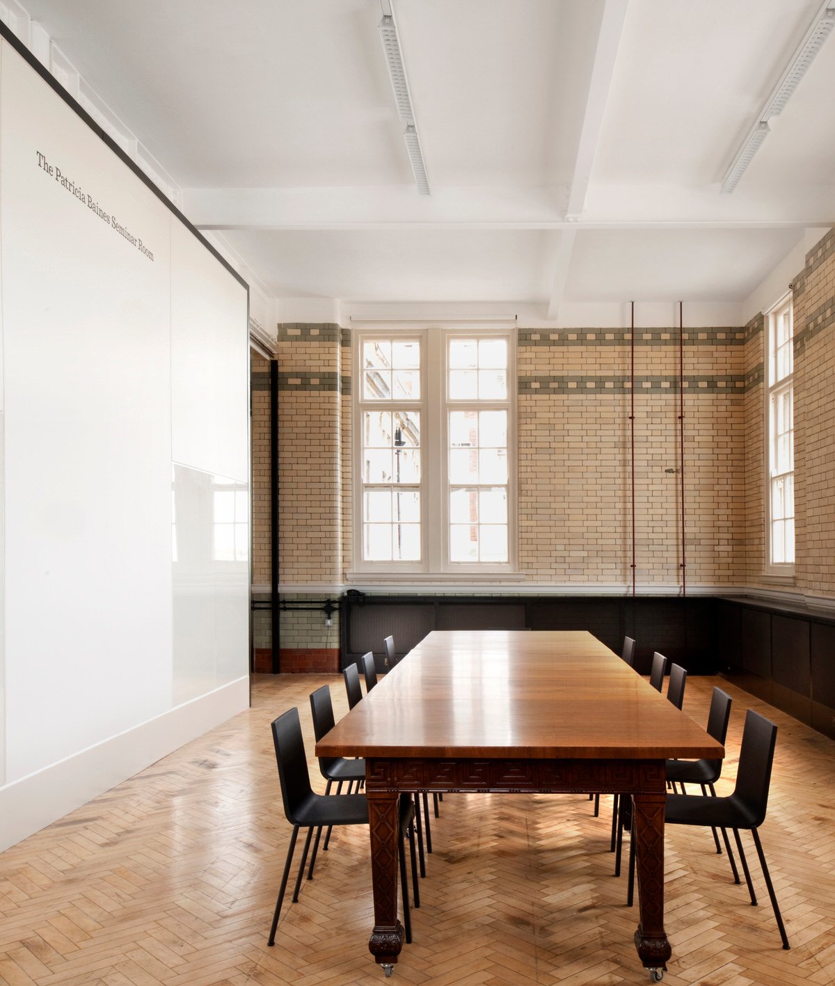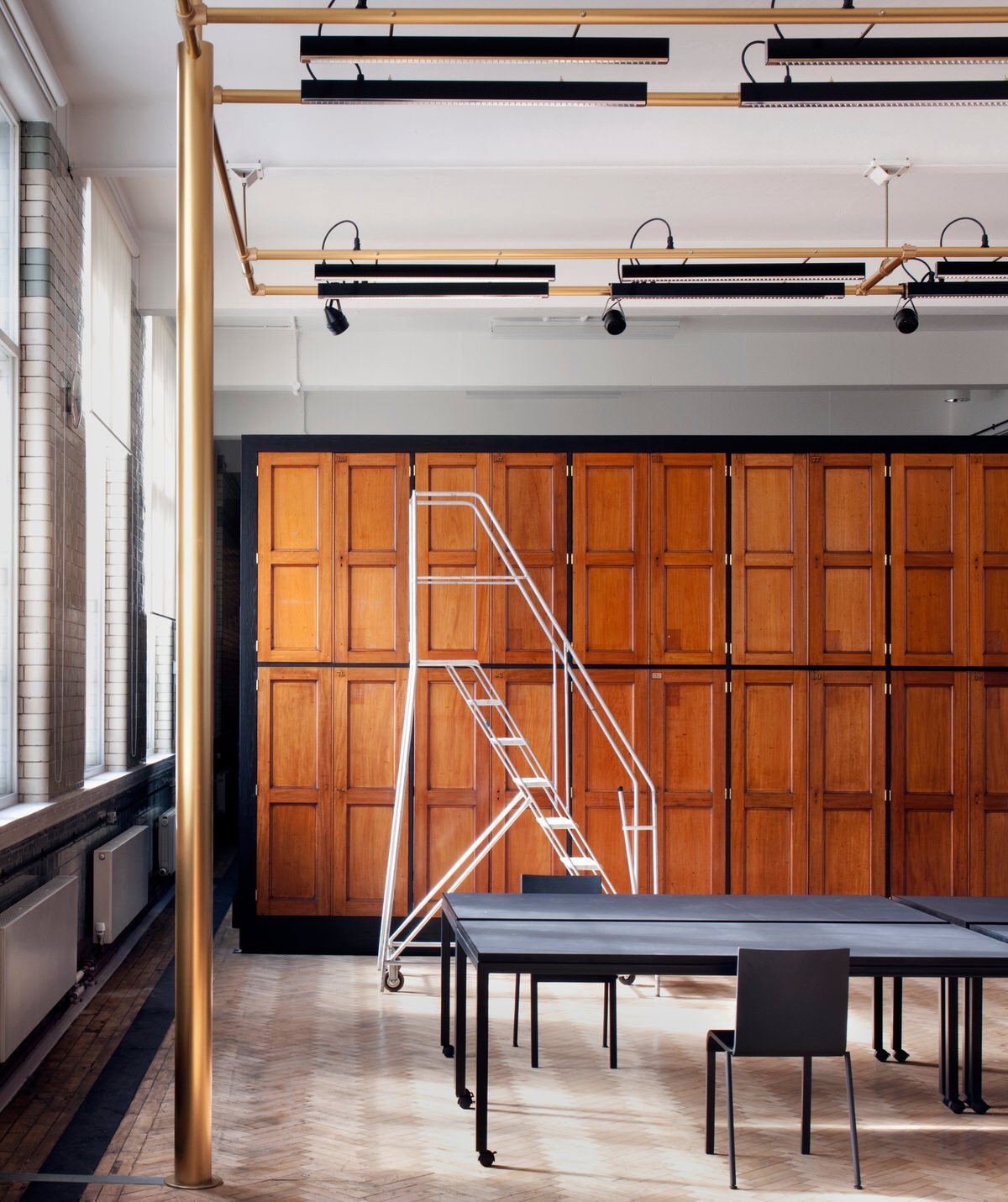 The public study and seminar spaces make the most of the building's generous proportions, with new interventions designed to complement and reinforce the character of the existing building. Embedded within the largest store, the new public study room offers a relaxed and peaceful environment for visitors to view even the largest textiles first hand, with staff and reference books available for consultation. A gold metal lighting and power rig defines the working area of the study room, which is separated from the Seminar space by full height glazed screens. A new conservation suite, with state of the art equipment, is located on the floor above.