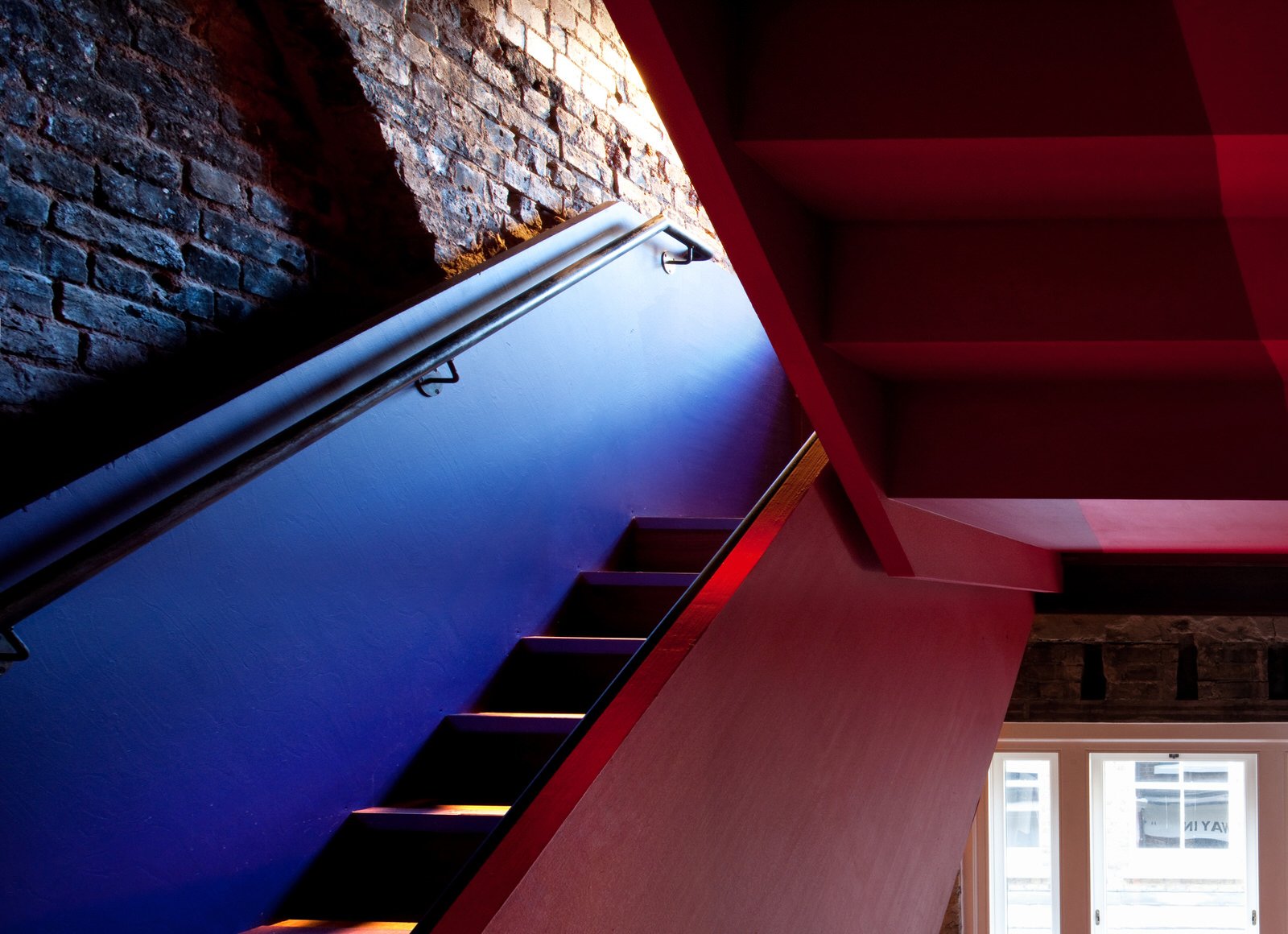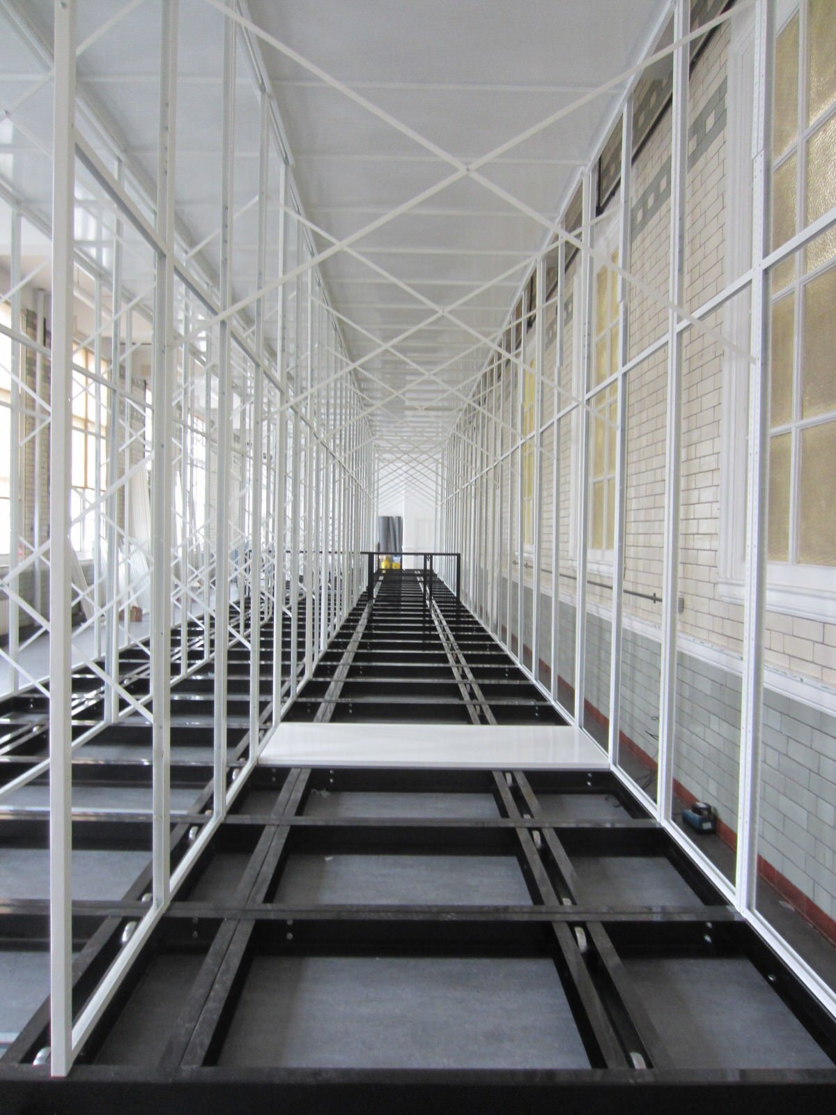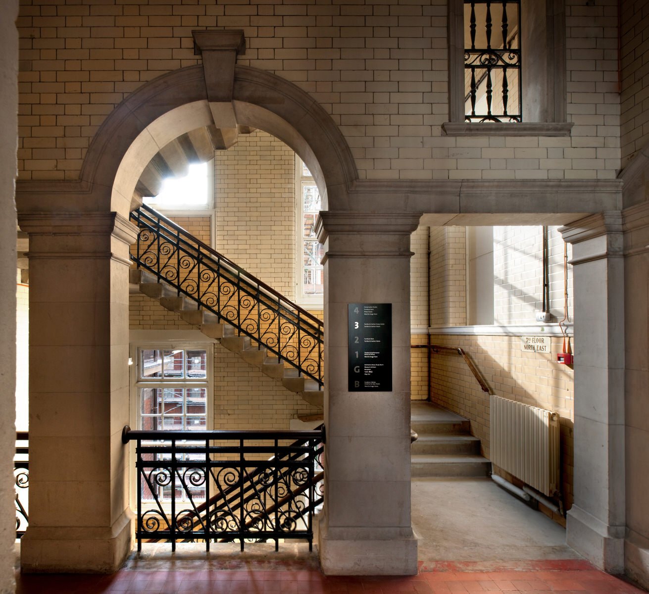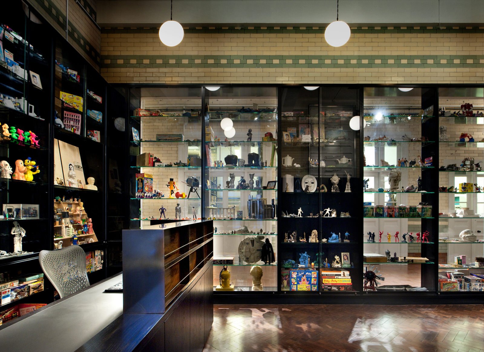 A new accessible entrance is provided which re-instates the formal entrance from Blythe Road to create a welcoming street presence and a new reception lined by floor to ceiling glass cabinets houses the Eduardo Paolozzi ‘Kit-Kat’ Collection of toys and robots, and changing displays from the study collections.