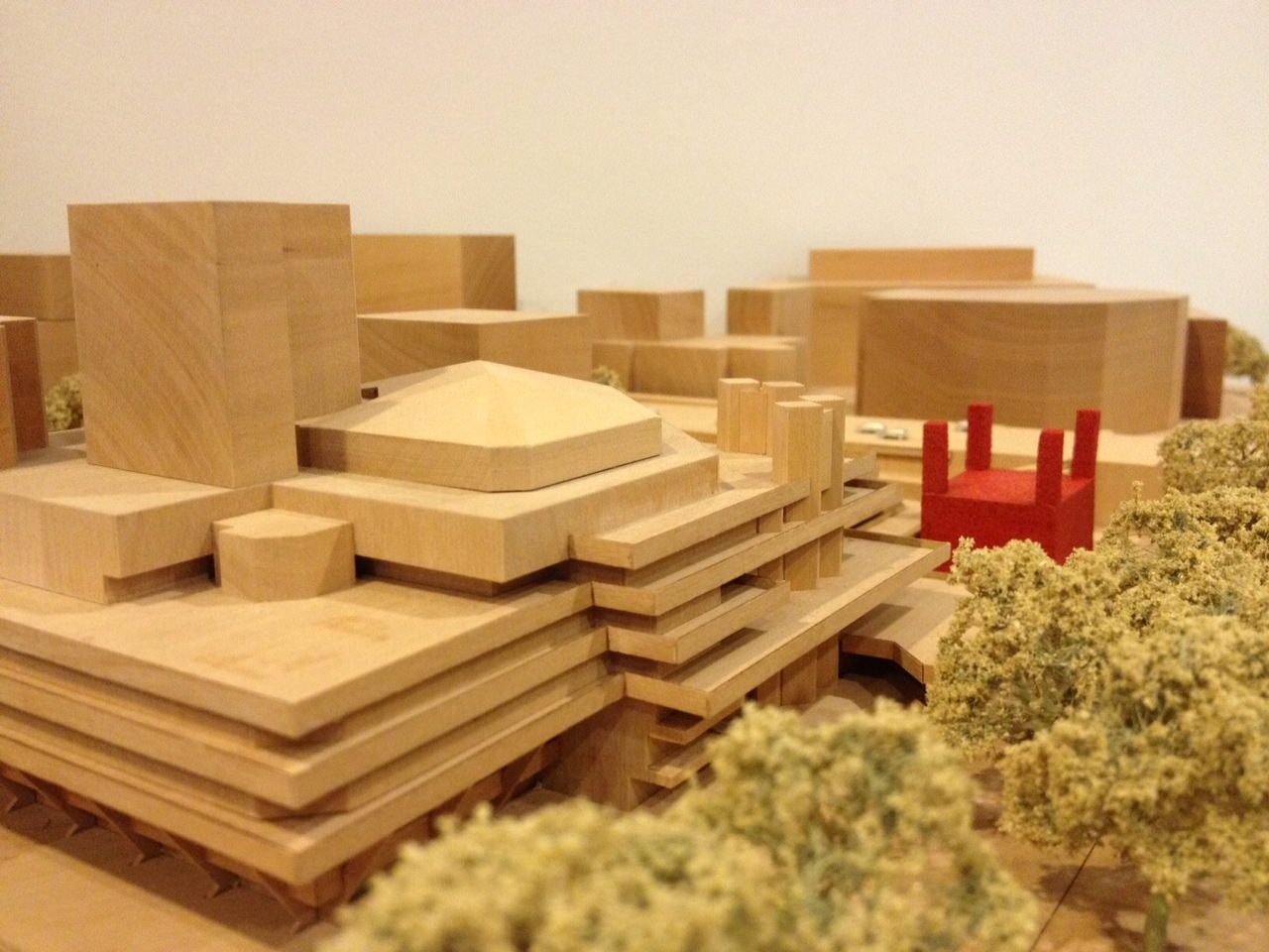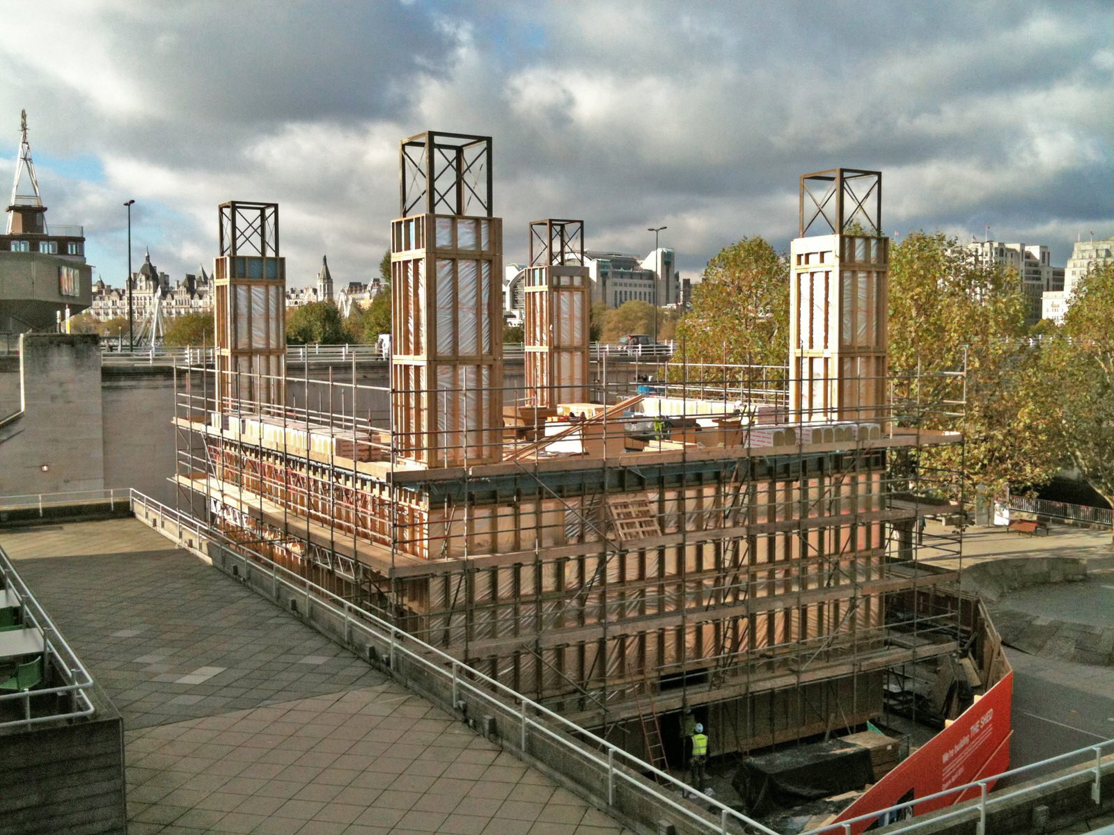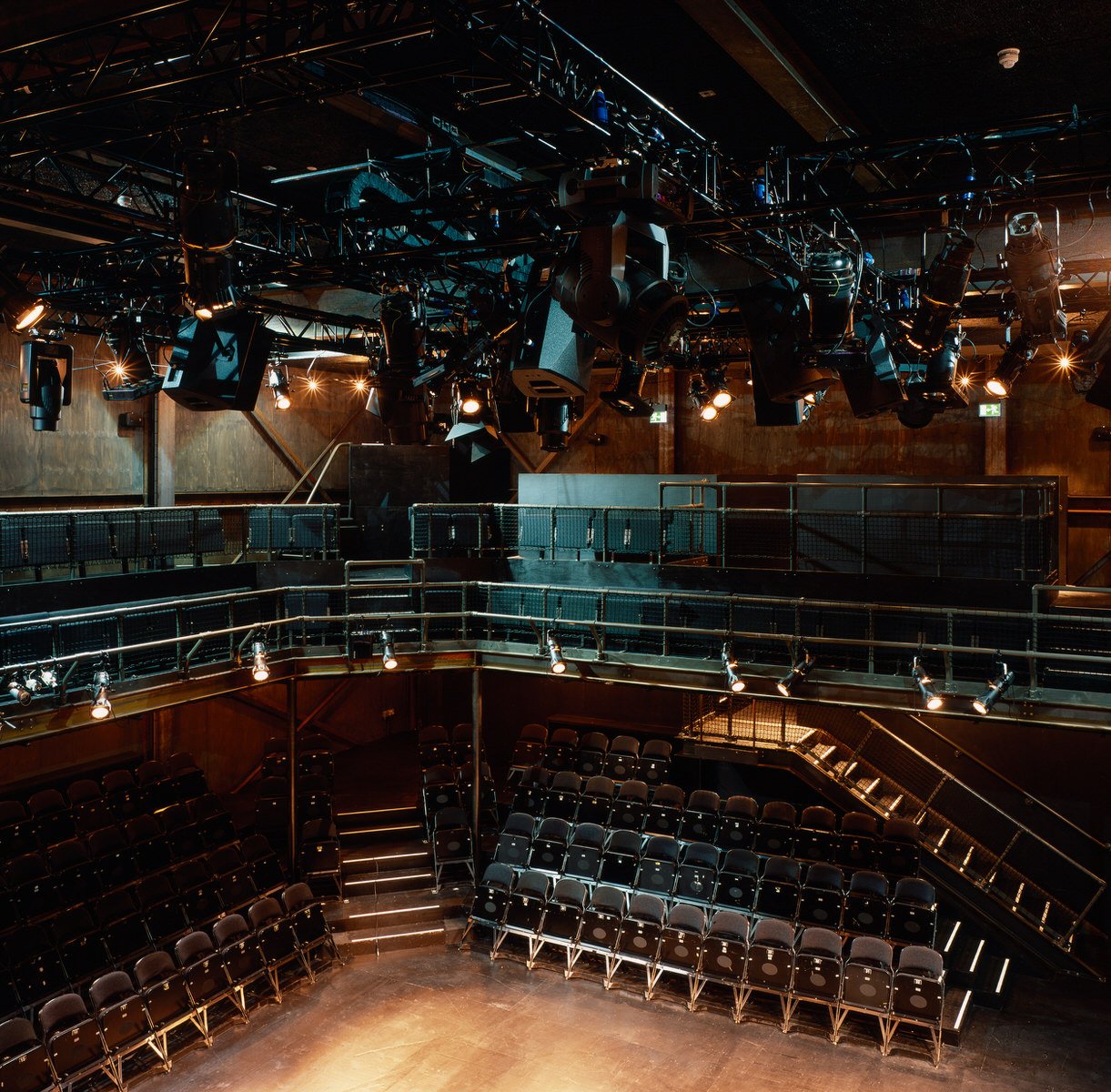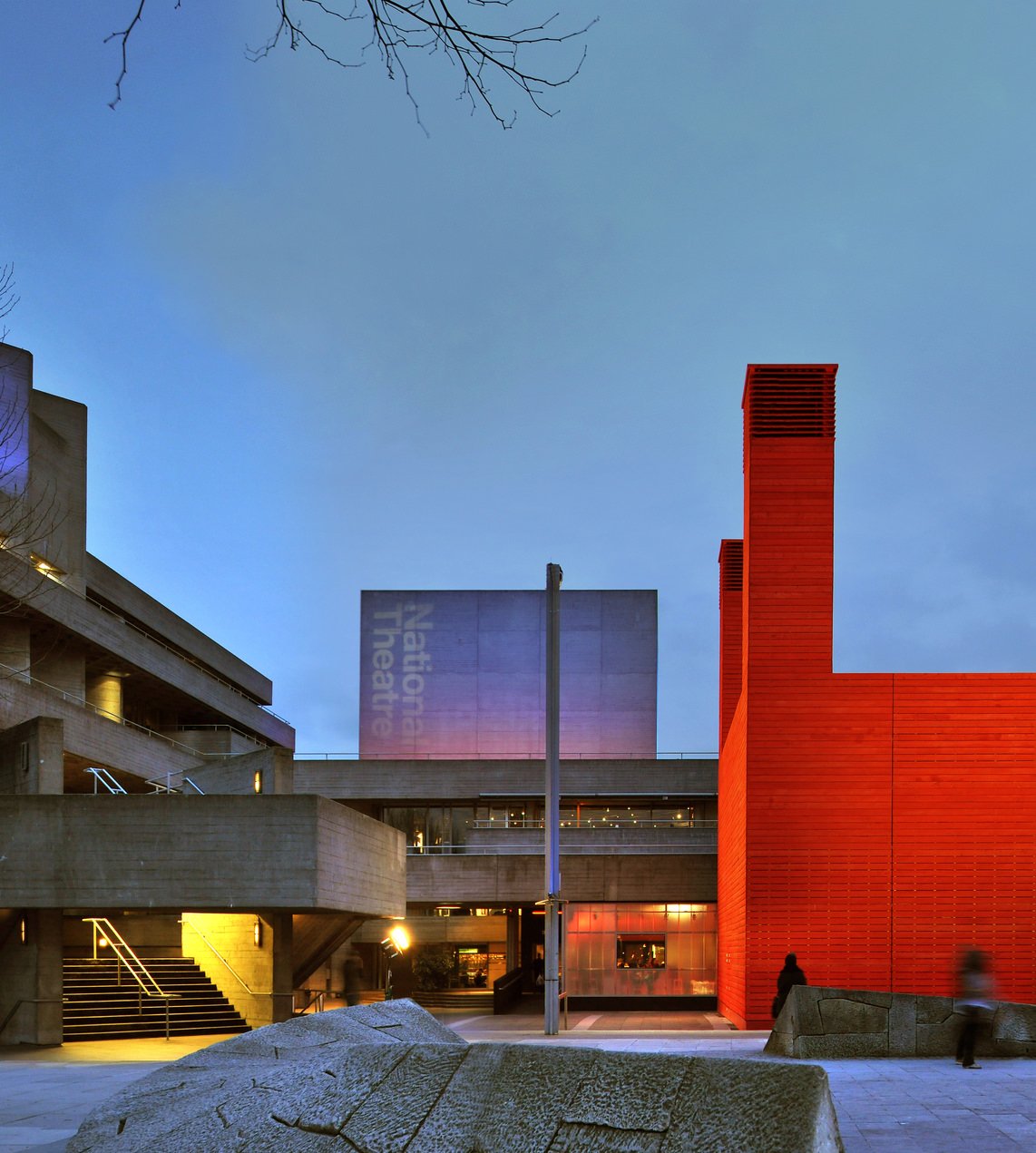 The simple, archetypal timber form housed an intimate, galleried auditorium made of raw steel and stained plywood, seating between 225 in thrust configuration and 275 in the round. The rough sawn timber cladding referred to the National Theatre’s iconic board-marked concrete, the modelling of the auditorium and its four natural ventilation towers complementing the bold geometries of the National Theatre itself.